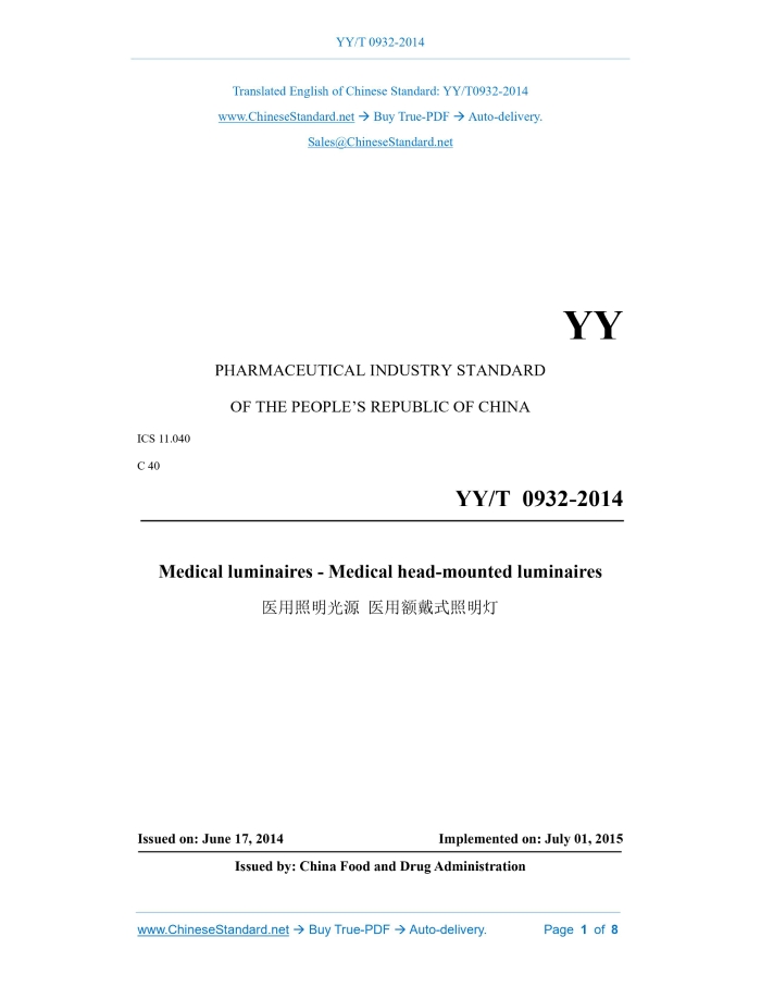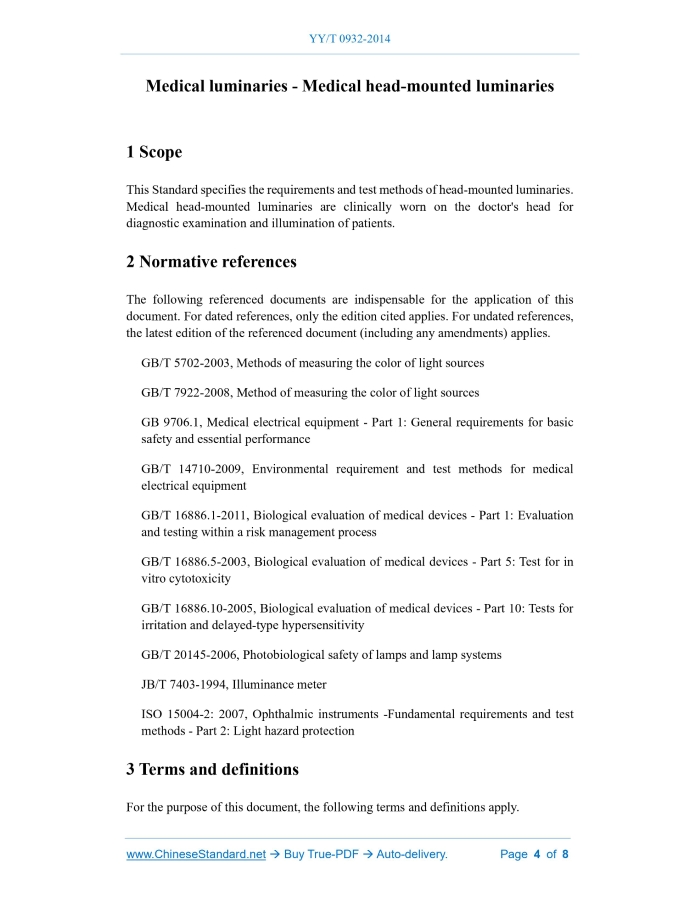 YY/T 0932-2014: Medical luminaries. Medical head-mounted luminaires Delivery: 9 seconds. True-PDF full-copy in English & invoice will be downloaded + auto-delivered via email. See step-by-step procedure Status: Valid