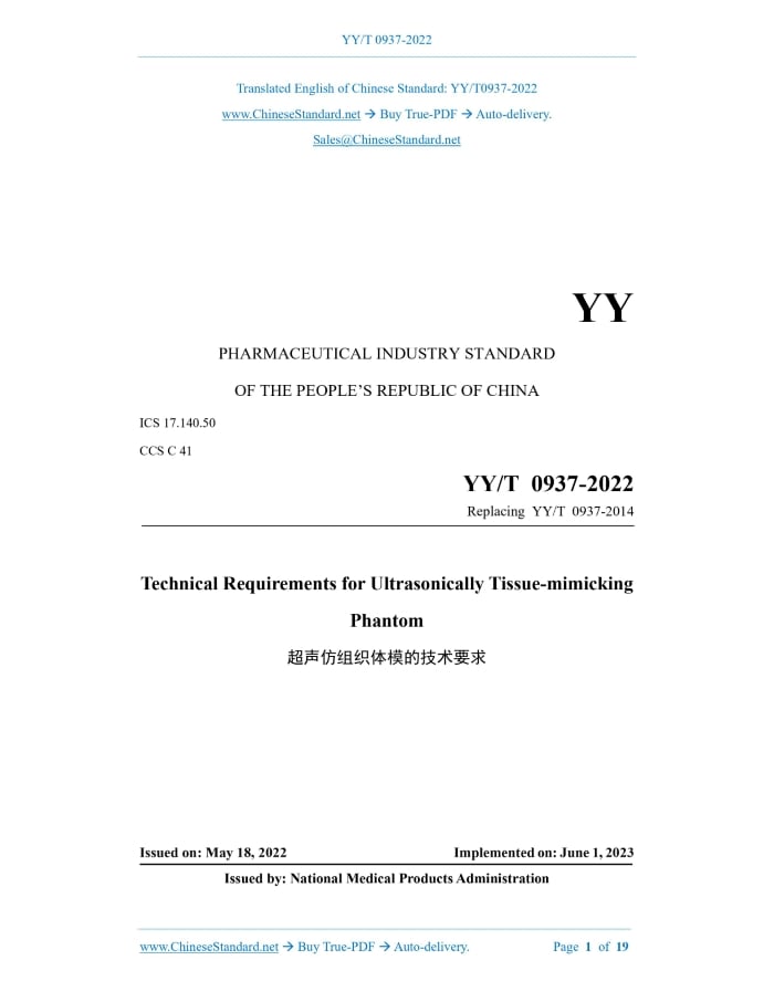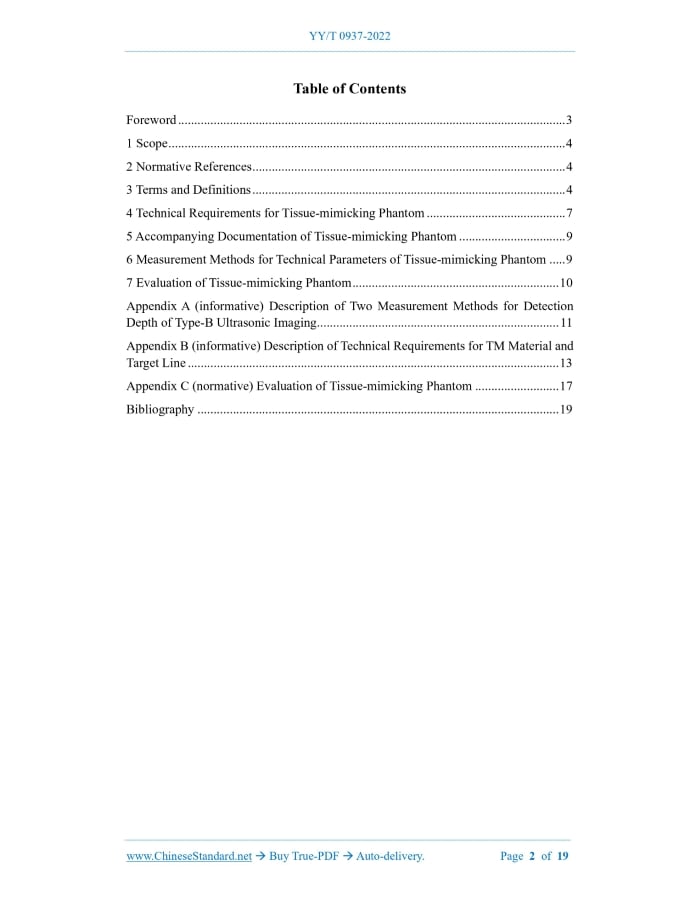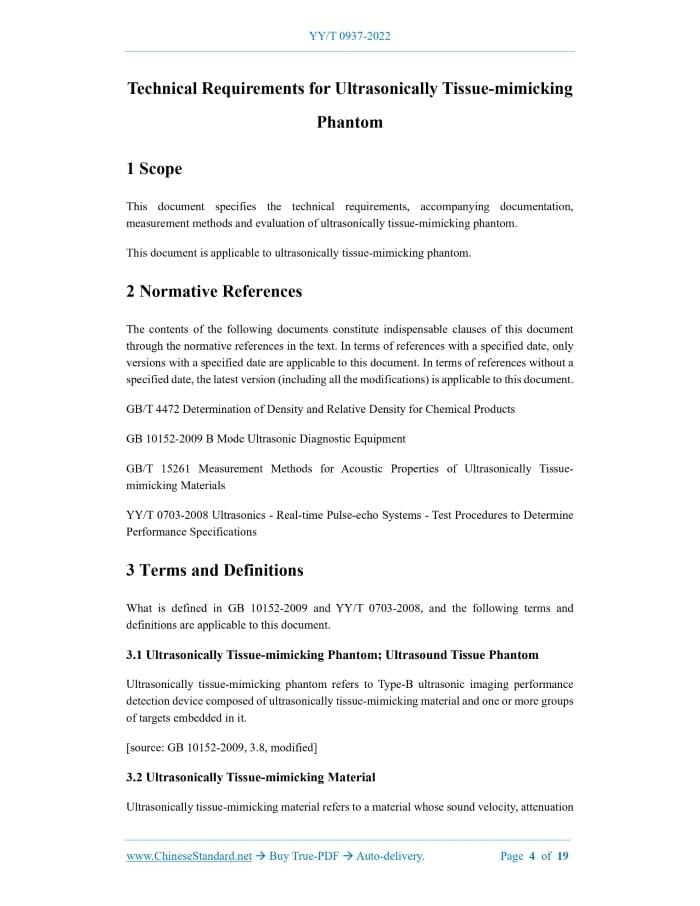 YY/T 0937-2022: Technical requirements for ultrasonically tissue-mimicking phantom---This is an excerpt. Full copy of true-PDF in English version (including equations, symbols, images, flow-chart, tables, and figures etc.), auto-downloaded/delivered in 9 seconds, can be purchased online: https://www.ChineseStandard.net/PDF.aspx/YYT0937-2022YY PHARMACEUTICAL INDUSTRY STANDARD OF THE PEOPLE’S REPUBLIC OF CHINA ICS 17.140.50 CCS C 41 Replacing YY/T 0937-2014 Technical Requirements for Ultrasonically Tissue-mimicking Phantom ISSUED ON: MAY 18, 2022 IMPLEMENTED ON: JUNE 1, 2023 Issued by: National Medical Products Administration Table of ContentsForeword ... 3 1 Scope ... 4 2 Normative References ... 4 3 Terms and Definitions ... 4 4 Technical Requirements for Tissue-mimicking Phantom ... 7 5 Accompanying Documentation of Tissue-mimicking Phantom ... 9 6 Measurement Methods for Technical Parameters of Tissue-mimicking Phantom ... 9 7 Evaluation of Tissue-mimicking Phantom ... 10 Appendix A (informative) Description of Two Measurement Methods for Detection Depth of Type-B Ultrasonic Imaging ... 11 Appendix B (informative) Description of Technical Requirements for TM Material and Target Line ... 13 Appendix C (normative) Evaluation of Tissue-mimicking Phantom ... 17 Bibliography ... 19 Technical Requirements for Ultrasonically Tissue-mimicking Phantom1 ScopeThis document specifies the technical requirements, accompanying documentation, measurement methods and evaluation of ultrasonically tissue-mimicking phantom. This document is applicable to ultrasonically tissue-mimicking phantom.2 Normative ReferencesThe contents of the following documents constitute indispensable clauses of this document through the normative references in the text. In terms of references with a specified date, only versions with a specified date are applicable to this document. In terms of references without a specified date, the latest version (including all the modifications) is applicable to this document. GB/T 4472 Determination of Density and Relative Density for Chemical Products GB 10152-2009 B Mode Ultrasonic Diagnostic Equipment GB/T 15261 Measurement Methods for Acoustic Properties of Ultrasonically Tissue- mimicking Materials YY/T 0703-2008 Ultrasonics - Real-time Pulse-echo Systems - Test Procedures to Determine Performance Specifications3 Terms and DefinitionsWhat is defined in GB 10152-2009 and YY/T 0703-2008, and the following terms and definitions are applicable to this document. 3.1 Ultrasonically Tissue-mimicking Phantom; Ultrasound Tissue Phantom Ultrasonically tissue-mimicking phantom refers to Type-B ultrasonic imaging performance detection device composed of ultrasonically tissue-mimicking material and one or more groups of targets embedded in it. [source: GB 10152-2009, 3.8, modified] 3.2 Ultrasonically Tissue-mimicking Material Ultrasonically tissue-mimicking material refers to a material whose sound velocity, attenuation 3.8 Target Group for Axial Resolution Target group for axial resolution refers to several groups of nylon line targets successively arranged along the curve or oblique line at the specified depth of the ultrasonic phantom, with different longitudinal spacing, and are used to detect the axial resolution of Type-B ultrasonic imaging. 3.9 Target Group for Lateral Resolution Target group for lateral resolution refers to several groups of nylon line targets successively arranged along the lateral straight line at the specified depth of the ultrasonic phantom, with different transverse spacing, and are used to detect the lateral resolution of Type-B ultrasonic imaging. 3.10 Multi-purpose Phantom Multi-purpose phantom refers to an ultrasonically tissue-mimicking phantom composed of the background TM material and multiple line target groups embedded in it (usually including target group for dead zone, longitudinal linear target group, transverse linear target group, target group for axial resolution and target group for lateral resolution, etc.) and targets mimicking cysts, tumors, stones and other lesions, and used to detect most of the performance parameters, such as: dead zone, detection depth, axial / lateral resolution, and longitudinal / transverse geometric measurement error of low-frequency (usually below 5 MHz) Type-B ultrasonic imaging device, and can also examine the characteristics, such as: image uniformity and imaging of typical lesions, etc. 3.11 Small Part Phantom Small part phantom refers to an ultrasonically tissue-mimicking phantom composed of the background TM material and multiple line target groups embedded in it (usually including target group for dead zone, longitudinal linear target group, transverse linear target group, target group for axial resolution and target group for lateral resolution, etc.) and targets mimicking cysts, tumors and other lesions, and used to detect the dead zone, detection depth, axial / lateral resolution, and longitudinal / transverse geometric error of high-frequency (usually 5 MHz and above) Type-B ultrasonic imaging device, and can also examine the characteristics, such as: image uniformity and imaging of typical lesions, etc. NOTE: due to the superficial position of the diagnostic object of the corresponding Type-B ultrasonic imaging device, the high-frequency probe has a higher spatial resolution and a lower detection depth. The basic characteristics of the small part phantom that are different from the multi-purpose phantom are: relatively small overall size, lesion-mimicking size and target line spacing of target group for resolution, and the uppermost target line and lesion-mimicking position in the target group for dead zone that are closer to the acoustic window. 3.12 Slice Thickness Phantom Slice thickness phantom refers to an ultrasonically tissue-mimicking phantom composed of the background TM material and the scattering layer with or without the back plate embedded in it and (or) the longitudinal line target group, and sp