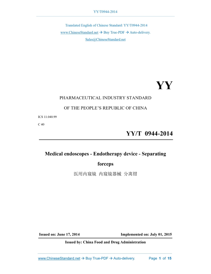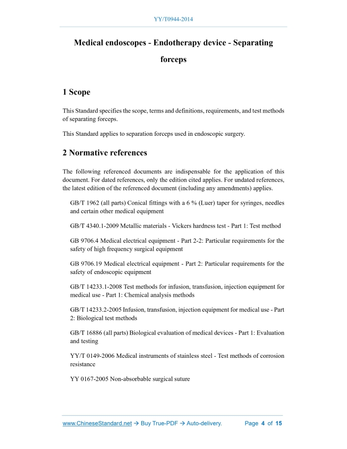 YY/T 0944-2014: Medical endoscopes - Endotherapy device - Separating forceps Delivery: 9 seconds. True-PDF full-copy in English & invoice will be downloaded + auto-delivered via email. See step-by-step procedure Status: Valid