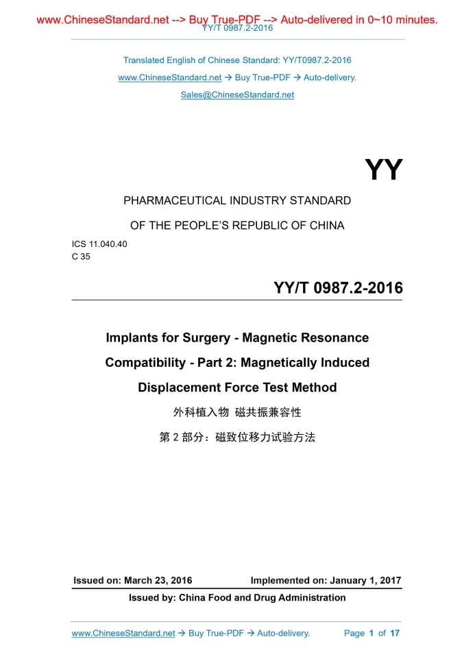 YY PHARMACEUTICAL INDUSTRY STANDARD OF THE PEOPLE’S REPUBLIC OF CHINA ICS 11.040.40 C 35 Implants for Surgery - Magnetic Resonance Compatibility - Part 2. Magnetically Induced Displacement Force Test Method 外科植入物 磁共振兼容性 Issued on: MARCH 23, 2016 Implemented on: JANUARY 1, 2017 Issued by. China Food and Drug Administration