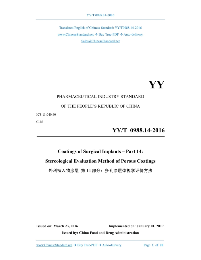 YY/T 0988.14-2016: Coatings of surgical implants - Part 14: Stereological evaluation method of porous coatings Delivery: 9 seconds. True-PDF full-copy in English & invoice will be downloaded + auto-delivered via email. See step-by-step procedure Status: Valid