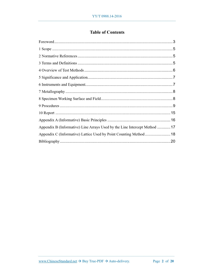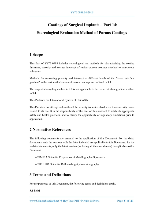 Similar standardsYY/T 0988.14-2016: Coatings of surgical implants - Part 14: Stereological evaluation method of porous coatings---This is an excerpt. Full copy of true-PDF in English version (including equations, symbols, images, flow-chart, tables, and figures etc.), auto-downloaded/delivered in 9 seconds, can be purchased online: https://www.ChineseStandard.net/PDF.aspx/YYT0988.14-2016 YY PHARMACEUTICAL INDUSTRY STANDARD OF THE PEOPLE’S REPUBLIC OF CHINA ICS 11.040.40 C 35 Coatings of Surgical Implants – Part 14: Stereological Evaluation Method of Porous Coatings ISSUED ON: MARCH 23, 2016 IMPLEMENTED ON: JANUARY 01, 2017 Issued by: China Food and Drug Administration Table of ContentsForeword ... 3 1 Scope ... 5 2 Normative References ... 5 3 Terms and Definitions ... 5 4 Overview of Test Methods ... 6 5 Significance and Application... 7 6 Instruments and Equipment... 7 7 Metallography ... 8 8 Specimen Working Surface and Field ... 8 9 Procedures ... 9 10 Report ... 15 Appendix A (Informative) Basic Principles ... 16 Appendix B (Informative) Line Arrays Used by the Line Intercept Method ... 17 Appendix C (Informative) Lattice Used by Point Counting Method ... 18 Bibliography ... 20 Coatings of Surgical Implants – Part 14: Stereological Evaluation Method of Porous Coatings1 ScopeThis Part of YY/T 0988 includes stereological test methods for characterizing the coating thickness, porosity and average intercept of various porous coatings attached to non-porous substrates. Methods for measuring porosity and intercept at different levels of the "tissue interface gradient" in the various thicknesses of porous coatings are outlined in 9.4. The tangential sampling method in 8.2 is not applicable to the tissue interface gradient method in 9.4. This Part uses the International System of Units (SI). This Part does not attempt to describe all the security issues involved; even those security issues related to its use. It is the responsibility of the user of this standard to establish appropriate safety and health practices, and to clarify the applicability of regulatory limitations prior to application.2 Normative ReferencesThe following documents are essential to the application of this Document. For the dated documents, only the versions with the dates indicated are applicable to this Document; for the undated documents, only the latest version (including all the amendments) is applicable to this Document. ASTM E 3 Guide for Preparation of Metallographic Specimens ASTE E 883 Guide for Reflected-light photomicrography3 Terms and DefinitionsFor the purposes of this Document, the following terms and definitions apply. 3.1 Field It is a representative size of pores in a porous structure. 4.4 Tissue interface gradient - Describe the pore volume percentage and mean pore intercept in the area about three 200-μm thickness below the tissue interface.5 Significance and Application5.1 These test methods are recommended for basic quantification of the morphological characteristics of porous coatings attached to solid substrates (See Appendix A). 5.2 These test methods may facilitate comparisons between different coatings or between different batches of the same coating. 5.3 Except for the tangential sampling method, all methods shall be operated on the same working surface. Tangential sampling is only available in 9.2 and 9.3. 5.4 Statistical estimates can be derived from the distribution of average coating thickness and pore volume percentage. But the distribution of the intercept cannot be estimated. 5.5 Depending on the spacing of the measurement grid lines (or grid points) and single field or a cumulative field, there are some limitations in accurately describing porosity. An increase in the size of the field, an increase in the number of fields or a reduction in the grid spacing shall improve the accuracy of the measured value. 5.6 This method is not applicable to ceramic coatings, because the coatings cannot be prepared with accurate coating cross-sections using metallographic techniques. 5.7 This test method is not suitable for coatings with a characterizing thickness less than 300μm.6 Instruments and Equipment6.1 The procedures of this test method can be performed manually or using digital image analysis techniques. 6.2 Microscope, or other suitable equipment with a display screen, capable of photomicrography or digital image capture, is used for imaging the field of the specimen. 6.3 Superimpose the transparent plate with the measurement grid lines or lattice on the display screen or photomicrograph for manual measurement. The linear grid (or lattice grid) shall include at least five parallel lines (or rows) evenly distributed.7 Metallography7.1 The test methods used to characterize porous coatings require the preparation of metallographic sections. Metallographic preparation techniques in accordance with ASTM E 3 and ASTM E 883 shall be used to prevent deformation of the section or other artifacts that alter the morphology of the metallographic section. For example, the absence of a partially porous coating creates an artificial porosity region, which is an unacceptable artifact. 7.2 Care shall be taken to ensure that the working surface is perpendicular to the substrate interface. Special care shall be taken when using the tangential sampling method in 8.1.2 to keep the substrate interface parallel to the final working surface.8 Specimen Working Surface and Field8.1 Specimen Orientation 8.1.1 Sampling of normal section 8.1.1.1 In order to accurately measure the coating thickness, the orientation of the working surface of the specimen shall be approximately perpendicular to the substrate plane. 8.1.1.2 If in a field, the angle between the tangent of the coating-substrate interface on one side and the tangent on the opposite side exceeds 2°, the curvature of the substrate is too large. 8.1.1.3 The magnification for measuring porosity and mean intercept is practically limited. As the magnific