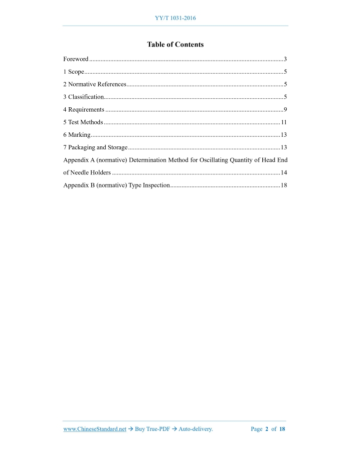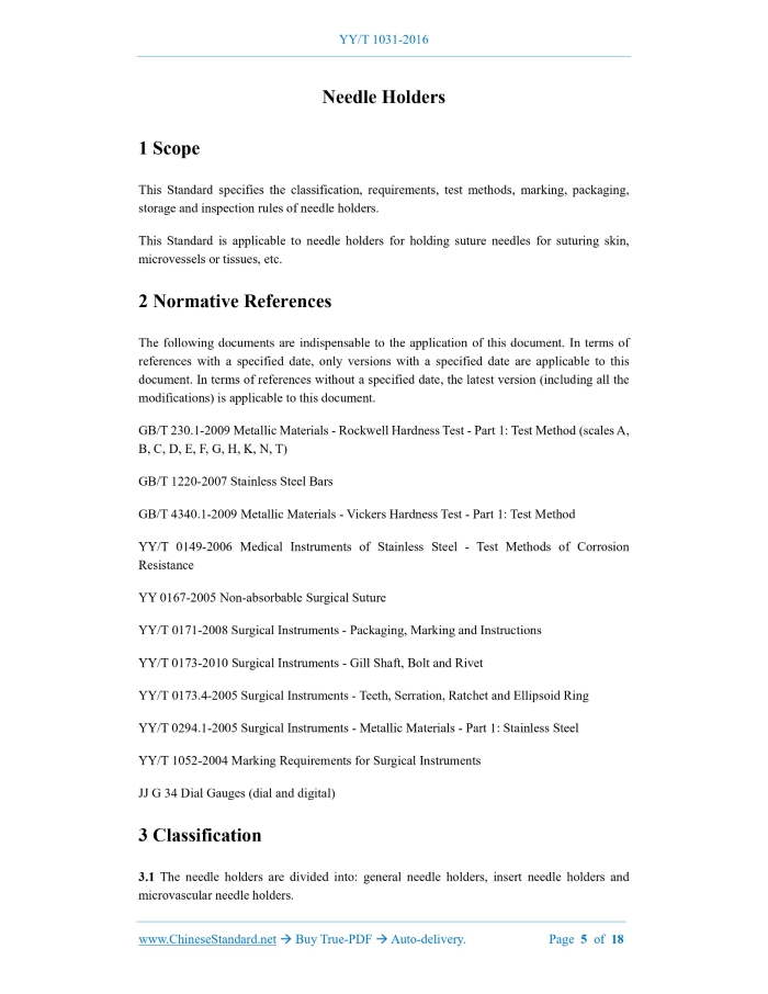 YY/T 1031-2016: Needle holders---This is an excerpt. Full copy of true-PDF in English version (including equations, symbols, images, flow-chart, tables, and figures etc.), auto-downloaded/delivered in 9 seconds, can be purchased online: https://www.ChineseStandard.net/PDF.aspx/YYT1031-2016YY PHARMACEUTICAL INDUSTRY STANDARD OF THE PEOPLE’S REPUBLIC OF CHINA ICS 11.040.30 C 31 Replacing YY/T 1031-2004 Needle Holders 持针钳 ISSUED ON: MARCH 23, 2016 IMPLEMENTED ON: JANUARY 1, 2017 Issued by: China Food and Drug Administration Table of ContentsForeword ... 3 1 Scope ... 5 2 Normative References ... 5 3 Classification ... 5 4 Requirements ... 9 5 Test Methods ... 11 6 Marking ... 13 7 Packaging and Storage ... 13 Appendix A (normative) Determination Method for Oscillating Quantity of Head End of Needle Holders ... 14 Appendix B (normative) Type Inspection ... 18 Needle Holders1 ScopeThis Standard specifies the classification, requirements, test methods, marking, packaging, storage and inspection rules of needle holders. This Standard is applicable to needle holders for holding suture needles for suturing skin, microvessels or tissues, etc.2 Normative ReferencesThe following documents are indispensable to the application of this document. In terms of references with a specified date, only versions with a specified date are applicable to this document. In terms of references without a specified date, the latest version (including all the modifications) is applicable to this document. GB/T 230.1-2009 Metallic Materials - Rockwell Hardness Test - Part 1: Test Method (scales A, B, C, D, E, F, G, H, K, N, T) GB/T 1220-2007 Stainless Steel Bars GB/T 4340.1-2009 Metallic Materials - Vickers Hardness Test - Part 1: Test Method YY/T 0149-2006 Medical Instruments of Stainless Steel - Test Methods of Corrosion Resistance YY 0167-2005 Non-absorbable Surgical Suture YY/T 0171-2008 Surgical Instruments - Packaging, Marking and Instructions YY/T 0173-2010 Surgical Instruments - Gill Shaft, Bolt and Rivet YY/T 0173.4-2005 Surgical Instruments - Teeth, Serration, Ratchet and Ellipsoid Ring YY/T 0294.1-2005 Surgical Instruments - Metallic Materials - Part 1: Stainless Steel YY/T 1052-2004 Marking Requirements for Surgical Instruments JJ G 34 Dial Gauges (dial and digital)3 Classification3.1 The needle holders are divided into: general needle holders, insert needle holders and microvascular needle holders. the handle of the needle holders without cemented carbide inserts shall not be golden yellow. 4.3 Surface Roughness The surface of the needle holders can be made with gloss or without gloss, and the value of the surface roughness parameter Ra shall not be greater than: with gloss: 0.4 m, without gloss: 0.8 m. 4.4 Elasticity and Firmness 4.4.1 The needle holders shall have good elasticity and firmness. 4.4.2 The connection between the cemented carbide inserts and the base of the insert needle holders shall be firm. 4.5 Clamping Performance The needle holders shall have good clamping performance. 4.6 Tooth Contact When the finger rings of the needle holders bump against each other, or when the locking teeth are all locked, no less than three-fifths of the tooth surface of the head serration shall be in contact. 4.7 Gill Flexibility The opening and closing of the gill joints of the needle holders shall be flexible, and with appropriate tightness. 4.8 Oscillating Quantity Disengage the locking teeth of the needle holders, and the head ends are separated by 1 mm. The oscillating quantity of the head end generated by the oscillating force applied to the ring part of the needle holders shall be not greater than that specified in Table 2. Table 2 -- Oscillating Quantity at the Head End Unit: millimeter 4.9 Dimensions The dimensions of the needle holders shall comply with the stipulations of 1 and 2 in Table 1. Total Length of Needle Holder L Oscillating Quantity 4.10 Hardness 4.10.1 The needle holders shall be subjected to thermal treatment, and their hardness shall comply with the stipulations of Table 3. 4.10.2 The hardness of the cemented carbide insert shall not be less than 923HV0.5; the difference between two pieces shall not be greater than 50HV0.5. 4.11 Corrosion Resistance The corrosion resistance of the appearance of the needle holders shall not be lower than the stipulations of Grade-b in the boiling water test method in YY/T 0149-2006.5 Test Methods5.1 Appearance Use normal or corrected vision to examine it and use hands to touch and feel it, which shall comply with the stipulations of 4.1.1 and 4.1.2. 5.2 Color Scale of the Handle Use normal or corrected vision to examine it, which shall comply with the stipulations of 4.2. 5.3 Surface Roughness The surface roughness of the needle holder shall be examined by the sample piece comparison method. Under the condition of magnification by 5 ~ 10 times, compare it with the sample piece, and use normal or corrected vision to examine it, which shall comply with the stipulations of 4.3. 5.4 Elasticity and Firmness 5.4.1 Place a stainless steel wire that complies with the stipulations of Table 4 on the front end of the head of the needle holder. The needle holder is completely closed, then loosened; repeat 3 times; observe the body of the instrument, which shall comply with the stipulations of 4.4.1. 5.4.2 After the insert needle holder is subjected to the elasticity and firmness test (5.4.1), observe the insert, which shall comply with the stipulations of 4.4.2. 5.5 Clamping Performance At one third of the front end of the head of the needle holder, clamp the 3-0 Class I uncoated medical suture specified in YY 0167-2005; pull it hard, until the suture breaks; observe the clamped suture, which shall comply with the stipulations of 4.5. 5.6 Tooth Contact Imitate the action of use, which shall comply with the requirements of 4.6. 5.7 Gill Flexibility Imitate the action of use, which shall comply with the stipulations of 4.7. 5.8 Oscillating Quantity Perform the 
