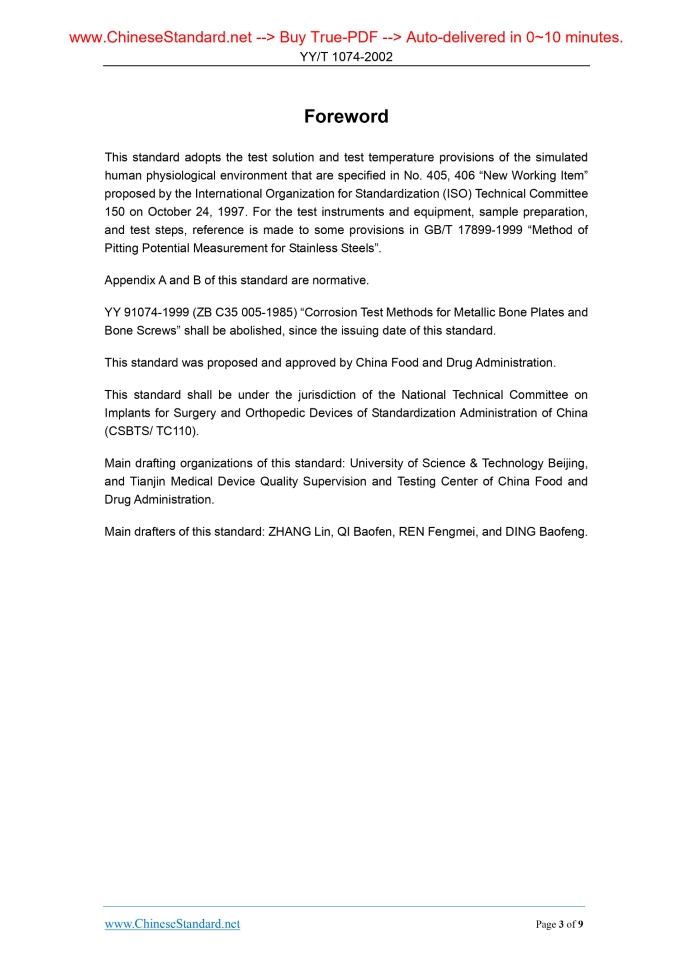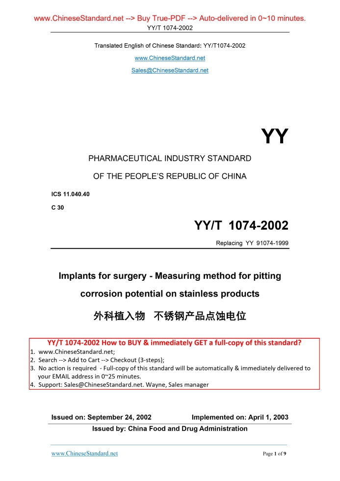 YY/T 1074-2002: Implants for surgery - Measuring method for pitting corrosion potential on stainless products Delivery: 9 seconds. True-PDF full-copy in English & invoice will be downloaded + auto-delivered via email. See step-by-step procedure Status: Valid YY/T 1074: Historical versions