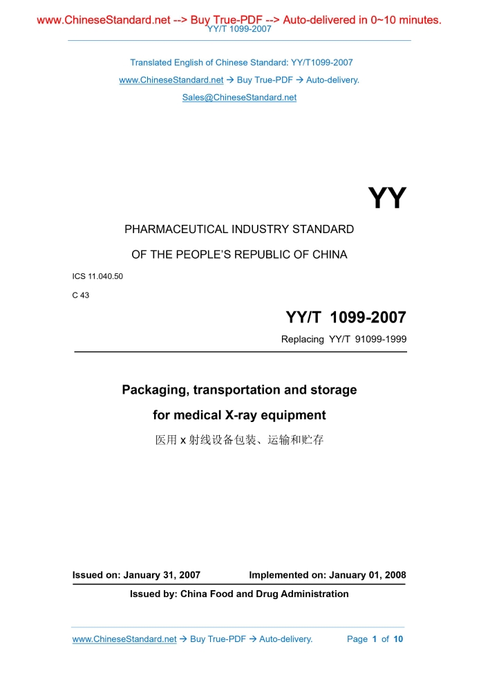 YY/T 1099-2007: Packaging, transportation and storage for medical X-ray equipment Delivery: 9 seconds. True-PDF full-copy in English & invoice will be downloaded + auto-delivered via email. See step-by-step procedure Status: Valid