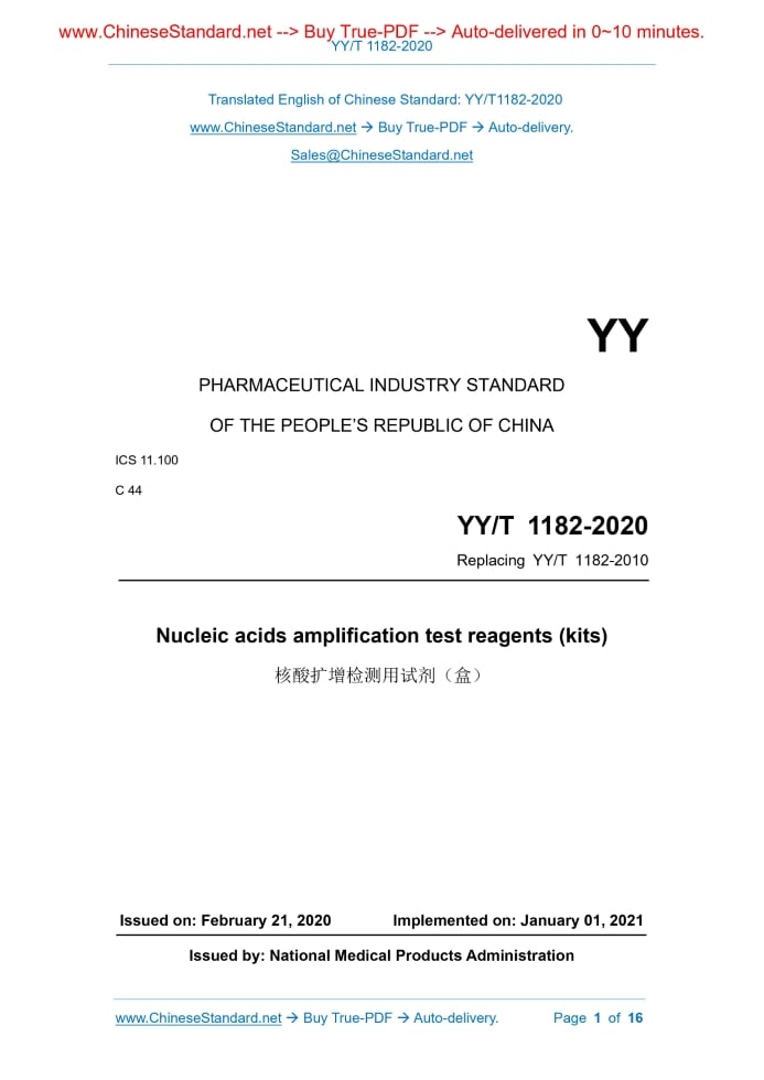 YY/T 1182-2020: Nucleic acids amplification test reagents (kits)---This is an excerpt. Full copy of true-PDF in English version (including equations, symbols, images, flow-chart, tables, and figures etc.), auto-downloaded/delivered in 9 seconds, can be purchased online: https://www.ChineseStandard.net/PDF.aspx/YYT1182-2020PHARMACEUTICAL INDUSTRY STANDARD OF THE PEOPLE’S REPUBLIC OF CHINA ICS 11.100 C 44 Replacing YY/T 1182-2010 Nucleic acids amplification test reagents (kits) ISSUED ON: FEBRUARY 21, 2020 IMPLEMENTED ON: JANUARY 01, 2021 Issued by: National Medical Products Administration Table of ContentsForeword ... 3 1 Scope ... 5 2 Normative references ... 5 3 Terms and definitions ... 5 4 Classification ... 6 5 Technical requirements ... 7 6 Test method ... 12 7 Labels and instructions ... 15 8 Packaging, transportation and storage ... 15 References ... 16 Nucleic acids amplification test reagents (kits)1 ScopeThis Standard specifies the terms and definitions, classification technical requirements, test methods, labels and instructions, packaging, transportation and storage of nucleic acids amplification test reagents (kits) [hereinafter referred to as "reagents (kits)"]. This Standard applies to the quality control of nucleic acids amplification test reagents (kits). Nucleic acids amplification methods include polymerase chain reaction (PCR) technology and isothermal nucleic acid amplification technology. This Standard does not apply to the following products: a) reagents (kits) for blood source screening; b) reagents (kits) for gene sequencing. This Standard is a general standard for nucleic acids amplification test reagents (kits). For products or reagents (kits) with special standards, corresponding product standards or technical requirements should be formulated according to product characteristics and special standard requirements.2 Normative referencesThe following documents are indispensable for the application of this document. For dated references, only the dated version applies to this document. For undated references, the latest edition (including all amendments) applies to this document. GB/T 21415-2008, In vitro diagnostic medical devices - Measurement of quantities in biological samples - Metrological traceability of values assigned to calibrators and control materials GB/T 29791.2, In vitro diagnostic medical devices - Information supplied by the manufacturer (labelling) - Part 2: In vitro diagnostic reagents for professional use3 Terms and definitionsThe following terms and definitions are applicable to this document. b) According to the principle of nucleic acid amplification, it can be divided into: variable temperature amplification detection kit and isothermal amplification detection kit; c) Classify according to methodologies; examples of common methodologies: PCR-fluorescent probe method, PCR-fluorescent dye method, PCR- melting curve method, multiple fluorescence PCR method, RT-PCR fluorescence method, nested-PCR method, gap-PCR method, loop- mediated constant temperature amplification method.5 Technical requirements5.1 General requirements 5.1.1 Appearance The reagents (kits) shall meet the appearance requirements that are specified by the manufacturer; the appearance requirements include but are not limited to the following: the reagents (kits) shall have complete components; the package shall be clean, free from leakage and damage; the signs and labels shall be clearly written. 5.1.2 Nucleic acid extraction function The nucleic acid extraction function shall meet the following requirements: a) For reagents (kits) that contain nucleic acid extraction components, the manufacturer shall make appropriate requirements for nucleic acid extraction, and verify the nucleic acid extraction function. For example: fully consider the interference factors in the sample extraction process and the possible impact on the subsequent sample amplification process; b) For reagents (kits) for which samples need to be extracted, but do not contain nucleic acid extraction components, the manufacturer shall state or specify the extraction reagents (kits) and provide verification or confirmation information; c) For reagents (kits) which are directly amplified without sample extraction, the manufacturer shall be able to provide sufficient evidence to prove the anti-interference of the enzymes in its products. 5.1.3 Internal standard and (or) control Manufacturers shall establish appropriate quality control procedures for the detection results of reagents (kits); they should reasonably set internal standard and (or) control in the reaction system according to the characteristics of their 5.2.6 Negative reference conformance rate When it is applicable, perform determination of the negative reference in the national reference or enterprise reference; the detection result shall be positive. The reference settings follow the following principles: a) Contain a certain number of samples without test substance; b) Fully consider factors such as possible interference, crossover, non- specific. For example: containing a certain number of other samples that are similar to the tested species, of the same infection site, or similar infection symptoms; c) When it is applicable, include a certain number of genotypes that are not within the declared detection range of the reagent (kit). 5.2.7 Detection limit The manufacturer shall specify and provide the detection limit of the reagent (kit); the establishing and verifying method of the detection limit of the reagent (kit) shall be scientific and feasible. Perform determination of the detection limit reference of the national reference or enterprise reference; the detection result shall meet the requirements of the national reference or enterprise reference. 5.2.8 Precision The precision within the batch shall meet that the coefficient of variation (CV, %) of the detected concentration log value is ≤ 5%. When the sample concentration is low, the 