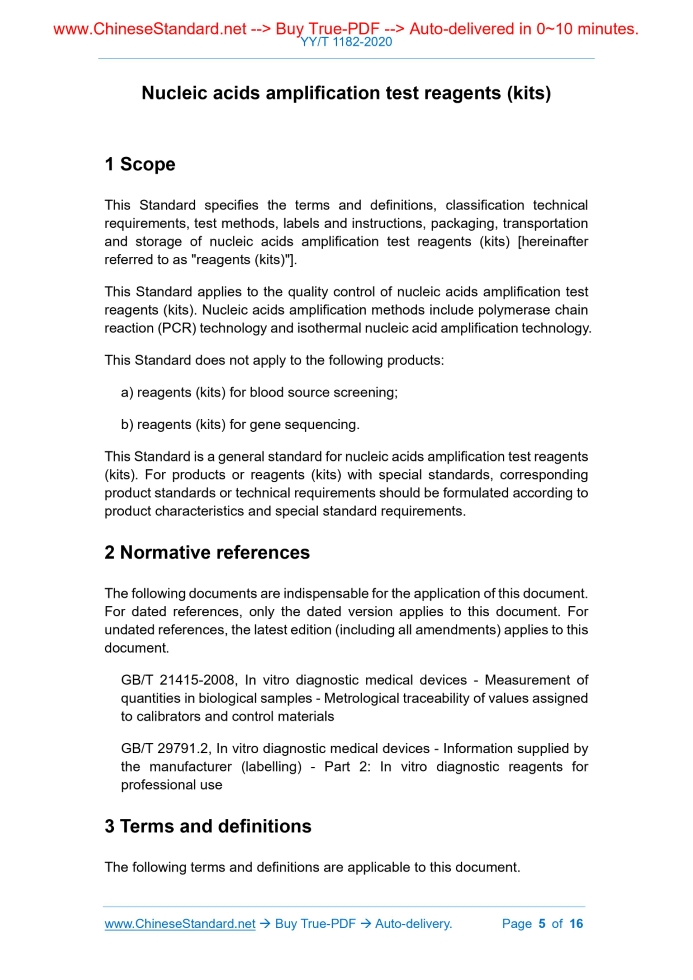 YY/T 1182-2020: Nucleic acids amplification test reagents (kits)---This is an excerpt. Full copy of true-PDF in English version (including equations, symbols, images, flow-chart, tables, and figures etc.), auto-downloaded/delivered in 9 seconds, can be purchased online: https://www.ChineseStandard.net/PDF.aspx/YYT1182-2020PHARMACEUTICAL INDUSTRY STANDARD OF THE PEOPLE’S REPUBLIC OF CHINA ICS 11.100 C 44 Replacing YY/T 1182-2010 Nucleic acids amplification test reagents (kits) ISSUED ON: FEBRUARY 21, 2020 IMPLEMENTED ON: JANUARY 01, 2021 Issued by: National Medical Products Administration Table of ContentsForeword ... 3 1 Scope ... 5 2 Normative references ... 5 3 Terms and definitions ... 5 4 Classification ... 6 5 Technical requirements ... 7 6 Test method ... 12 7 Labels and instructions ... 15 8 Packaging, transportation and storage ... 15 References ... 16 Nucleic acids amplification test reagents (kits)1 ScopeThis Standard specifies the terms and definitions, classification technical requirements, test methods, labels and instructions, packaging, transportation and storage of nucleic acids amplification test reagents (kits) [hereinafter referred to as "reagents (kits)"]. This Standard applies to the quality control of nucleic acids amplification test reagents (kits). Nucleic acids amplification methods include polymerase chain reaction (PCR) technology and isothermal nucleic acid amplification technology. This Standard does not apply to the following products: a) reagents (kits) for blood source screening; b) reagents (kits) for gene sequencing. This Standard is a general standard for nucleic acids amplification test reagents (kits). For products or reagents (kits) with special standards, corresponding product standards or technical requirements should be formulated according to product characteristics and special standard requirements.2 Normative referencesThe following documents are indispensable for the application of this document. For dated references, only the dated version applies to this document. For undated references, the latest edition (including all amendments) applies to this document. GB/T 21415-2008, In vitro diagnostic medical devices - Measurement of quantities in biological samples - Metrological traceability of values assigned to calibrators and control materials GB/T 29791.2, In vitro diagnostic medical devices - Information supplied by the manufacturer (labelling) - Part 2: In vitro diagnostic reagents for professional use3 Terms and definitionsThe following terms and definitions are applicable to this document. b) According to the principle of nucleic acid amplification, it can be divided into: variable temperature amplification detection kit and isothermal amplification detection kit; c) Classify according to methodologies; examples of common methodologies: PCR-fluorescent probe method, PCR-fluorescent dye method, PCR- melting curve method, multiple fluorescence PCR method, RT-PCR fluorescence method, nested-PCR method, gap-PCR method, loop- mediated constant temperature amplification method.5 Technical requirements5.1 General requirements 5.1.1 Appearance The reagents (kits) shall meet the appearance requirements that are specified by the manufacturer; the appearance requirements include but are not limited to the following: the reagents (kits) shall have complete components; the package shall be clean, free from leakage and damage; the signs and labels shall be clearly written. 5.1.2 Nucleic acid extraction function The nucleic acid extraction function shall meet the following requirements: a) For reagents (kits) that contain nucleic acid extraction components, the manufacturer shall make appropriate requirements for nucleic acid extraction, and verify the nucleic acid extraction function. For example: fully consider the interference factors in the sample extraction process and the possible impact on the subsequent sample amplification process; b) For reagents (kits) for which samples need to be extracted, but do not contain nucleic acid extraction components, the manufacturer shall state or specify the extraction reagents (kits) and provide verification or confirmation information; c) For reagents (kits) which are directly amplified without sample extraction, the manufacturer shall be able to provide sufficient evidence to prove the anti-interference of the enzymes in its products. 5.1.3 Internal standard and (or) control Manufacturers shall establish appropriate quality control procedures for the detection results of reagents (kits); they should reasonably set internal standard and (or) control in the reaction system according to the characteristics of their 5.2.6 Negative reference conformance rate When it is applicable, perform determination of the negative reference in the national reference or enterprise reference; the detection result shall be positive. The reference settings follow the following principles: a) Contain a certain number of samples without test substance; b) Fully consider factors such as possible interference, crossover, non- specific. For example: containing a certain number of other samples that are similar to the tested species, of the same infection site, or similar infection symptoms; c) When it is applicable, include a certain number of genotypes that are not within the declared detection range of the reagent (kit). 5.2.7 Detection limit The manufacturer shall specify and provide the detection limit of the reagent (kit); the establishing and verifying method of the detection limit of the reagent (kit) shall be scientific and feasible. Perform determination of the detection limit reference of the national reference or enterprise reference; the detection result shall meet the requirements of the national reference or enterprise reference. 5.2.8 Precision The precision within the batch shall meet that the coefficient of variation (CV, %) of the detected concentration log value is ≤ 5%. When the sample concentration is low, the 