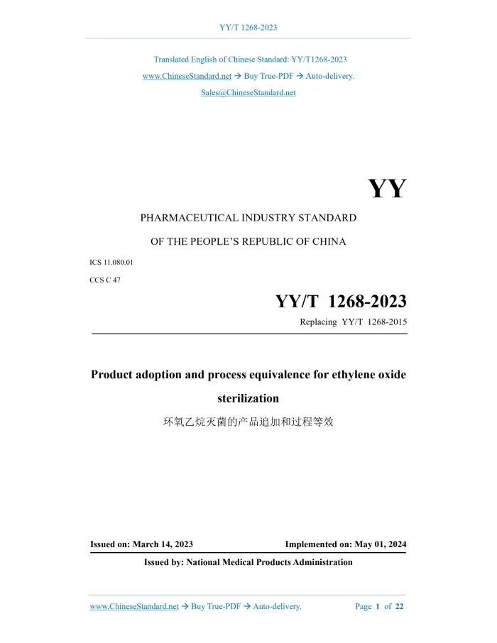 YY/T 1268-2023: Product adoption and process equivalence for ethylene oxide sterilization Delivery: 9 seconds. True-PDF full-copy in English & invoice will be downloaded + auto-delivered via email. See step-by-step procedure Status: Valid YY/T 1268: Historical versions