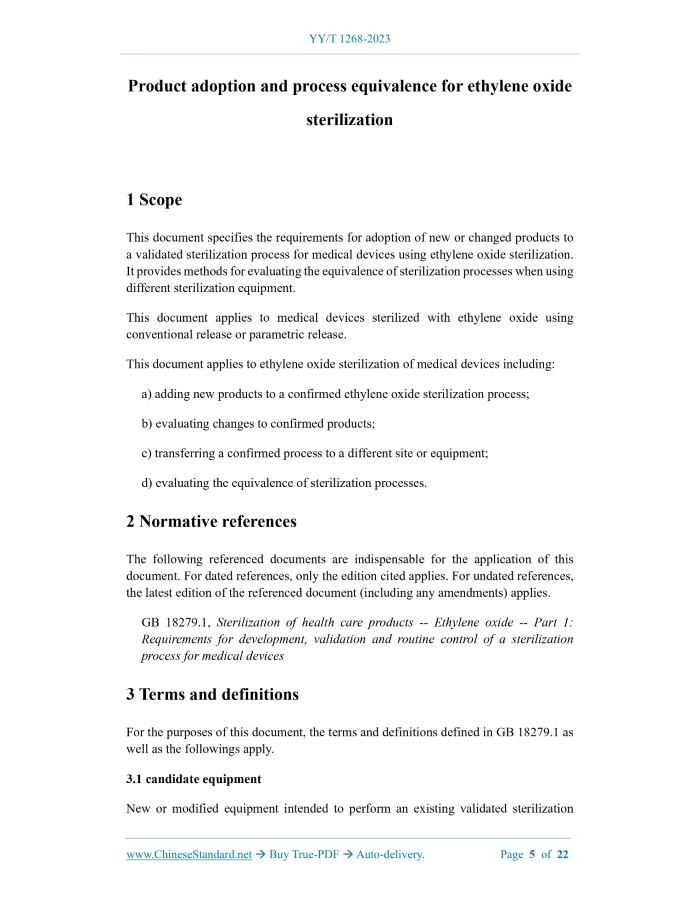 Similar standardsYY/T 1268-2023: Product adoption and process equivalence for ethylene oxide sterilization---This is an excerpt. Full copy of true-PDF in English version (including equations, symbols, images, flow-chart, tables, and figures etc.), auto-downloaded/delivered in 9 seconds, can be purchased online: https://www.ChineseStandard.net/PDF.aspx/YYT1268-2023YY PHARMACEUTICAL INDUSTRY STANDARD ICS 11.080.01 CCS C 47 Replacing YY/T 1268-2015 Product adoption and process equivalence for ethylene oxide sterilization Issued on. MARCH 14, 2023 Implemented on. MAY 01, 2024 Issued by. National Medical Products Administration Table of ContentsForeword... 3 1 Scope... 5 2 Normative references... 5 3 Terms and definitions... 5 4 Product adoption... 7 5 Process equivalence... 11 Annex A (informative) Guidelines for the evaluation of product adoption to EO product family or EO processing category... 17 Annex B (informative) Guidelines for process equivalence evaluation... 20 Bibliography... 22ForewordThis document was drafted in accordance with the rules given in GB/T 1.1-2020 "Directives for standardization - Part 1.Rules for the structure and drafting of standardizing documents". This document replaces YY/T 1268-2015 "Product adoption and process equivalence for ethylene oxide sterilization". Compared with YY/T 1268-2015, in addition to structural adjustments and editorial changes, the main technical changes are as follows. a) Changed the scope statement (see Chapter 1 of this Edition; Chapter 1 of Edition 2015); b) Changed the terms and definitions of "candidate equipment", "candidate product", "EO processing category", "EO product family", "load configuration", "process equivalence", "product adoption", "requalification", "sterilization process equipment" and "sterilization specialist" (see 3.1~3.5, 3.7~3.11 of this Edition; 3.1~3.10 of Edition 2015); c) Added the term and definition "packaging system" (see 3.6 of this Edition); d) Changed the additional notes for products in Chapter 4 to general provisions (see 4.1 of this Edition; Notes for Chapter 4 of Edition 2015); e) Changed the contents of product family and processing category (see 4.2 of this Edition; 4.1 and 4.2 of Edition 2015); f) Changed the mandatory clauses to recommended clauses (see 4.2, 4.3, 4.5, 4.7, 5.9 of this Edition; 4.2, 4.3.2, 4.3.4, 4.3.6, 5.4 of Edition 2015); g) Deleted the general principles for product additional evaluation (see 4.3.1 of Edition 2015); h) Changed the contents of the conclusion of the adoption (see 4.8 of this Edition; 4.4 of Edition 2015); i) Modified the contents of equivalence maintenance (see 5.9 of this Edition; 5.4 of Edition 2015). Attention is drawn to the possibility that some of the elements of this document may be the subject of patent rights. The issuing authority shall not be held responsible for identifying any or all such patent rights. This document was proposed by National Medical Products Administration. This document shall be under the jurisdiction of National Technical Committee on Disinfection Technology and Equipment of Standardization Administration of China (SAC/TC 200). The drafting organizations of this document. Suzhou Nojie Medical Technology Co., Ltd., Hangzhou Weiqiang Medical Technology Co., Ltd., Guangdong Medical Device Quality Supervision and Inspection Institute, Xinxiang Huaxi Medical Materials Co., Ltd., and Terumo Medical Products (Hangzhou) Co., Ltd. Main drafters of this document. Xu Haiying, Zhou Zhilong, Hong Zixiang, Xu Zhanli, Cui Wenbo, Weng Hui, Liu Xuemei, Zhou Guangyu, Lin Manting. Versions of standard substituted by this document are. - It was first published in 2015 as YY/T 1268-2015; - This is the first revision. Product adoption and process equivalence for ethylene oxide sterilization1 ScopeThis document specifies the requirements for adoption of new or changed products to a validated sterilization process for medical devices using ethylene oxide sterilization. It provides methods for evaluating the equivalence of sterilization processes when using different sterilization equipment. This document applies to medical devices sterilized with ethylene oxide using conventional release or parametric release. This document applies to ethylene oxide sterilization of medical devices including. a) adding new products to a confirmed ethylene oxide sterilization process; b) evaluating changes to confirmed products; c) transferring a confirmed process to a different site or equipment; d) evaluating the equivalence of sterilization processes.2 Normative referencesThe following referenced documents are indispensable for the application of this document. For dated references, only the edition cited applies. For undated references, the latest edition of the referenced document (including any amendments) applies. GB 18279.1, Sterilization of health care products -- Ethylene oxide -- Part 1. Requirements for development, validation and routine control of a sterilization process for medical devices3 Terms and definitionsFor the purposes of this document, the terms and definitions defined in GB 18279.1 as well as the followings apply. 3.1 candidate equipment New or modified equipment intended to perform an existing validated sterilization process. 3.4 EO product family A combination of products that are sterilized using the same process conditions and have similar or identical validation purposes are permitted. 3.5 load configuration The total properties of the product as it will behave during the sterilization process. This structure includes. 3.6 packaging system Combination of sterile barrier system and protective packaging. 3.7 process equivalence A written evaluation that the same sterilization process can be run within specified parameters on two or more sterilization process equipment. 3.8 product adoption The process of introducing a candidate product into an existing, identified EO processing category or family of ethylene oxide products. 3.9 requalificati
