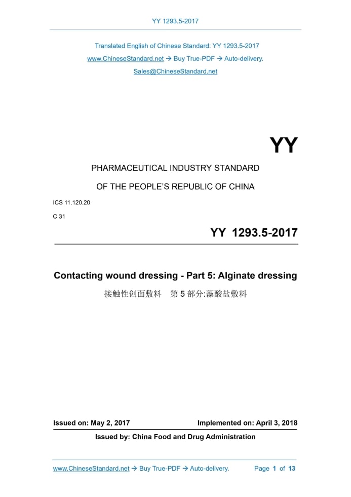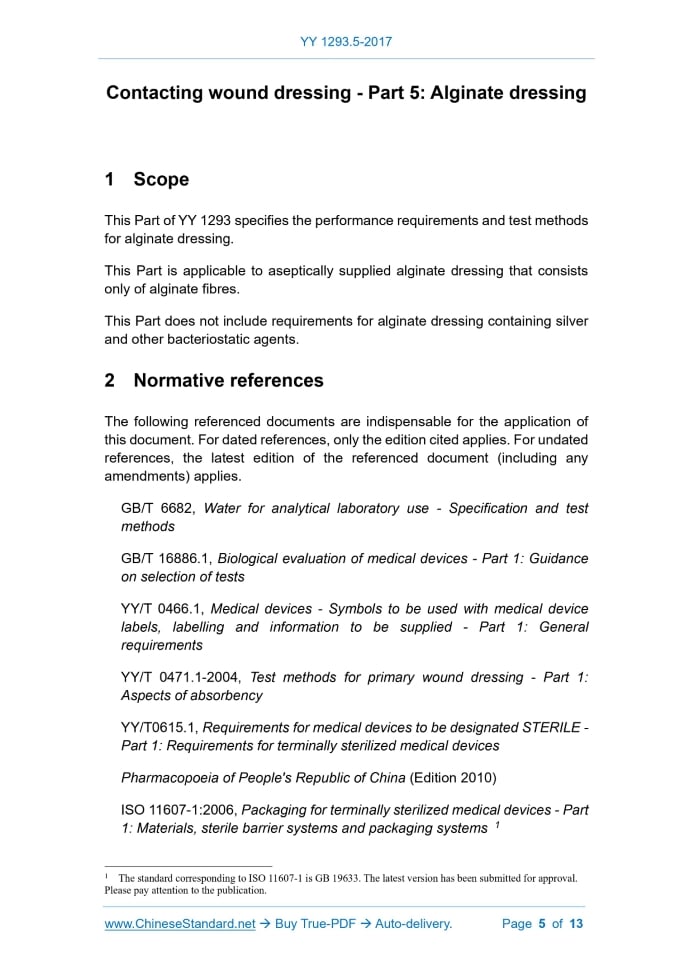 YY/T 1293.5-2017: Contacting wound dressing - Part 5: Alginate dressing Delivery: 9 seconds. True-PDF full-copy in English & invoice will be downloaded + auto-delivered via email. See step-by-step procedure Status: Valid YY/T 1293.5: Historical versions
