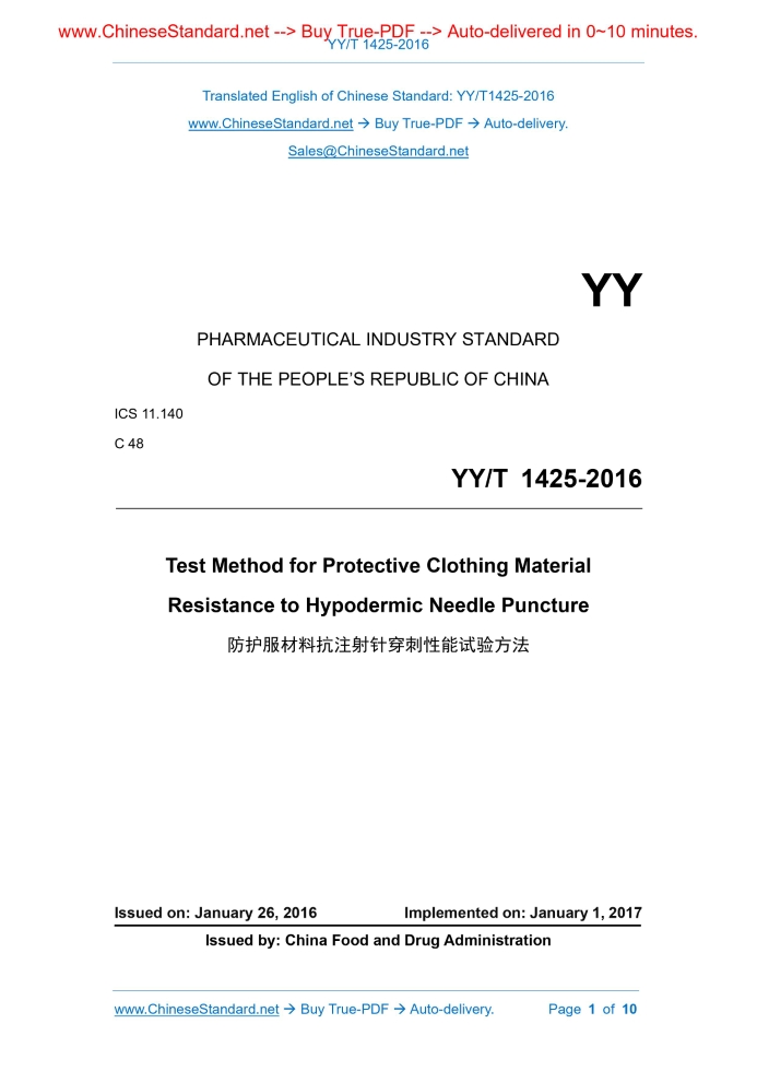 YY/T 1425-2016: Test Method for Protective Clothing Material Resistance to Hypodermic Needle Puncture Delivery: 9 seconds. True-PDF full-copy in English & invoice will be downloaded + auto-delivered via email. See step-by-step procedure Status: Valid