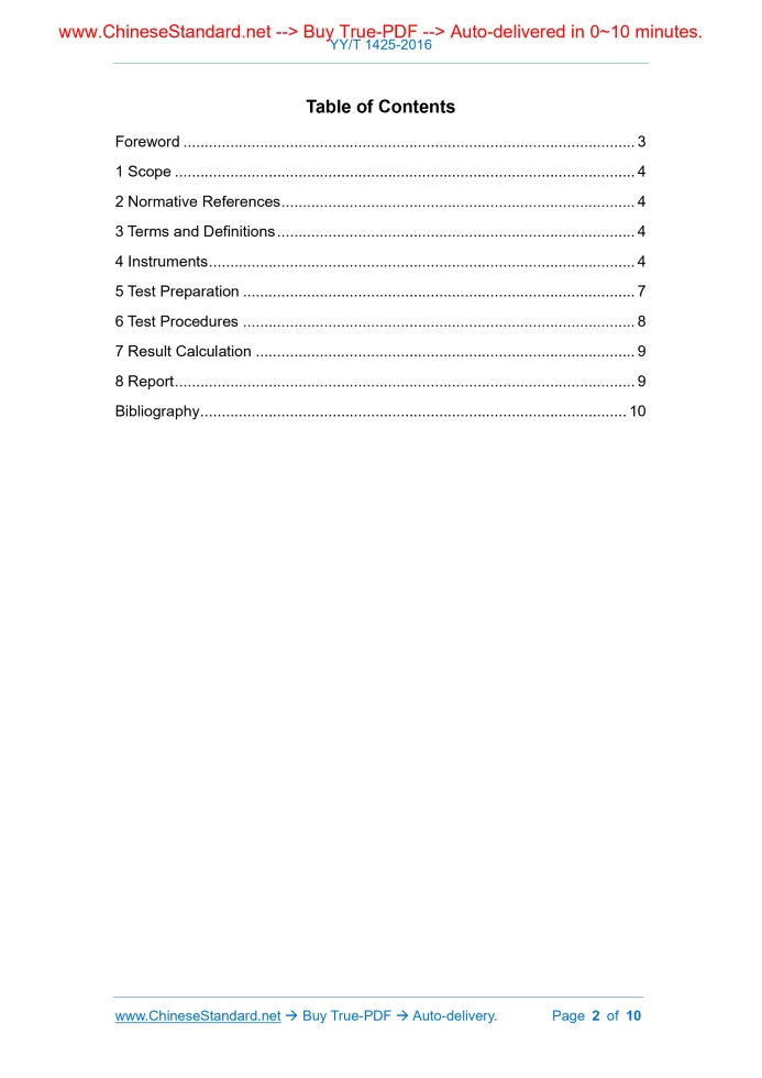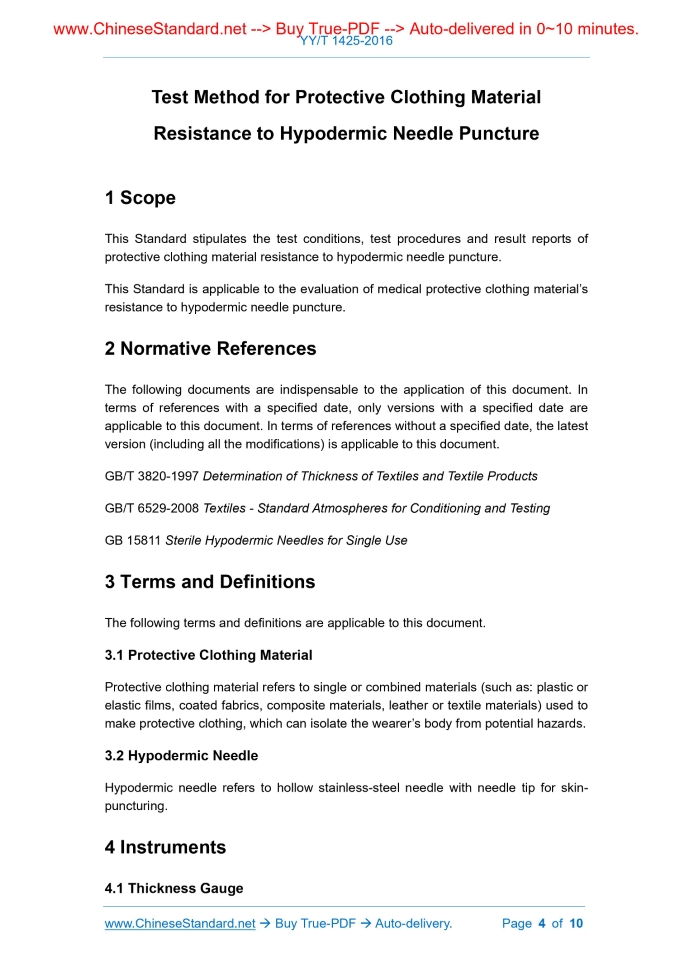 Similar standardsYY/T 1425-2016: Test Method for Protective Clothing Material Resistance to Hypodermic Needle Puncture---This is an excerpt. Full copy of true-PDF in English version (including equations, symbols, images, flow-chart, tables, and figures etc.), auto-downloaded/delivered in 9 seconds, can be purchased online: https://www.ChineseStandard.net/PDF.aspx/YYT1425-2016 PHARMACEUTICAL INDUSTRY STANDARD OF THE PEOPLE’S REPUBLIC OF CHINA ICS 11.140 C 48 Test Method for Protective Clothing Material Resistance to Hypodermic Needle Puncture ISSUED ON: JANUARY 26, 2016 IMPLEMENTED ON: JANUARY 1, 2017 Issued by: China Food and Drug Administration Table of ContentsForeword ... 3 1 Scope ... 4 2 Normative References ... 4 3 Terms and Definitions ... 4 4 Instruments ... 4 5 Test Preparation ... 7 6 Test Procedures ... 8 7 Result Calculation ... 9 8 Report ... 9 Bibliography ... 10 Test Method for Protective Clothing Material Resistance to Hypodermic Needle Puncture1 ScopeThis Standard stipulates the test conditions, test procedures and result reports of protective clothing material resistance to hypodermic needle puncture. This Standard is applicable to the evaluation of medical protective clothing material’s resistance to hypodermic needle puncture.2 Normative ReferencesThe following documents are indispensable to the application of this document. In terms of references with a specified date, only versions with a specified date are applicable to this document. In terms of references without a specified date, the latest version (including all the modifications) is applicable to this document. GB/T 3820-1997 Determination of Thickness of Textiles and Textile Products GB/T 6529-2008 Textiles - Standard Atmospheres for Conditioning and Testing GB 15811 Sterile Hypodermic Needles for Single Use3 Terms and DefinitionsThe following terms and definitions are applicable to this document. 3.1 Protective Clothing Material Protective clothing material refers to single or combined materials (such as: plastic or elastic films, coated fabrics, composite materials, leather or textile materials) used to make protective clothing, which can isolate the wearer’s body from potential hazards. 3.2 Hypodermic Needle Hypodermic needle refers to hollow stainless-steel needle with needle tip for skin- puncturing.4 Instruments4.1 Thickness Gauge ......Source: Above contents are excerpted from the full-copy PDF -- translated/reviewed by: www.ChineseStandard.net / Wayne Zheng et al. Tips & Frequently Asked Questions:Question 1: How long will the true-PDF of English version of YY/T 1425-2016 be delivered?Answer: The full copy PDF of English version of YY/T 1425-2016 can be downloaded in 9 seconds, and it will also be emailed to you in 9 seconds (double mechanisms to ensure the delivery reliably), with PDF-invoice.Question 2: Can I share the purchased PDF of YY/T 1425-2016_English with my colleagues?Answer: Yes. The purchased PDF of YY/T 1425-2016_English will be deemed to be sold to your employer/organization who actually paid for it, including your colleagues and your employer's intranet.Question 3: Does the price include tax/VAT?Answer: Yes. Our tax invoice, downloaded/delivered in 9 seconds, includes all tax/VAT and complies with 100+ countries' tax regulations (tax exempted in 100+ countries) -- See Avoidance of Double Taxation Agreements (DTAs): List of DTAs signed between Singapore and 100+ countriesQuestion 4: Do you accept my currency other than USD?Answer: Yes. www.ChineseStandard.us -- YY/T 1425-2016 -- Click this link and select your country/currency to pay, the exact amount in your currency will be printed on the invoice. Full PDF will also be downloaded/emailed in 9 seconds.How to buy and download a true PDF of English version of YY/T 1425-2016?A step-by-step guide to download PDF of YY/T 1425-2016_EnglishStep 1: Visit website https://www.ChineseStandard.net (Pay in USD), or https://www.ChineseStandard.us (Pay in any currencies such as Euro, KRW, JPY, AUD).Step 2: Search keyword "YY/T 1425-2016". Step 3: Click "Add to Cart". If multiple PDFs are required, repeat steps 2 and 3 to add up to 12 PDFs to cart. Step 4: Select payment option (Via payment agents Stripe or PayPal). Step 5: Customize Tax Invoice -- Fill up your email etc. Step 6: Click "Checkout". Step 7: Make payment by credit card, PayPal, Google Pay etc. After the payment is completed and in 9 seconds, you will receive 2 emails attached with the purchased PDFs and PDF-invoice, respectively. Step 8: Optional -- Go to download PDF. Step 9: Optional -- Click Open/Download PDF to download PDFs and invoice. See screenshots for above steps: Steps 1~3 Steps 4~6 Step 7 Step 8 Step 9 |