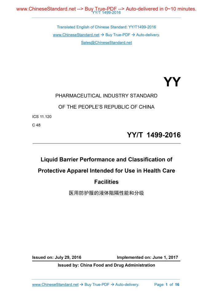 YY/T 1499-2016: Liquid Barrier Performance and Classification of Protective Apparel Intended for Use in Health Care Facilities Delivery: 9 seconds. True-PDF full-copy in English & invoice will be downloaded + auto-delivered via email. See step-by-step procedure Status: Valid