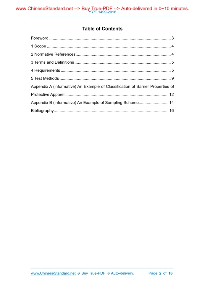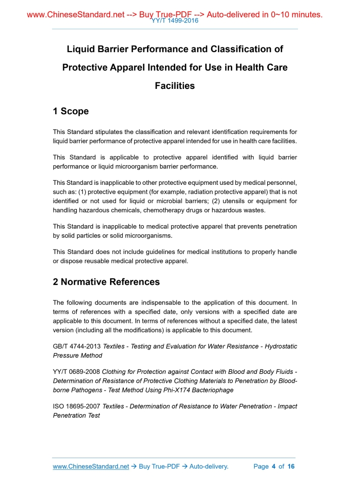 YY/T 1499-2016: Liquid Barrier Performance and Classification of Protective Apparel Intended for Use in Health Care Facilities---This is an excerpt. Full copy of true-PDF in English version (including equations, symbols, images, flow-chart, tables, and figures etc.), auto-downloaded/delivered in 9 seconds, can be purchased online: https://www.ChineseStandard.net/PDF.aspx/YYT1499-2016 PHARMACEUTICAL INDUSTRY STANDARD OF THE PEOPLE’S REPUBLIC OF CHINA ICS 11.120 C 48 Liquid Barrier Performance and Classification of Protective Apparel Intended for Use in Health Care Facilities ISSUED ON: JULY 29, 2016 IMPLEMENTED ON: JUNE 1, 2017 Issued by: China Food and Drug Administration Table of ContentsForeword ... 3 1 Scope ... 4 2 Normative References ... 4 3 Terms and Definitions ... 5 4 Requirements ... 5 5 Test Methods ... 9 Appendix A (informative) An Example of Classification of Barrier Properties of Protective Apparel ... 12 Appendix B (informative) An Example of Sampling Scheme ... 14 Bibliography ... 16 Liquid Barrier Performance and Classification of Protective Apparel Intended for Use in Health Care Facilities1 ScopeThis Standard stipulates the classification and relevant identification requirements for liquid barrier performance of protective apparel intended for use in health care facilities. This Standard is applicable to protective apparel identified with liquid barrier performance or liquid microorganism barrier performance. This Standard is inapplicable to other protective equipment used by medical personnel, such as: (1) protective equipment (for example, radiation protective apparel) that is not identified or not used for liquid or microbial barriers; (2) utensils or equipment for handling hazardous chemicals, chemotherapy drugs or hazardous wastes. This Standard is inapplicable to medical protective apparel that prevents penetration by solid particles or solid microorganisms. This Standard does not include guidelines for medical institutions to properly handle or dispose reusable medical protective apparel.2 Normative ReferencesThe following documents are indispensable to the application of this document. In terms of references with a specified date, only versions with a specified date are applicable to this document. In terms of references without a specified date, the latest version (including all the modifications) is applicable to this document. GB/T 4744-2013 Textiles - Testing and Evaluation for Water Resistance - Hydrostatic Pressure Method YY/T 0689-2008 Clothing for Protection against Contact with Blood and Body Fluids - Determination of Resistance of Protective Clothing Materials to Penetration by Blood- borne Pathogens - Test Method Using Phi-X174 Bacteriophage ISO 18695-2007 Textiles - Determination of Resistance to Water Penetration - Impact Penetration Test The manufacturer shall provide the end user with technical information and / or training, so as to explain the barrier performance classification system and its significance. In accordance with product’s barrier performance level and the degree of possible contact between medical personnel and blood, body fluids or other potentially infectious materials in the corresponding environment of use, the end user shall be responsible for selecting appropriate products. 4.2 Performance Requirements 4.2.1 Barrier properties 4.2.1.1 General rules In accordance with 5.2.1, determine the barrier performance level of the protective zone and non-protective zone of protective apparel. In accordance with the barrier properties of the critical zone, protective apparel shall be classified and identified. The liquid barrier performance of all the critical zone components, including seams and attachment points of accessories, shall be determined. In the form of numbers, the minimum barrier performance level of the critical zone components of the product shall be indicated. It is unnecessary to determine the liquid barrier performance level (see 4.2.3) of the seam between the critical zone and other protective zones and the seam between the critical zone and non-protective zone. In accordance with the performance of the product at the end of the indicated service life (for example, post-treatment performance in accordance with the mode and the times of treatment recommended by the manufacturer), determine the liquid barrier performance level of reusable medical protective apparel. 4.2.1.2 Level of barrier performance In accordance with the stipulations in 5.2.1, conduct sampling and tests of the critical zone of protective apparel; classify protective apparel in accordance with the following stipulations and Table 1. Level-1: under the conditions specified in 5.2.1, use the method specified in ISO 18695-2007, conduct liquid barrier performance test. The absorption capacity of all the critical zone components shall be not more than 4.5 g; AQL is 4% / RQL is 20%. In accordance with the stipulations in 4.1.3, the test result shall be reported in the manufacturer’s product technical information. Level-2: under the conditions specified in 5.2.1, use the method specified in ISO 18695-2007 and GB/T 4744-2013, conduct liquid barrier performance test. The absorption capacity of all the critical zone components shall be not more than 1.0 g; hydrostatic pressure shall be not less than 2 kPa 20 cm H2O; AQL is 4% / RQL is 20%. In accordance with the stipulations in 4.1.3, the test result shall be reported in the manufacturer’s product technical information. The critical zone of protective apparel (excluding isolation apparel) shall at least include the area from the chest to the knee, and the area of sleeve from the cuff to the elbow. The manufacturer shall specify the exact size of the critical zone, and in accordance with the stipulations in 4.1.3 a), provide information of barrier performance of each critical zone component. The manufacturer shall also, in accordance with the stipulations in 4.1.3 b), provide detailed information of bar