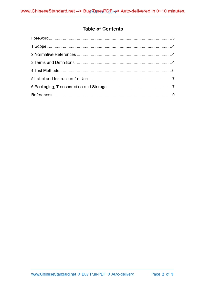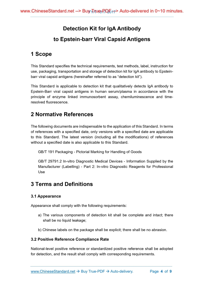 YY/T 1517-2017: Detection kit for IgA antibody to epstein-barr viral capsid antigens---This is an excerpt. Full copy of true-PDF in English version (including equations, symbols, images, flow-chart, tables, and figures etc.), auto-downloaded/delivered in 9 seconds, can be purchased online: https://www.ChineseStandard.net/PDF.aspx/YYT1517-2017YY PHARMACEUTICAL INDUSTRY STANDARD OF THE PEOPLE’S REPUBLIC OF CHINA ICS 11.100 C 44 Detection Kit for IgA Antibody to Epstein-barr Viral Capsid Antigens Issued on: MAY 2, 2017 Implemented on: APRIL 1, 2018 Issued by. China Food and Drug Administration Table of ContentsForeword ... 3 1 Scope ... 4 2 Normative References ... 4 3 Terms and Definitions ... 4 4 Test Methods ... 6 5 Label and Instruction for Use ... 7 6 Packaging, Transportation and Storage ... 7 References ... 9 Detection Kit for IgA Antibody to Epstein-barr Viral Capsid Antigens1 ScopeThis Standard specifies the technical requirements, test methods, label, instruction for use, packaging, transportation and storage of detection kit for IgA antibody to Epstein- barr viral capsid antigens (hereinafter referred to as “detection kit”). This Standard is applicable to detection kit that qualitatively detects IgA antibody to Epstein-Barr viral capsid antigens in human serum/plasma in accordance with the principle of enzyme linked immunosorbent assay, chemiluminescence and time- resolved fluorescence.2 Normative ReferencesThe following documents are indispensable to the application of this Standard. In terms of references with a specified date, only versions with a specified date are applicable to this Standard. The latest version (including all the modifications) of references without a specified date is also applicable to this Standard. GB/T 191 Packaging - Pictorial Marking for Handling of Goods GB/T 29791.2 In-vitro Diagnostic Medical Devices - Information Supplied by the Manufacturer (Labelling) - Part 2. In-vitro Diagnostic Reagents for Professional Use3 Terms and Definitions3.1 Appearance Appearance shall comply with the following requirements. a) The various components of detection kit shall be complete and intact; there shall be no liquid leakage; b) Chinese labels on the package shall be explicit; there shall be no abrasion. 3.2 Positive Reference Compliance Rate National-level positive reference or standardized positive reference shall be adopted for detection, and the result shall comply with corresponding requirements. NOTE 3. In accordance with product characteristics, any combination of Method a) and Method b) can be selected. However, the selected method shall be able to verify products’ stability, which can guarantee that products’ performance can comply with standard requirements within the validity.4 Test Methods4.1 Appearance Conduct visual inspection with normal vision or corrected vision under the natural light; the result shall comply with the requirement in 3.1. 4.2 Positive Reference Compliance Rate National-level positive reference or standardized positive reference shall be adopted for detection; operate in accordance with the instruction for use; the result shall comply with the requirement in 3.2. 4.3 Negative Reference Compliance Rate National-level negative reference or standardized negative reference shall be adopted for detection; operate in accordance with the instruction for use; the result shall comply with the requirement in 3.3. 4.4 Minimum Detection Limit National-level minimum detection limit reference or standardized minimum detection limit reference shall be adopted for detection; operate in accordance with the instruction for use; the result shall comply with the requirement in 3.4. 4.5 Repeatability Take the same batch of detection kit; national-level repeatability reference or standardized repeatability reference shall be adopted for 10 repeated detection. Calculate the average value and standard deviation of the 10 detections. Calculate the coefficient of variation CV in accordance with Formula (1) below. The result shall comply with the requirement in 3.5 Where. CV---Coefficient of variation; ---Standard deviation; ......Source: Above contents are excerpted from the full-copy PDF -- translated/reviewed by: www.ChineseStandard.net / Wayne Zheng et al. Tips & Frequently Asked Questions:Question 1: How long will the true-PDF of English version of YY/T 1517-2017 be delivered?Answer: The full copy PDF of English version of YY/T 1517-2017 can be downloaded in 9 seconds, and it will also be emailed to you in 9 seconds (double mechanisms to ensure the delivery reliably), with PDF-invoice.Question 2: Can I share the purchased PDF of YY/T 1517-2017_English with my colleagues?Answer: Yes. The purchased PDF of YY/T 1517-2017_English will be deemed to be sold to your employer/organization who actually paid for it, including your colleagues and your employer's intranet.Question 3: Does the price include tax/VAT?Answer: Yes. Our tax invoice, downloaded/delivered in 9 seconds, includes all tax/VAT and complies with 100+ countries' tax regulations (tax exempted in 100+ countries) -- See Avoidance of Double Taxation Agreements (DTAs): List of DTAs signed between Singapore and 100+ countriesQuestion 4: Do you accept my currency other than USD?Answer: Yes. www.ChineseStandard.us -- YY/T 1517-2017 -- Click this link and select your country/currency to pay, the exact amount in your currency will be printed on the invoice. Full PDF will also be downloaded/emailed in 9 seconds.How to buy and download a true PDF of English version of YY/T 1517-2017?A step-by-step guide to download PDF of YY/T 1517-2017_EnglishStep 1: Visit website https://www.ChineseStandard.net (Pay in USD), or https://www.ChineseStandard.us (Pay in any currencies such as Euro, KRW, JPY, AUD).Step 2: Search keyword "YY/T 1517-2017". Step 3: Click "Add to Cart". If multiple PDFs are required, repeat steps 2 and 3 to add up to 12 PDFs to cart. Step 4: Select payment option (Via payment agents Stri