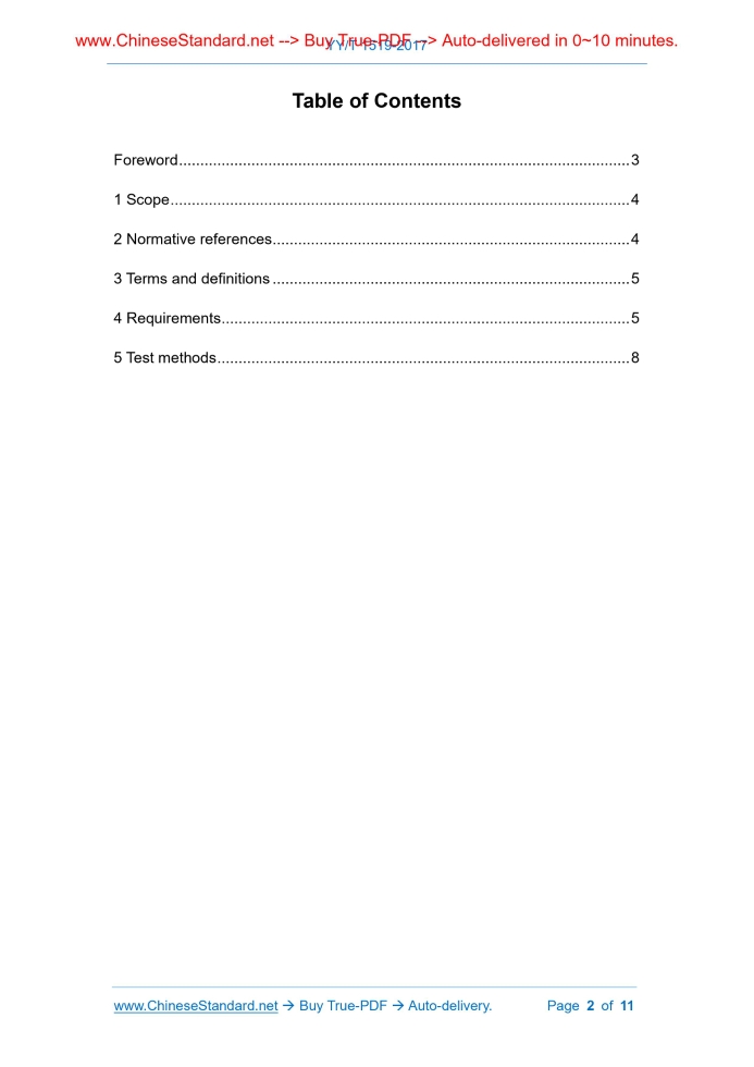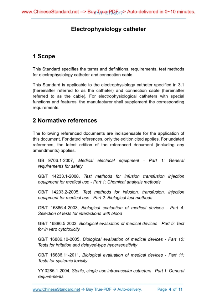 Similar standardsYY/T 1519-2017: Electrophysiology catheter---This is an excerpt. Full copy of true-PDF in English version (including equations, symbols, images, flow-chart, tables, and figures etc.), auto-downloaded/delivered in 9 seconds, can be purchased online: https://www.ChineseStandard.net/PDF.aspx/YYT1519-2017YY PHARMACEUTICAL INDUSTRY STANDARD OF THE PEOPLE’S REPUBLIC OF CHINA ICS 11.040.60 C 39 Electrophysiology catheter Issued on: MARCH 28, 2017 Implemented on: APRIL 1, 2018 Issued by. China Food and Drug Administration Table of ContentsForeword ... 3 1 Scope ... 4 2 Normative references ... 4 3 Terms and definitions ... 5 4 Requirements ... 5 5 Test methods ... 8 Electrophysiology catheter1 ScopeThis Standard specifies the terms and definitions, requirements, test methods for electrophysiology catheter and connection cable. This Standard is applicable to the electrophysiology catheter specified in 3.1 (hereinafter referred to as the catheter) and connection cable (hereinafter referred to as the cable). For electrophysiological catheters with special functions and features, the manufacturer shall supplement the corresponding requirements.2 Normative referencesThe following referenced documents are indispensable for the application of this document. For dated references, only the edition cited applies. For undated references, the latest edition of the referenced document (including any amendments) applies. GB 9706.1-2007, Medical electrical equipment - Part 1. General requirements for safety GB/T 14233.1-2008, Test methods for infusion transfusion injection equipment for medical use - Part 1. Chemical analysis methods GB/T 14233.2-2005, Test methods for infusion, transfusion, injection equipment for medical use - Part 2. Biological test methods GB/T 16886.4-2003, Biological evaluation of medical devices - Part 4. Selection of tests for interactions with blood GB/T 16886.5-2003, Biological evaluation of medical devices - Part 5. Test for in vitro cytotoxicity GB/T 16886.10-2005, Biological evaluation of medical devices - Part 10. Tests for irritation and delayed-type hypersensitivity GB/T 16886.11-2011, Biological evaluation of medical devices - Part 11. Tests for systemic toxicity YY 0285.1-2004, Sterile, single-use intravascular catheters - Part 1. General requirements than 5 MΩ. 4.4 Chemical properties 4.4.1 Reducing substance The test solution is compared with the same volume and the same batch of blank control solution. The difference between the consumption of potassium permanganate solution [c(KMnO4)=0.002 mol/L] shall not exceed 2.0 mL. 4.4.2 Heavy metal The color of the test solution shall not exceed the standard control solution with a mass concentration of ρ(Pb2+)=1 μg/mL. 4.4.3 pH The pH of the test solution is compared with the same batch of blank control solution, and the difference between pH shall not exceed 1.5. 4.4.4 Evaporation residue In 50mL test solution, the total mass of non-volatiles shall not exceed 2 mg. 4.4.5 Ethylene oxide residue (if applicable) The residual amount of ethylene oxide shall be no more than 10 μg/g. 4.4.6 Ultraviolet absorbance When the test solution has a wavelength range of 250 nm to 320 nm, the absorbance shall be no more than 0.1. 4.4.7 Corrosion resistance After the corrosion test, the metal parts of the catheter shall not have corrosion marks. 4.5 Biological performance 4.5.1 Sterile Sterilized catheter shall be sterile. 4.5.2 Pyrogen The catheter shall be pyrogen free. 4.5.3 Cytotoxicity The chemical performance test liquid can be prepared by using only the material in the catheter that is in contact with the human body to prepare the test solution. Adopt the method of No. 2 in Table 1 of GB/T 14233.1-2008. If the finished catheter product is used for verification, the test solution shall be prepared by using the method without destroying the catheter, and immersed according to the method of No. 2 in Table 1 of GB/T 14233.1-2008. 5.4.1 Reducing substance When testing according to 5.2.2 of GB/T 14233.1-2008, it shall meet the requirements of 4.4.1. 5.4.2 Heavy metal When testing according to 5.6.2 of GB/T 14233.1-2008, it shall meet the requirements of 4.4.2. 5.4.3 pH When testing according to 5.4.1 of GB/T 14233.1-2008, it shall meet the requirements of 4.4.3. 5.4.4 Evaporation residue When testing according to 5.5 of GB/T 14233.1-2008, it shall meet the requirements of 4.4.4. 5.4.5 Ethylene oxide residue When testing according to 9 of GB/T 14233.1-2008, it shall meet the requirements of 4.4.5. 5.4.6 Ultraviolet absorbance When testing according to 5.7 of GB/T 14233.1-2008, it shall meet the requirements of 4.4.6. 5.4.7 Corrosion resistance When testing according to Annex A of YY 0285.1-2004, it shall meet the requirements of 4.4.7. 5.5 Biological performance 5.5.1 Sterile According to the method in GB/T 14233.2-2005, the test results shall be sterile. 5.5.2 Pyrogen ......Source: Above contents are excerpted from the full-copy PDF -- translated/reviewed by: www.ChineseStandard.net / Wayne Zheng et al. Tips & Frequently Asked Questions:Question 1: How long will the true-PDF of English version of YY/T 1519-2017 be delivered?Answer: The full copy PDF of English version of YY/T 1519-2017 can be downloaded in 9 seconds, and it will also be emailed to you in 9 seconds (double mechanisms to ensure the delivery reliably), with PDF-invoice.Question 2: Can I share the purchased PDF of YY/T 1519-2017_English with my colleagues?Answer: Yes. The purchased PDF of YY/T 1519-2017_English will be deemed to be sold to your employer/organization who actually paid for it, including your colleagues and your employer's intranet.Question 3: Does the price include tax/VAT?Answer: Yes. Our tax invoice, downloaded/delivered in 9 seconds, includes all tax/VAT and complies with 100+ countries' tax regulations (tax exempted in 100+ countries) -- See Avoidance of Double Taxation Agreements (DTAs): List of DTAs signed between Singapore and 100+ countrie
