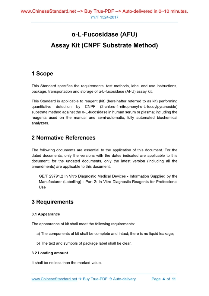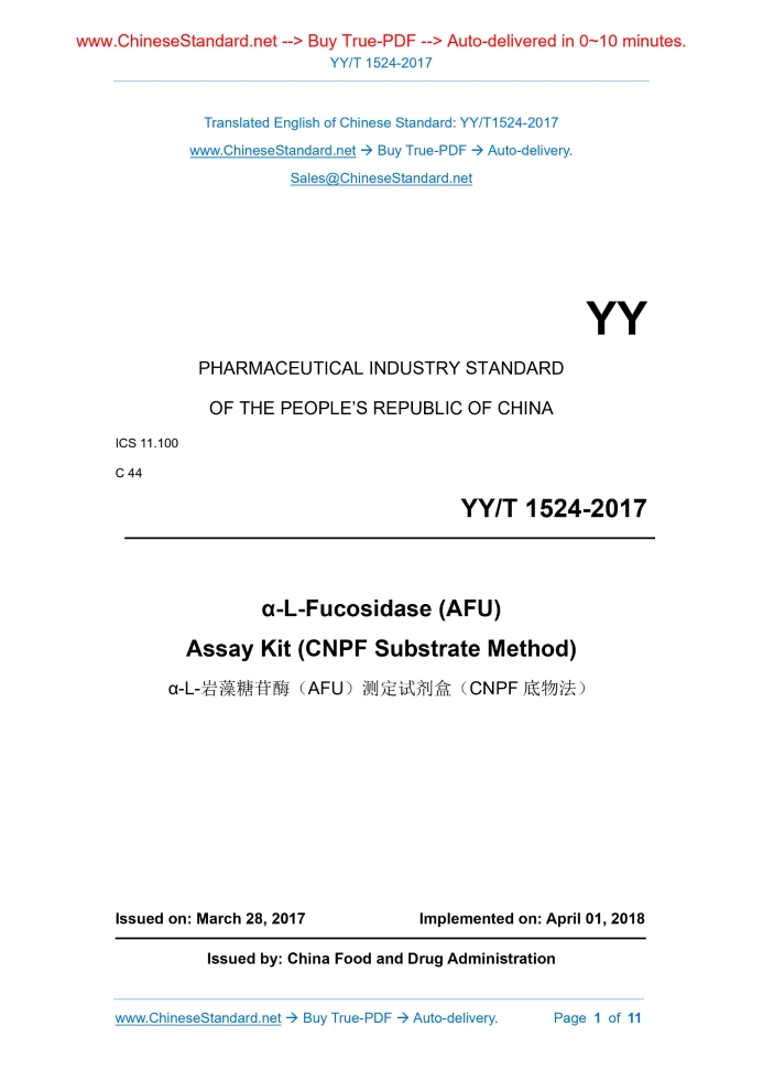 YY/T 1524-2017: a-L-Fucosidase (AFU) Assay Kit (CNPF Substrate Method) Delivery: 9 seconds. True-PDF full-copy in English & invoice will be downloaded + auto-delivered via email. See step-by-step procedure Status: Valid