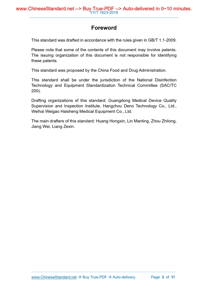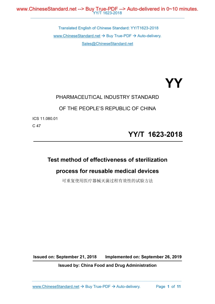Similar standardsYY/T 1623-2018: Test method of effectiveness of sterilization process for reusable medical devices---This is an excerpt. Full copy of true-PDF in English version (including equations, symbols, images, flow-chart, tables, and figures etc.), auto-downloaded/delivered in 9 seconds, can be purchased online: https://www.ChineseStandard.net/PDF.aspx/YYT1623-2018 YY PHARMACEUTICAL INDUSTRY STANDARD OF THE PEOPLE’S REPUBLIC OF CHINA ICS 11.080.01 C 47 Test method of effectiveness of sterilization process for reusable medical devices Issued on: SEPTEMBER 21, 2018 Implemented on: SEPTEMBER 26, 2019 Issued by. China Food and Drug Administration Table of ContentsForeword ... 3 Introduction ... 4 1 Scope ... 5 2 Normative references ... 5 3 Terms and definitions ... 5 4 Overview ... 7 5 Test devices ... 7 6 Reagents ... 7 7 Procedures ... 9ForewordThis standard was drafted in accordance with the rules given in GB/T 1.1-2009. Please note that some of the contents of this document may involve patents. The issuing organization of this document is not responsible for identifying these patents. This standard was proposed by the China Food and Drug Administration. This standard shall be under the jurisdiction of the National Disinfection Technology and Equipment Standardization Technical Committee (SAC/TC 200). Drafting organizations of this standard. Guangdong Medical Device Quality Supervision and Inspection Institute, Hangzhou Deno Technology Co., Ltd., Weihai Weigao Haisheng Medical Equipment Co., Ltd. The main drafters of this standard. Huang Hongxin, Lin Manting, Zhou Zhilong, Jiang Wei, Liang Zexin. Test method of effectiveness of sterilization process for reusable medical devices1 ScopeThis standard specifies test methods of determining the effectiveness of sterilization process for reusable medical devices. This standard applies to tests that have established the effectiveness of the sterilization process, it does not apply to the validation of the sterilization process.2 Normative referencesThe following documents are essential to the application of this document. For the dated documents, only the versions with the dates indicated are applicable to this document; for the undated documents, only the latest version (including all the amendments) are applicable to this standard. GB/T 6682 Water for analytical laboratory use - Specification and test methods GB 18281.2 Sterilization of health care products―Biological indicators - Part 2. Biological indicators for ethylene oxide sterilization processes GB 18281.3 Sterilization of health care products - Biological indicators - Part 3. Biological indicators for moist heat sterilization processes GB 18281.4 Sterilization of health care products - Biological indicators - Part 4. Biological indicators for dry heat sterilization processes The Pharmacopoeia of the People’s Republic of China (2015 version), volume IV3 Terms and definitionsThe following terms and definitions apply to this document. 3.1 Bioburden The total number of microorganisms on or in a product and/or its package.4 Overview4.1 This standard determines the effectiveness of the sterilization process by analyzing the recovery control and the results of the process test cycle. The recovery control shall be greater than or equal to 106 CFU/piece. 4.2 Residual bacterial spores are recovered by flushing, wiping or rinsing by eluents. It may use mechanical shock, ultrasonic and repeated rinsing by eluent to improve the recovery rate. 4.3 After the sample has been processed through a complete sterilization process, it shall use a specific elution technique to recover all residual bacterial spores from the device. 4.4 Use a minimum 5 devices to perform a process test cycle, or otherwise use one device to perform at least 5 consecutive process test cycles. If they are all qualified, this sterilization process is valid. 4.5 The person conducting this standard testing shall have an educational background in microbiology or related professional knowledge. 4.6 The sterility inspection and microbial limit inspection shall comply with the corresponding requirements of the Pharmacopoeia of the People's Republic of China (2015 version), volume IV.5 Test devicesIt shall include at least the following devices. a) Sterile cotton-swabs; b) Pressure steam sterilizer; c) (48 ± 2) °C constant-temperature water-bath; d) (35 ± 2) °C and (55 ± 2) °C bacteria incubator; e) A disposable or reusable sterile membrane filter which has a 0.45 μm pore size; f) Other devices or equipment as specified by the manufacturer of the sterilant, medical device or sterilizer.6 Reagents6.1 Purity of reagents 6.5 Neutralizer For the use of neutralizer, see the Pharmacopoeia of the People's Republic of China (2015 version), volume IV, for the microbiological limit inspection of 1105 non-sterile product. the description of the neutralizer in the microbiological counting method.7 Procedures7.1 Select the devices which require evaluation. 7.2 Read the cleaning instructions for the devices which require evaluation, ensure that all required accessories are complete and available. Follow the manufacturer's instructions to wash and dry the devices. 7.3 Infect the device, the infected part shall include the part of device which is most difficult to sterilize. The number of infected parts shall be determined based on the complexity of the device. The rationale for identifying and proving the parts of the device which are most difficult to sterilize shall be documented. 7.4 For procedures for contamination, elution, control testing, neutralization, growth promotion (sensitivity testing) and process testing cycles, the laboratory shall perform validation and develop standard operating practices. 7.5 Determination of the recovery control 7.5.1 Contamination of surface parts 7.5.1.1 Micropipette method Use a micropipette to directly drop an inoculum which contains more than or equal to 107 CFU onto the surface part to con