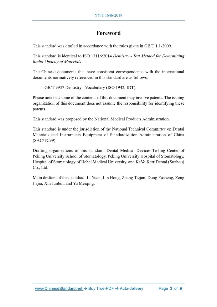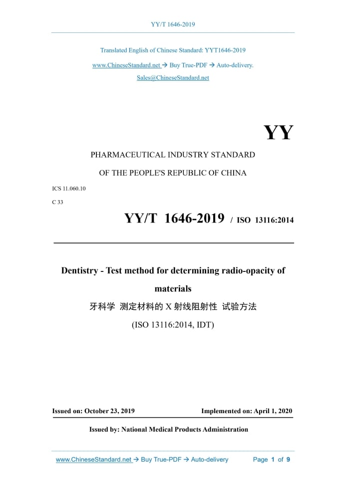 YY/T 1646-2019: Dentistry - Test method for determining radio-opacity of materials Delivery: 9 seconds. True-PDF full-copy in English & invoice will be downloaded + auto-delivered via email. See step-by-step procedure Status: Valid