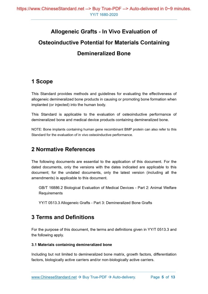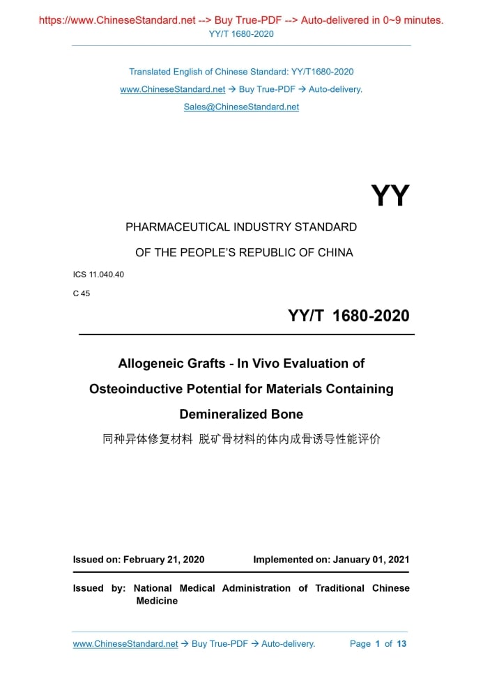 YY/T 1680-2020: Allogeneic Grafts - In Vivo Evaluation of Osteoinductive Potential for Materials Containing Demineralized Bone Delivery: 9 seconds. True-PDF full-copy in English & invoice will be downloaded + auto-delivered via email. See step-by-step procedure Status: Valid