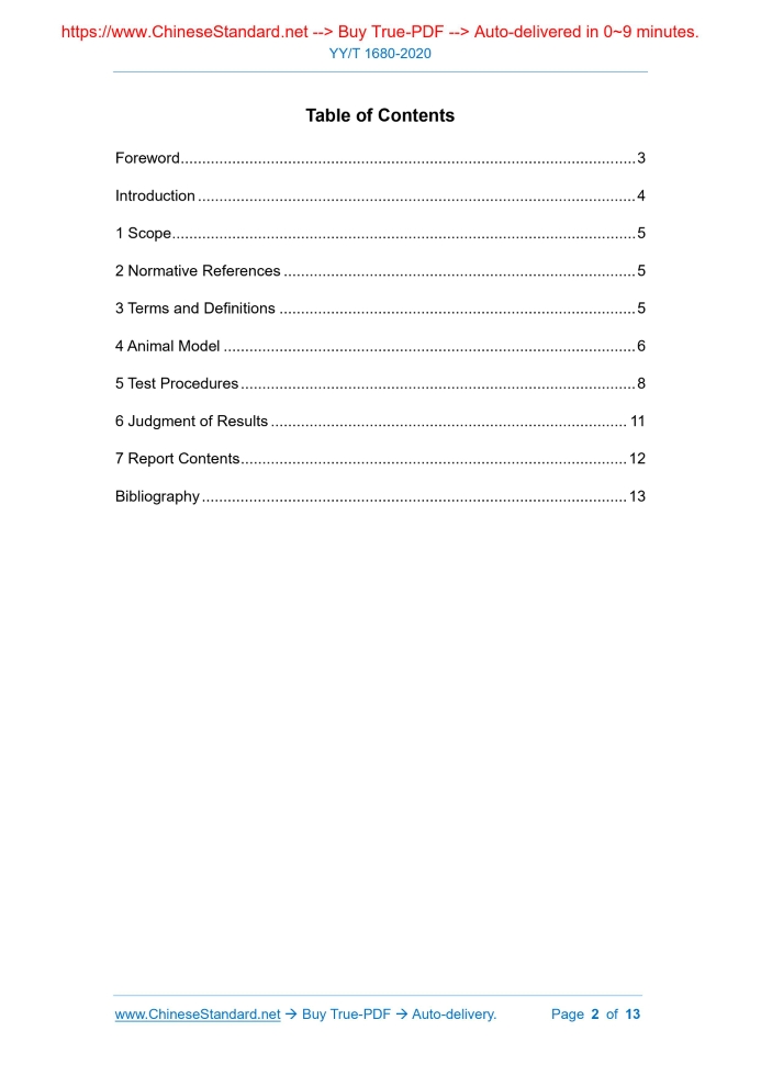 YY/T 1680-2020: Allogeneic Grafts - In Vivo Evaluation of Osteoinductive Potential for Materials Containing Demineralized Bone---This is an excerpt. Full copy of true-PDF in English version (including equations, symbols, images, flow-chart, tables, and figures etc.), auto-downloaded/delivered in 9 seconds, can be purchased online: https://www.ChineseStandard.net/PDF.aspx/YYT1680-2020 YY PHARMACEUTICAL INDUSTRY STANDARD OF THE PEOPLE’S REPUBLIC OF CHINA ICS 11.040.40 C 45 Allogeneic Grafts - In Vivo Evaluation of Osteoinductive Potential for Materials Containing Demineralized Bone ISSUED ON: FEBRUARY 21, 2020 IMPLEMENTED ON: JANUARY 01, 2021 Issued by: National Medical Administration of Traditional Chinese Medicine Table of ContentsForeword ... 3 Introduction ... 4 1 Scope ... 5 2 Normative References ... 5 3 Terms and Definitions ... 5 4 Animal Model ... 6 5 Test Procedures ... 8 6 Judgment of Results ... 11 7 Report Contents ... 12 Bibliography ... 13 Allogeneic Grafts - In Vivo Evaluation of Osteoinductive Potential for Materials Containing Demineralized Bone1 ScopeThis Standard provides methods and guidelines for evaluating the effectiveness of allogeneic demineralized bone products in causing or promoting bone formation when implanted (or injected) into the human body. This Standard is applicable to the evaluation of osteoinductive performance of demineralized bone and medical device products containing demineralized bone. NOTE: Bone implants containing human gene recombinant BMP protein can also refer to this Standard for the evaluation of in vivo osteoinductive performance.2 Normative ReferencesThe following documents are essential to the application of this document. For the dated documents, only the versions with the dates indicated are applicable to this document; for the undated documents, only the latest version (including all the amendments) is applicable to this document. GB/T 16886.2 Biological Evaluation of Medical Devices - Part 2: Animal Welfare Requirements YY/T 0513.3 Allogeneic Grafts - Part 3: Demineralized Bone Grafts3 Terms and DefinitionsFor the purpose of this document, the terms and definitions given in YY/T 0513.3 and the following apply. 3.1 Materials containing demineralized bone Including but not limited to demineralized bone matrix, growth factors, differentiation factors, biologically active carriers and/or non-biologically active carriers. cytotoxic effector cells and graft-versus-host reaction. Therefore, there is no T cell response to exogenous materials. NOTE 1: Athymic animals can still produce an innate immune response (macrophages, giant cells and granular red blood cells), therefore, have the ability to produce an immune response to non-biocompatible or microbial (culture) positive products. NOTE 2: The choice of nude rat or nude mouse as the experimental animal model depends on the size (volume) of the implant to be evaluated. 4.2.2 Male athymic animals should be used in implantation experiments. If female animals are used, it is necessary to prove that their estrus cycle shall not negatively affect the experiment. 4.2.3 Adolescent athymic animals should be used in implantation experiments (age at the time of implantation is 6 ~ 9 weeks). Older animals may not respond effectively to osteoinductive materials. 4.3 Heterotopic implantation site In athymic mouse/rat models, the intermuscular pocket spaces of the gluteal muscle or biceps femoris are suitable implant sites. In clinical applications, there are blood, bone tissue and osteogenic components at the bone tissue implantation site; while the blood, bone tissue and osteogenic components shall cause false positive results during heterotopic implantation. 4.4 Number of implants and sample volume/mass 4.4.1 Number of implants: In the product effectiveness test, 3 independent batches of products should be used for testing. It is recommended to use 3 animals for each batch of products; each animal has 2 implantation sites. The positive control and the negative control are implanted into 3 animals, respectively; and each animal has 2 implantation sites. So that ensure that each group shall have no less than 4 samples for evaluation. NOTE: This design can obtain 83% inclusion probability within the 95% inclusion interval. This allows a 12% difference in the detection of new bone formation. The hypothesis is as follows: newly-formed bone accounts for 40%; the standard deviation is 5%; the statistical significance level is 0.05. 4.4.2 Sample volume/mass: Generally, the mass of the implanted sample containing demineralized bone material is (15±5) mg; and the size of the implanted sample should be 3mm~5mm in length, 3mm~5mm in width, and 1mm~3mm in thickness (powder or granular materials can be added with excipients; and the used excipients shall not contain minerals and osteogenic active substances, which shall not affect the osteoinductive ability of the raw materials). 4.4.3 The test group shall have the same implant dose and shape of demineralized for subsequent implantation operations. The technician shall monitor the animal's breathing during the operation. 5.3.5 Place the anesthetized animal in the prone position on the clean test bench in the operating room and fix it. Wipe the animal back and waist area with iodine solution from the center of the operation to the edge of the operation; and finally wipe off the iodine solution with a clean sterile gauze pad. 5.3.6 The detailed procedures of the gluteus medius and gluteus maximus intermuscular implantation are as follows: Carefully lift the skin above the spine at the back and waist; and make a 0.5cm~1cm long unidirectional incision. Open the skin incision and use the blunt peeling method to create a small pocket gap in the gluteus medius and gluteus maximus tissue parallel to the direction of the muscle fibers, taking care to avoid blood vessels. If there is a small amount of bleeding, stop the bleeding in time and try to remove the blood. The s