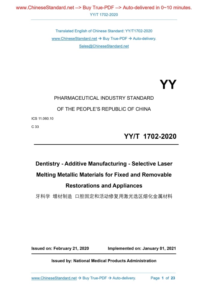 YY/T 1702-2020: Dentistry - Additive Manufacturing - Selective Laser Melting Metallic Materials for Fixed and Removable Restorations and Appliances Delivery: 9 seconds. True-PDF full-copy in English & invoice will be downloaded + auto-delivered via email. See step-by-step procedure Status: Valid