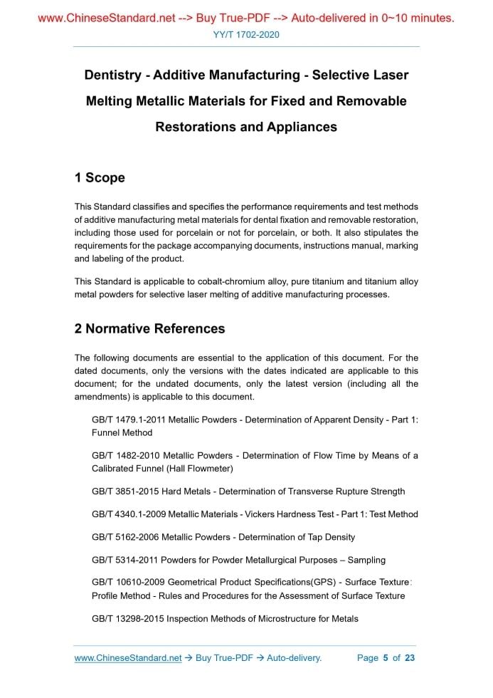YY/T 1702-2020: Dentistry - Additive Manufacturing - Selective Laser Melting Metallic Materials for Fixed and Removable Restorations and Appliances---This is an excerpt. Full copy of true-PDF in English version (including equations, symbols, images, flow-chart, tables, and figures etc.), auto-downloaded/delivered in 9 seconds, can be purchased online: https://www.ChineseStandard.net/PDF.aspx/YYT1702-2020 YY PHARMACEUTICAL INDUSTRY STANDARD OF THE PEOPLE’S REPUBLIC OF CHINA ICS 11.060.10 C 33 Dentistry - Additive Manufacturing - Selective Laser Melting Metallic Materials for Fixed and Removable Restorations and Appliances ISSUED ON: FEBRUARY 21, 2020 IMPLEMENTED ON: JANUARY 01, 2021 Issued by: National Medical Products Administration Table of ContentsForeword ... 3 Introduction ... 4 1 Scope ... 5 2 Normative References ... 5 3 Terms and Definitions ... 6 4 Classification ... 8 5 Requirements ... 9 6 sampling ... 12 7 Preparation of Sample ... 12 8 Test Method ... 15 9 Information and Instruction Manual ... 20 10 Marking and Label ... 22 Bibliography ... 23 Dentistry - Additive Manufacturing - Selective Laser Melting Metallic Materials for Fixed and Removable Restorations and Appliances1 ScopeThis Standard classifies and specifies the performance requirements and test methods of additive manufacturing metal materials for dental fixation and removable restoration, including those used for porcelain or not for porcelain, or both. It also stipulates the requirements for the package accompanying documents, instructions manual, marking and labeling of the product. This Standard is applicable to cobalt-chromium alloy, pure titanium and titanium alloy metal powders for selective laser melting of additive manufacturing processes.2 Normative ReferencesThe following documents are essential to the application of this document. For the dated documents, only the versions with the dates indicated are applicable to this document; for the undated documents, only the latest version (including all the amendments) is applicable to this document. GB/T 1479.1-2011 Metallic Powders - Determination of Apparent Density - Part 1: Funnel Method GB/T 1482-2010 Metallic Powders - Determination of Flow Time by Means of a Calibrated Funnel (Hall Flowmeter) GB/T 3851-2015 Hard Metals - Determination of Transverse Rupture Strength GB/T 4340.1-2009 Metallic Materials - Vickers Hardness Test - Part 1: Test Method GB/T 5162-2006 Metallic Powders - Determination of Tap Density GB/T 5314-2011 Powders for Powder Metallurgical Purposes – Sampling GB/T 10610-2009 Geometrical Product Specifications(GPS) - Surface Texture: Profile Method - Rules and Procedures for the Assessment of Surface Texture GB/T 13298-2015 Inspection Methods of Microstructure for Metals NOTE 2: Except as specified by the equipment manufacturer, the positive direction of x-axis is the direction from left to right when viewing from the front side of the equipment and facing the origin of the forming space. NOTE 3: Usually the x-axis is in the horizontal position. [GB/T 35351-2017, definition 2.3.20] 3.4 y-axis The axis that is perpendicular to the x-axis and z-axis in the coordinate system of the equipment. NOTE 1: Unless otherwise specified by the equipment manufacturer, it usually refers to the y- axis of the equipment. NOTE 2: Except as specified by the equipment manufacturer, the definition of positive direction of the y-axis follows the right-hand rule of the coordinate system in GB/T 19660. Usually, when the z-axis is positively upwards, at this time, when viewing from the front side of the equipment, the direction from the front to the back of the equipment is the positive direction of the y-axis. When the z-axis is positively downwards, at this time, when viewing from the front side of the equipment, the direction from the back to the front of the equipment is the positive direction of the y-axis. NOTE 3: Usually the y-axis is in the horizontal position. [GB/T 35351-2017, definition 2.3.21] 3.5 z-axis The coordinate axis that is perpendicular to the x-axis and y-axis (the plane formed by them) in coordinate system of the equipment. NOTE 1: Unless otherwise specified by the equipment manufacturer, it usually refers to the z- axis of the equipment. NOTE 2: Except as specified by the equipment manufacturer, the definition of the positive direction of z-axis follows the right-hand rule of the coordinate system in GB/T 19660. For a process that uses planes and materials to superimpose layer by layer, the normal direction of the layer is the positive direction of the z-axis. For the process that uses planes and materials to superimpose layer by layer, the positive direction of z-axis points from the first layer to the subsequent layer. NOTE 3: When materials are superimposed from different directions [e.g.: in a directional energy deposition system], the z-axis may be determined according to rotation or rolling in GB/T 19660. snap rings.5 Requirements5.1 Metal powder 5.1.1 Chemical composition Test according to 8.1.1, it shall comply with the provisions of 5.1 in ISO 22674-2016. 5.1.2 Hazardous ingredients Test according to 8.1.1, it shall comply with the provisions of 5.2 in ISO 22674-2016. 5.1.3 Powder appearance Test according to 8.1.2, the powder is even, and there are no visible impurities. 5.1.4 Roundness Test according to 8.1.3, the roundness shall be no less than the claimed value of the manufacturer. 5.1.5 Powder size and distribution Test according to 8.1.4, D10≥12µm; D90≤65µm. 5.1.6 Powder flowability Test according to 8.1.5, cobalt-chromium alloy powder: no more than 40s/50g; titanium and titanium-alloy powder: no more than 50s/50g. 5.1.7 Bulk density of powder Test according to 8.1.6, cobalt-chromium alloy powder: no less than 4.0g/cm3; titanium and titanium alloy powder: no less than 2.2g/cm3. 5.1.8 Tap density of powder Test according to 8.1.7, cobalt-chromium alloy powder: no less than 4.5g/cm3; titanium and titanium alloy powder: