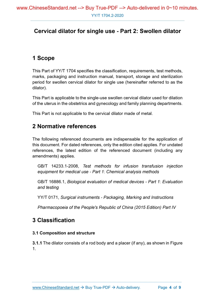 Similar standardsYY/T 1704.2-2020: Cervical dilator for single use - Part 2: Swollen dilator---This is an excerpt. Full copy of true-PDF in English version (including equations, symbols, images, flow-chart, tables, and figures etc.), auto-downloaded/delivered in 9 seconds, can be purchased online: https://www.ChineseStandard.net/PDF.aspx/YYT1704.2-2020YY PHARMACEUTICAL INDUSTRY STANDARD OF THE PEOPLE’S REPUBLIC OF CHINA ICS 11.040.30 C 36 Cervical dilator for single use - Part 2: Swollen dilator ISSUED ON: FEBRUARY 21, 2020 IMPLEMENTED ON: JANUARY 01, 2021 Issued by: National Medical Products Administration Table of ContentsForeword ... 3 1 Scope ... 4 2 Normative references ... 4 3 Classification ... 4 4 Requirements ... 5 5 Test methods ... 7 6 Marks, packaging and instruction manual ... 8 7 Transport, storage ... 8 Cervical dilator for single use - Part 2: Swollen dilator1 ScopeThis Part of YY/T 1704 specifies the classification, requirements, test methods, marks, packaging and instruction manual, transport, storage and sterilization period for swollen cervical dilator for single use (hereinafter referred to as the dilator). This Part is applicable to the single-use swollen cervical dilator used for dilation of the uterus in the obstetrics and gynecology and family planning departments. This Part is not applicable to the cervical dilator made of metal.2 Normative referencesThe following referenced documents are indispensable for the application of this document. For dated references, only the edition cited applies. For undated references, the latest edition of the referenced document (including any amendments) applies. GB/T 14233.1-2008, Test methods for infusion transfusion injection equipment for medical use - Part 1: Chemical analysis methods GB/T 16886.1, Biological evaluation of medical devices - Part 1: Evaluation and testing YY/T 0171, Surgical instruments - Packaging, Marking and Instructions Pharmacopoeia of the People's Republic of China (2015 Edition) Part IV3 Classification3.1 Composition and structure 3.1.1 The dilator consists of a rod body and a placer (if any), as shown in Figure 1. 4.1.1 The rod of the dilator shall be smooth and uniform in color, and there shall be no defects such as cracks and burrs, and the head of the rod shall be smooth. 4.1.2 The dilator placer (if any) shall be smooth and free of sharp edges and burrs. 4.2 Dimensions The length and diameter of the dilator rod shall meet the requirements of Table 1. 4.3 Physical properties 4.3.1 The manufacturer shall specify the use time of the dilator and provide information on the diameter change with time after the rod has absorbed water (during use). 4.3.2 The dilator rod body shall have no cracks in the initial state and the state after water absorption (use time). 4.3.3 The dilator rod body and the placer (if any) shall be firmly connected in the initial state and the state after water absorption (use time). 4.3.4 There shall be no visible falling off after the dilator rod absorbs water. 4.4 Chemical properties 4.4.1 Heavy metals The total content of heavy metals in the dilator extract shall not exceed 1μg/mL. 4.4.2 PH Compare the dilator extract with the blank solution. The difference in pH shall not exceed 1.5. 4.5 Sterilization The dilator shall be sterilized by a confirmed sterilization process, and the sterilized dilator shall be sterile. 4.6 Residual ethylene oxide If the dilator is sterilized by ethylene oxide, the residual amount of ethylene oxide shall not exceed 10μg/g. 4.7 Biological evaluation The final product of the dilator shall be evaluated according to GB/T 16886.1. Take sample. Add water at a ratio: 0.1g of dilator (including placer, if any) to 5mL of water. Keep constant temperature at (37±1)°C for 1h. Separate the sample from water. Cool to room temperature as the extract. Take the same volume of water and place it in a glass container. Prepare blank control solution in the same way. 5.4.2 Heavy metals Test according to the method specified in 5.6.1 of GB/T 14233.1-2008, in accordance with the requirements of 4.4.1. 5.4.3 PH Test according to the method specified in 5.4.1 of GB/T 14233.1-2008, in accordance with the requirements of 4.4.2. 5.5 Sterilization It shall be carried out in accordance with the general principles "sterile test method" of part IV of the "Pharmacopoeia of the People's Republic of China" (Edition 2015), in accordance with the requirements of 4.5. NOTE: Each sterilization batch undergoes an effective monitoring process to make the product sterile. 5.6 Residual ethylene oxide Test according to the method specified in GB/T 14233.1-2008. Use gas chromatography in arbitration, in accordance with the requirements of 4.6. 5.7 Biological evaluation Evaluate according to the corresponding method of biological evaluation, in accordance with the requirements of 4.7.6 Marks, packaging and instruction manualThe marks, packaging and instruction manual of the dilator shall comply with the provisions of YY/T 0171.7 Transport, storage7.1 Transport Packaging and transportation requirements are in accordance with the ......Source: Above contents are excerpted from the full-copy PDF -- translated/reviewed by: www.ChineseStandard.net / Wayne Zheng et al. Tips & Frequently Asked Questions:Question 1: How long will the true-PDF of English version of YY/T 1704.2-2020 be delivered?Answer: The full copy PDF of English version of YY/T 1704.2-2020 can be downloaded in 9 seconds, and it will also be emailed to you in 9 seconds (double mechanisms to ensure the delivery reliably), with PDF-invoice.Question 2: Can I share the purchased PDF of YY/T 1704.2-2020_English with my colleagues?Answer: Yes. The purchased PDF of YY/T 1704.2-2020_English will be deemed to be sold to your employer/organization who actually paid for it, including your colleagues and your employer's intranet.Question 3: Does the price include tax/VAT?Answer: Yes. Our tax invoice, downloaded/delivered in 9 seconds, inclu