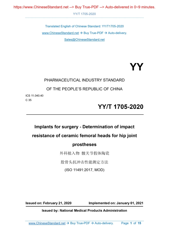 YY/T 1705-2020: Implants for surgery--Determination of impact resistance of ceramic femoral heads for hip joint prostheses Delivery: 9 seconds. True-PDF full-copy in English & invoice will be downloaded + auto-delivered via email. See step-by-step procedure Status: Valid