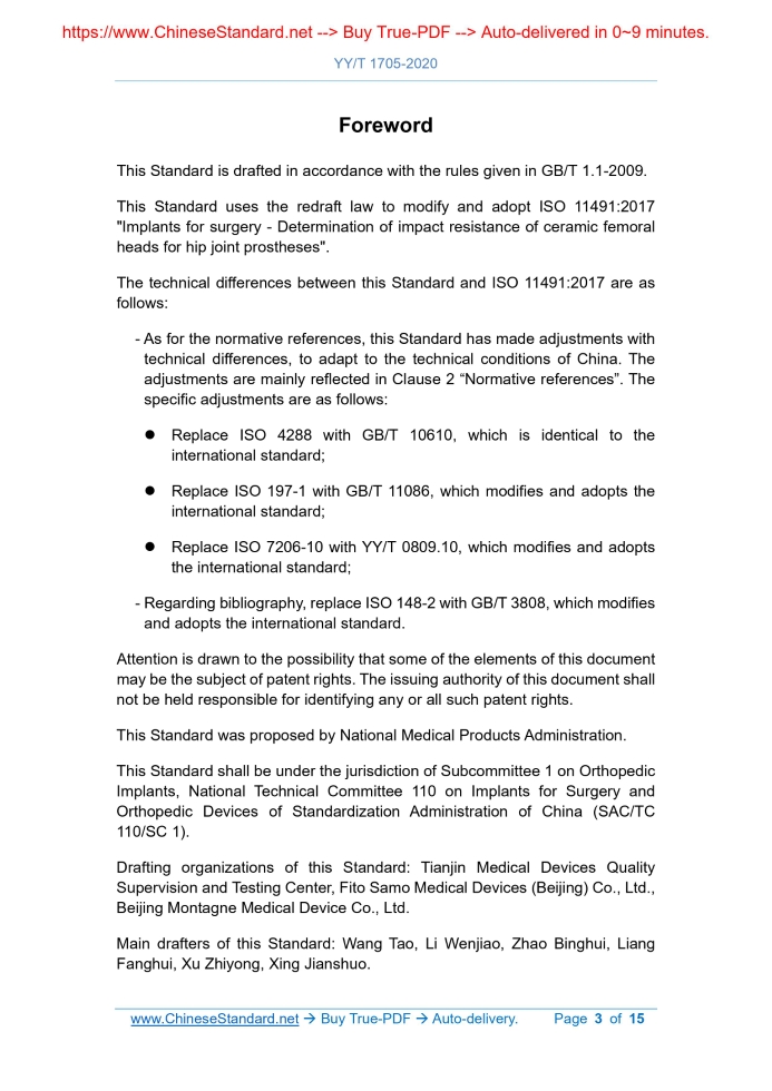 Similar standardsYY/T 1705-2020: Implants for surgery--Determination of impact resistance of ceramic femoral heads for hip joint prostheses---This is an excerpt. Full copy of true-PDF in English version (including equations, symbols, images, flow-chart, tables, and figures etc.), auto-downloaded/delivered in 9 seconds, can be purchased online: https://www.ChineseStandard.net/PDF.aspx/YYT1705-2020 YY PHARMACEUTICAL INDUSTRY STANDARD OF THE PEOPLE’S REPUBLIC OF CHINA ICS 11.040.40 C 35 Implants for surgery - Determination of impact resistance of ceramic femoral heads for hip joint prostheses (ISO 11491:2017, MOD) ISSUED ON: FEBRUARY 21, 2020 IMPLEMENTED ON: JANUARY 01, 2021 Issued by: National Medical Products Administration Table of ContentsForeword ... 3 Introduction ... 4 1 Scope ... 5 2 Normative references ... 5 3 Terms and definitions ... 5 4 Principle ... 6 5 Apparatus and equipment ... 7 6 Procedure ... 11 7 Impact test: Calculation of an impact energy ... 13 8 Test report ... 13 Bibliography ... 15ForewordThis Standard is drafted in accordance with the rules given in GB/T 1.1-2009. This Standard uses the redraft law to modify and adopt ISO 11491:2017 "Implants for surgery - Determination of impact resistance of ceramic femoral heads for hip joint prostheses". The technical differences between this Standard and ISO 11491:2017 are as follows: - As for the normative references, this Standard has made adjustments with technical differences, to adapt to the technical conditions of China. The adjustments are mainly reflected in Clause 2 “Normative references”. The specific adjustments are as follows: Replace ISO 4288 with GB/T 10610, which is identical to the international standard; Replace ISO 197-1 with GB/T 11086, which modifies and adopts the international standard; Replace ISO 7206-10 with YY/T 0809.10, which modifies and adopts the international standard; - Regarding bibliography, replace ISO 148-2 with GB/T 3808, which modifies and adopts the international standard. Attention is drawn to the possibility that some of the elements of this document may be the subject of patent rights. The issuing authority of this document shall not be held responsible for identifying any or all such patent rights. This Standard was proposed by National Medical Products Administration. This Standard shall be under the jurisdiction of Subcommittee 1 on Orthopedic Implants, National Technical Committee 110 on Implants for Surgery and Orthopedic Devices of Standardization Administration of China (SAC/TC 110/SC 1). Drafting organizations of this Standard: Tianjin Medical Devices Quality Supervision and Testing Center, Fito Samo Medical Devices (Beijing) Co., Ltd., Beijing Montagne Medical Device Co., Ltd. Main drafters of this Standard: Wang Tao, Li Wenjiao, Zhao Binghui, Liang Fanghui, Xu Zhiyong, Xing Jianshuo. Implants for surgery - Determination of impact resistance of ceramic femoral heads for hip joint prostheses1 ScopeThis Standard specifies two alternative test methods for determining the impact resistance of ceramic femoral heads for hip joint prostheses. This Standard applies to ceramic femoral heads for hip joint prostheses.2 Normative referencesThe following documents are indispensable for the application of this document. For the dated references, only the editions with the dates indicated are applicable to this document. For the undated references, the latest edition (including all the amendments) are applicable to this document. GB/T 10610 Geometrical product specifications (GPS) - Surface texture: Profile method - Rules and procedures for the assessment of surface texture (GB/T 10610-2009, ISO 4288:1996, IDT) GB/T 11086 Copper and copper alloys - Terms and definitions (GB/T 11086- 2013, ISO 197-1:1983, MOD) YY/T 0809.10 Implants for surgery - Partial and total hip joint prostheses - Part 10: Determination of resistance to static load of modular femoral heads (YY/T 0809.10-2014, ISO 7206-10:2003, MOD)3 Terms and definitionsFor the purposes of this document, the terms and definitions given in YY/T 0809.10 and the following apply. 3.1 Impact energy Potential mechanical energy of the falling/drop weight used for applying the impact. ......Source: Above contents are excerpted from the full-copy PDF -- translated/reviewed by: www.ChineseStandard.net / Wayne Zheng et al. Tips & Frequently Asked Questions:Question 1: How long will the true-PDF of English version of YY/T 1705-2020 be delivered?Answer: The full copy PDF of English version of YY/T 1705-2020 can be downloaded in 9 seconds, and it will also be emailed to you in 9 seconds (double mechanisms to ensure the delivery reliably), with PDF-invoice.Question 2: Can I share the purchased PDF of YY/T 1705-2020_English with my colleagues?Answer: Yes. The purchased PDF of YY/T 1705-2020_English will be deemed to be sold to your employer/organization who actually paid for it, including your colleagues and your employer's intranet.Question 3: Does the price include tax/VAT?Answer: Yes. Our tax invoice, downloaded/delivered in 9 seconds, includes all tax/VAT and complies with 100+ countries' tax regulations (tax exempted in 100+ countries) -- See Avoidance of Double Taxation Agreements (DTAs): List of DTAs signed between Singapore and 100+ countriesQuestion 4: Do you accept my currency other than USD?Answer: Yes. www.ChineseStandard.us -- YY/T 1705-2020 -- Click this link and select your country/currency to pay, the exact amount in your currency will be printed on the invoice. Full PDF will also be downloaded/emailed in 9 seconds.How to buy and download a true PDF of English version of YY/T 1705-2020?A step-by-step guide to download PDF of YY/T 1705-2020_EnglishStep 1: Visit website https://www.ChineseStandard.net (Pay in USD), or https://www.ChineseStandard.us (Pay in any currencies such as Euro, KRW, JPY, AUD).Step 2: Search keyword "YY/T 1705-2020". Step 3: Click "Add to Cart". If multiple PDFs are required, repeat steps 2 and 3 to add up to