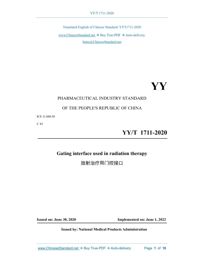 YY/T 1711-2020: Gating interface used in radiation therapy Delivery: 9 seconds. True-PDF full-copy in English & invoice will be downloaded + auto-delivered via email. See step-by-step procedure Status: Valid