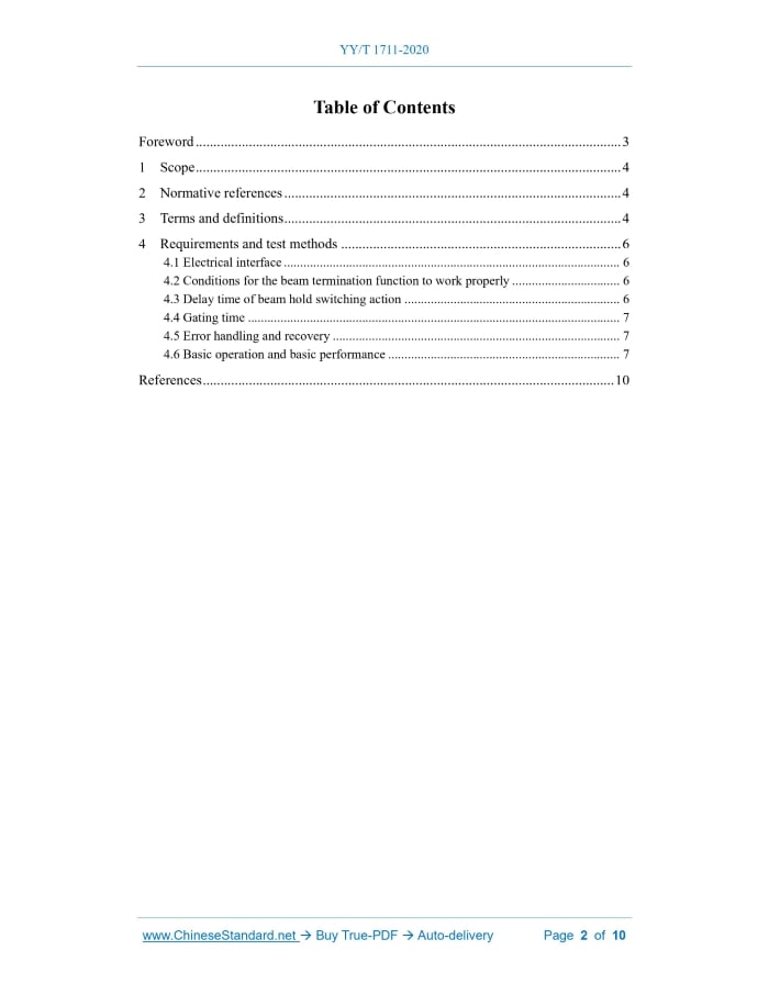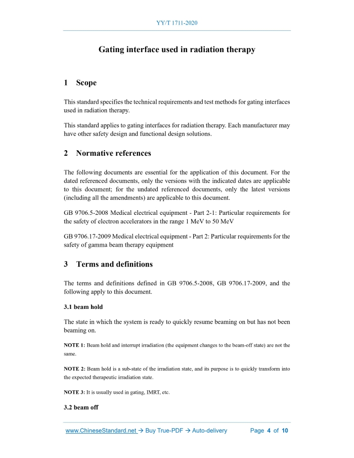 Similar standardsYY/T 1711-2020: Gating interface used in radiation therapy---This is an excerpt. Full copy of true-PDF in English version (including equations, symbols, images, flow-chart, tables, and figures etc.), auto-downloaded/delivered in 9 seconds, can be purchased online: https://www.ChineseStandard.net/PDF.aspx/YYT1711-2020YY PHARMACEUTICAL INDUSTRY STANDARD OF THE PEOPLE'S REPUBLIC OF CHINA ICS 11.040.50 C 43 Gating interface used in radiation therapy ISSUED ON: JUNE 30, 2020 IMPLEMENTED ON: JUNE 1, 2022 Issued by: National Medical Products Administration Table of ContentsForeword ... 3 1 Scope ... 4 2 Normative references ... 4 3 Terms and definitions ... 4 4 Requirements and test methods ... 6 4.1 Electrical interface ... 6 4.2 Conditions for the beam termination function to work properly ... 6 4.3 Delay time of beam hold switching action ... 6 4.4 Gating time ... 7 4.5 Error handling and recovery ... 7 4.6 Basic operation and basic performance ... 7 References ... 10 Gating interface used in radiation therapy1 ScopeThis standard specifies the technical requirements and test methods for gating interfaces used in radiation therapy. This standard applies to gating interfaces for radiation therapy. Each manufacturer may have other safety design and functional design solutions.2 Normative referencesThe following documents are essential for the application of this document. For the dated referenced documents, only the versions with the indicated dates are applicable to this document; for the undated referenced documents, only the latest versions (including all the amendments) are applicable to this document. GB 9706.5-2008 Medical electrical equipment - Part 2-1: Particular requirements for the safety of electron accelerators in the range 1 MeV to 50 MeV GB 9706.17-2009 Medical electrical equipment - Part 2: Particular requirements for the safety of gamma beam therapy equipment3 Terms and definitionsThe terms and definitions defined in GB 9706.5-2008, GB 9706.17-2009, and the following apply to this document. 3.1 beam hold The state in which the system is ready to quickly resume beaming on but has not been beaming on. NOTE 1: Beam hold and interrupt irradiation (the equipment changes to the beam-off state) are not the same. NOTE 2: Beam hold is a sub-state of the irradiation state, and its purpose is to quickly transform into the expected therapeutic irradiation state. NOTE 3: It is usually used in gating, IMRT, etc. 3.2 beam off The radiation source is completely shielded and in a safe protective position. [GB 9706.17-2009, Definition of 2.101] 3.3 beam termination/terminate irradiation The signal that is transmitted from the PPMS (Patient Position Monitoring System) to the TDD (Treatment Delivery Device) to prohibit the start of irradiation or to immediately terminate irradiation. NOTE: TDD in this standard mainly includes medical electron accelerators, light ion therapy systems, gamma ray beam stereotactic radiotherapy systems, cobalt 60 remote machines, and other equipment; PPMS mainly includes optical surface, X-ray transmission, abdominal pressure, magnetic field signals, ultrasound imaging, magnetic resonance imaging, and other position monitoring systems. 3.4 gating interface The purpose of the gating interface is to enable TDD and PPMS to have the following capabilities: a) Perform beam hold or "beam termination/terminate of irradiation" according to the movement of the target area in the patient's body or the position of the patient without operator intervention. b) Switch off the beam in case of error or patient status exceeding deviation limits. NOTE: PPMS can change the beam generation state of TDD through two control methods. Both require hard wiring between PPMS and TDD. The first type is beam gating connection, which is beam hold. It allows the PPMS to temporarily maintain the beam without triggering the beam off. The second type is gating interlocking. It allows the PPMS to require beam termination (i.e., beam off in GB 9706.5-2008) or prohibit beam-on when an error is detected. 3.5 interlock A setting that prevents a device from starting or continuing operation under unspecified conditions. NOTE: A signal that causes the gating device to terminate the beam. Note that when an interlock occurs, the operator is required to take action to confirm the interlock and then resume the treatment after the interlock is cleared. [IEC/TR 60788:2004] 3.6 interrupt irradiation The PPMS sends the signal for interrupt irradiation to TDD, and the restart of irradiation requires user intervention. 4.4 Gating time The TDD manufacturer should provide the minimum value of the beam hold time and other restrictions, and the PPMS manufacturer should provide the corresponding configuration. 4.5 Error handling and recovery 4.5.1 TDD error log If the gating interlock causes abnormal beam termination, TDD shall record it in the event log. 4.5.2 PPMS fail-safe protection When the PPMS requests abnormal beam termination or the system is in a fault state, the PPMS shall be required to: a) Trigger external gating interlock. Whenever the gating interlock is triggered, TDD shall implement beam off. b) Trigger an external beam hold signal to complete beam gating (if applicable). c) Provide status checking of the communication mechanism (if applicable). TDD will implement beam off (or interrupt irradiation) after receiving the PPMS error states. PPMS manufacturers shall design logging and inspection capabilities in their products to effectively analyze potential gating interface errors or failures (if applicable). 4.6 Basic operation and basic performance The interface design between TDD and PPMS can include but is not limited to the following functions: a) The gating interface shall not interfere with the operator's initialization of treatment or imaging procedures. b) With the help of a gating interface, PPMS allows beam hold and "beam termination/terminate irradiation" without additional operato