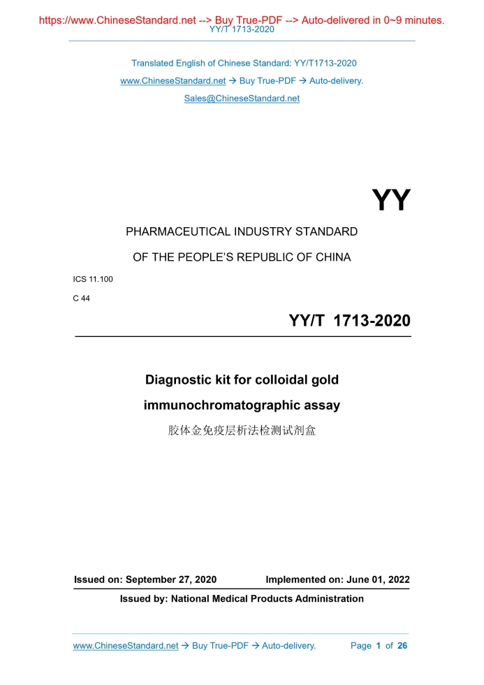 YY/T 1713-2020: Diagnostic kit for colloidal gold immunochromatographic assay Delivery: 9 seconds. True-PDF full-copy in English & invoice will be downloaded + auto-delivered via email. See step-by-step procedure Status: Valid