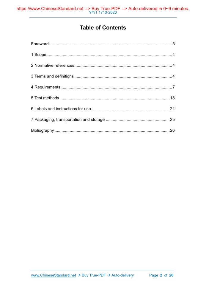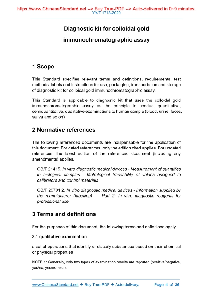 YY/T 1713-2020: Diagnostic kit for colloidal gold immunochromatographic assay---This is an excerpt. Full copy of true-PDF in English version (including equations, symbols, images, flow-chart, tables, and figures etc.), auto-downloaded/delivered in 9 seconds, can be purchased online: https://www.ChineseStandard.net/PDF.aspx/YYT1713-2020YY PHARMACEUTICAL INDUSTRY STANDARD ICS 11.100 C 44 Diagnostic kit for colloidal gold immunochromatographic assay Issued on. SEPTEMBER 27, 2020 Implemented on. JUNE 01, 2022 Issued by. National Medical Products Administration Table of ContentsForeword... 3 1 Scope... 4 2 Normative references... 4 3 Terms and definitions... 4 4 Requirements... 7 5 Test methods... 18 6 Labels and instructions for use... 24 7 Packaging, transportation and storage... 25 Bibliography... 26ForewordThis Standard was drafted in accordance with the rules given in GB/T 1.1-2009. Attention is drawn to the possibility that some of the elements of this Standard may be the subject of patent rights. The issuing authority shall not be held responsible for identifying any or all such patent rights. This Standard was proposed by National Medical Products Administration. This Standard shall be under the jurisdiction of National Technical Committee on Medical Clinical Laboratory and In Vitro Diagnostic System of Standardization Administration of China (SAC/TC 136). The drafting organizations of this Standard. Beijing Medical Device Technology Review Center, Beijing Medical Device Inspection Institute, China Institute of Food and Drug Test, Zhengzhou Antu Biological Engineering Co., Ltd., Roche Diagnostics (Shanghai) Co., Ltd., Jidan Biotechnology Co., Ltd. Main drafters of this Standard. Sun Rong, Liu Yanchun, Shen Shu, Li Xiaoxia, Tian Wei, Wang Luhai. Diagnostic kit for colloidal gold immunochromatographic assay1 ScopeThis Standard specifies relevant terms and definitions, requirements, test methods, labels and instructions for use, packaging, transportation and storage of diagnostic kit for colloidal gold immunochromatographic assay. This Standard is applicable to diagnostic kit that uses the colloidal gold immunochromatographic assay as the principle to conduct quantitative, semiquantitative, qualitative examinations to human sample (blood, urine, feces, saliva and so on).2 Normative referencesThe following referenced documents are indispensable for the application of this document. For dated references, only the edition cited applies. For undated references, the latest edition of the referenced document (including any amendments) applies. GB/T 21415, In vitro diagnostic medical devices - Measurement of quantities in biological samples - Metrological traceability of values assigned to calibrators and control materials GB/T 29791.2, In vitro diagnostic medical devices - Information supplied by the manufacturer (labelling) - Part 2.In vitro diagnostic reagents for professional use3 Terms and definitionsFor the purposes of this document, the following terms and definitions apply. 3.1 qualitative examination a set of operations that identify or classify substances based on their chemical or physical properties 3.2 semiquantitative examination essentially, it is a qualitative test that adds options for the degree of response (positive degree, dilution to obtain a positive result, or comparison with the color card); the reaction results can be presented using ordinal tables and so on Example. The examination result can be reported as "-" "±" "+" "++". 3.3 quantitative examination a set of operations that measure the amount or concentration of an analyte and express it in a digital value of the appropriate measurement unit [GB/T 29791.1-2013, definition A.3.45] 3.5 c5-c95 interval the concentration range of the analyte near the cutoff can be considered that more than 95% of the examination results of the analyte outside this concentration range are negative (concentration< c5) or more than 95% are positive (concentration >c95) 3.6 limit of detection the measured value obtained from a given measurement program; for this value, given that the false positive probability of a certain component in the claimed substance is α, the false positive probability of the non-existent component is β 3.8 analytical specificity the ability of the examination procedure to only examine or measure the presence of the measurand when there are other quantities in the sample [GB/T 29791.1-2013, definition A.2.6]4 Requirements4.1 Diagnostic kit for qualitative examination 4.1.1 Appearance Meet the normal appearance requirements specified by the manufacturer. 4.1.2 Net content (when applicable) If the kit contains liquid components, the volume shall meet the following requirements. 4.1.3 Film strip width The manufacturer shall specify the width of the film strip (lower limit or deviation). The random test shall be no less than the manufacturer's claim. 4.1.6 Compliance rate of negative reference products (when applicable) Separately examine different reference products/samples used to evaluate the negative coincidence rate of reagents once each. The examination results shall all be negative. 4.1.8 Analytical specificity (when applicable) Examine the negative reference product/sample containing a certain concentration/level of cross-reactant 3 times. The examination result shall not be positive. 4.1.9 High dose hook effect (when applicable) Examine the high concentration/level positive reference product/sample claimed by the manufacturer 3 times. There shall be no false negatives in the examination results. 4.1.10 Repeatability Test the negative and weakly positive reference products/samples with the indicated concentration/level at least 10 times. The coincidence rate of negative and positive results shall not be less than 95%. The repeatability concentration/level setting and result judgment shall follow the following principles. 4.2.6 Analytical specificity (when applicable) Examine the negative reference product/sa