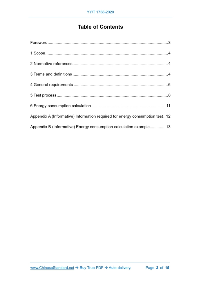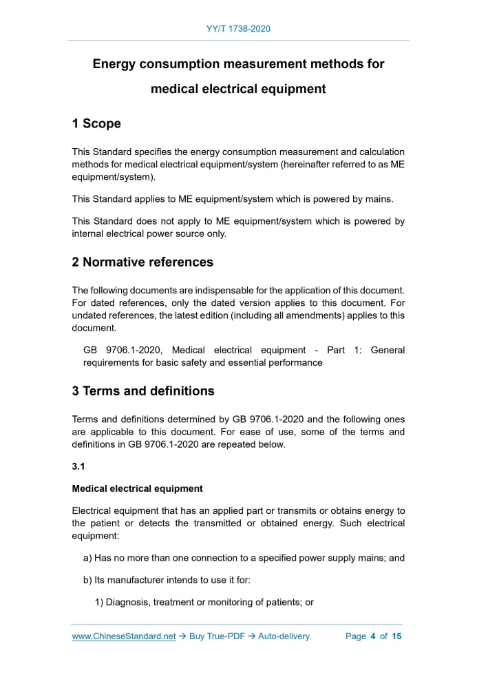 YY/T 1738-2020: Energy consumption measurement methods for medical electrical equipment---This is an excerpt. Full copy of true-PDF in English version (including equations, symbols, images, flow-chart, tables, and figures etc.), auto-downloaded/delivered in 9 seconds, can be purchased online: https://www.ChineseStandard.net/PDF.aspx/YYT1738-2020YY PHARMACEUTICAL INDUSTRY STANDARD OF THE PEOPLE’S REPUBLIC OF CHINA ICS 11.040 C 30 Energy consumption measurement methods for medical electrical equipment ISSUED ON: SEPTEMBER 27, 2020 IMPLEMENTED ON: SEPTEMBER 01, 2021 Issued by: National Medical Products Administration Table of ContentsForeword ... 3 1 Scope ... 4 2 Normative references ... 4 3 Terms and definitions ... 4 4 General requirements ... 6 5 Test process ... 8 6 Energy consumption calculation ... 11 Appendix A (Informative) Information required for energy consumption test .. 12 Appendix B (Informative) Energy consumption calculation example ... 13 Energy consumption measurement methods for medical electrical equipment1 ScopeThis Standard specifies the energy consumption measurement and calculation methods for medical electrical equipment/system (hereinafter referred to as ME equipment/system). This Standard applies to ME equipment/system which is powered by mains. This Standard does not apply to ME equipment/system which is powered by internal electrical power source only.2 Normative referencesThe following documents are indispensable for the application of this document. For dated references, only the dated version applies to this document. For undated references, the latest edition (including all amendments) applies to this document. GB 9706.1-2020, Medical electrical equipment - Part 1: General requirements for basic safety and essential performance3 Terms and definitionsTerms and definitions determined by GB 9706.1-2020 and the following ones are applicable to this document. For ease of use, some of the terms and definitions in GB 9706.1-2020 are repeated below. 3.1 Medical electrical equipment Electrical equipment that has an applied part or transmits or obtains energy to the patient or detects the transmitted or obtained energy. Such electrical equipment: a) Has no more than one connection to a specified power supply mains; and b) Its manufacturer intends to use it for: 1) Diagnosis, treatment or monitoring of patients; or Off mode The mode where the ME equipment/system is turned off according to the manufacturer’s regulations, and the ME equipment/system is connected to the mains. 3.7 Standby mode The mode where the ME equipment/system is ready for operation according to the manufacturer's regulations, but the operating mode is not yet started. 3.8 Operating mode The mode where the ME equipment/system is connected to the mains to perform the functions that are specified by the manufacturer. 3.9 Low power consumption mode The mode where the energy consumption of the ME equipment/system is lower than the standby mode when it is set manually or when it has not been operated for a period of time according to the manufacturer’s regulations. 3.10 Charging mode When the power of the internal electrical power source of the ME equipment/system drops to the point where it cannot operate normally, charge the internal electrical power source of the ME equipment/system according to the manufacturer’s regulations until the internal electrical power source is fully charged. Note: For the internal electrical power source that needs to be removed from the ME equipment/system for charging, do not count the energy consumption of the charging mode.4 General requirements4.1 Environmental requirements c) Connect the test equipment to the mains input end of the ME equipment/system, to ensure that all energy consumption of the ME equipment/system is collected. d) Restore the unspecified setting parameters to the factory default values; any energy-saving measures that affect the normal operation of the ME equipment/system shall not be activated.5 Test processTest the power or power consumption of the ME equipment/system in each mode in the following order. Note: Except for the operating mode, other modes are not necessary. 5.1 Off mode Perform according to the following tests: a) Connect necessary accessories and loads as specified by the manufacturer. b) Connect to the mains; if the ME equipment/system has an internal electrical power source, make sure that the internal electrical power source is fully charged. c) Turn off the ME equipment/system power supply in off mode according to the requirements of the manufacturer’s attached documents; keep the ME equipment/system connected to the mains. d) Start measuring the energy consumption of the ME equipment/system. If the power of the ME equipment/system changes cyclically in the current mode, test at least one cycle and not less than 15 minutes. Record the test time (T off mode test time) and the electric energy that is consumed by the ME equipment/system during the test time (E off mode) or the average power (P off mode AVG). e) If there is no cyclic change, test for at least 15 minutes. Record the electric power that is consumed by the ME equipment/system during the test time (E off mode) or the maximum power (P off mode MAX). 5.2 Standby mode Perform according to the following tests: a) Connect necessary accessories and loads as specified by the manufacturer. operating period and record the test time (T operating mode test time) and the electric power that is consumed by the ME equipment/system during the test time (E operating mode) or the average power (P operating mode AVG); if the power does not change cyclically in the current mode, test the power during the entire operating period and record the electric power that is consumed by the ME equipment/system during the test time (E operating mode) or the maximum power (P operating mode MAX). 5.4 Low power consumption mode Perform according to the following tests: a) Connect necessary ac