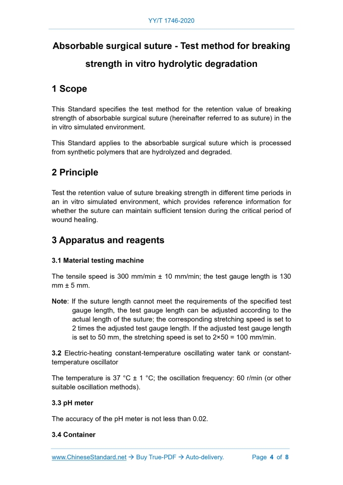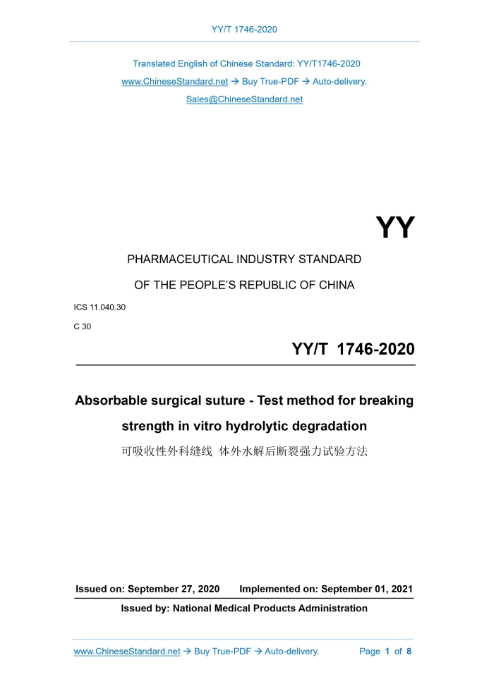 YY/T 1746-2020: Absorbable surgical suture - Test method for breaking strength in vitro hydrolytic degradation Delivery: 9 seconds. True-PDF full-copy in English & invoice will be downloaded + auto-delivered via email. See step-by-step procedure Status: Valid