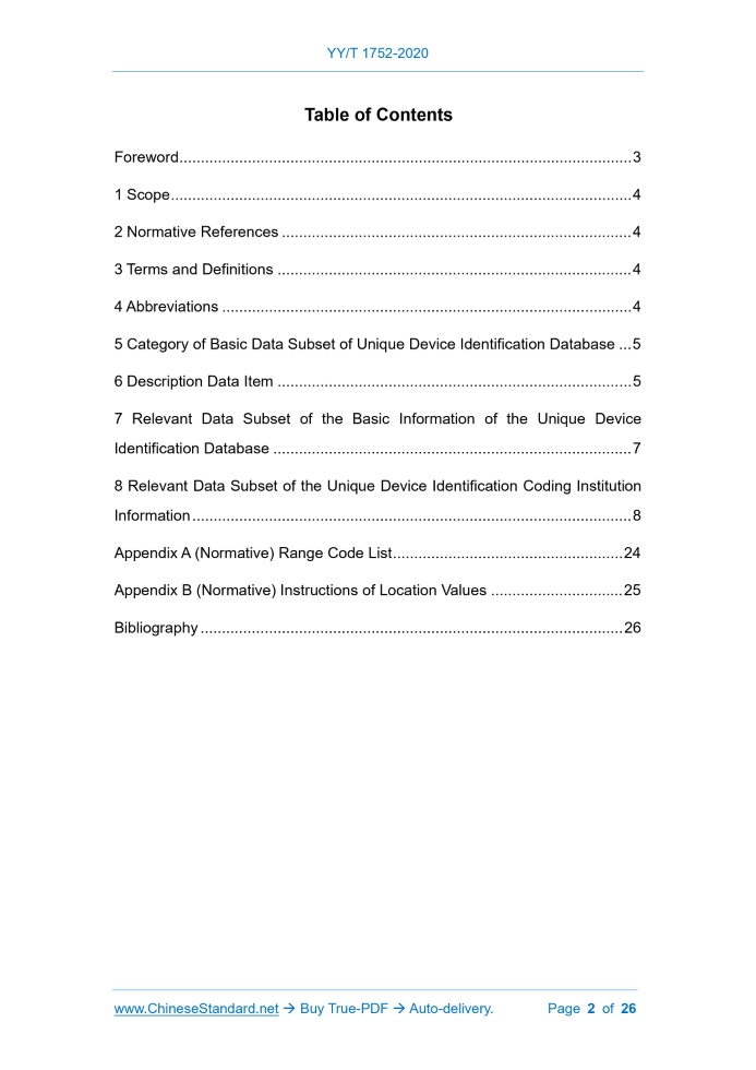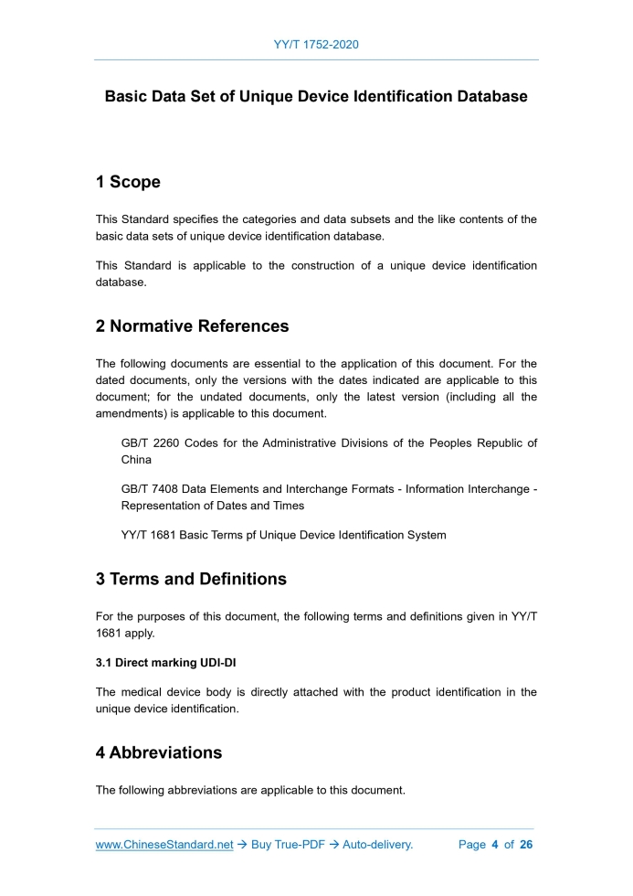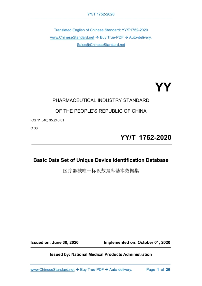 Similar standardsYY/T 1752-2020: Basic Data Set of Unique Device Identification Database---This is an excerpt. Full copy of true-PDF in English version (including equations, symbols, images, flow-chart, tables, and figures etc.), auto-downloaded/delivered in 9 seconds, can be purchased online: https://www.ChineseStandard.net/PDF.aspx/YYT1752-2020YY PHARMACEUTICAL INDUSTRY STANDARD ICS 11.040; 35.240.01 C 30 Basic Data Set of Unique Device Identification Database Issued on. JUNE 30, 2020 Implemented on. OCTOBER 01, 2020 Issued by. National Medical Products Administration Table of ContentsForeword... 3 1 Scope... 4 2 Normative References... 4 3 Terms and Definitions... 4 4 Abbreviations... 4 5 Category of Basic Data Subset of Unique Device Identification Database... 5 6 Description Data Item... 5 7 Relevant Data Subset of the Basic Information of the Unique Device Identification Database... 7 8 Relevant Data Subset of the Unique Device Identification Coding Institution Information... 8 Appendix A (Normative) Range Code List... 24 Appendix B (Normative) Instructions of Location Values... 25 Bibliography... 26ForewordThis Standard was drafted as per the rules specified in GB/T 1.1-2009. Please note some contents of this document may involve patents. The issuing agency of this document shall not assume the responsibility to identify these patents. This Standard was proposed by National Medical Products Administration. This Standard shall be under the jurisdiction of Information Centre of National Medical Products Administration. Drafting organizations of this Standard. Information Centre of National Medical Products Administration; China National Institute of Standardization; and Chinese PLA General Hospital. Chief drafting staffs of this Standard. Chen Feng, Guo Yuanyuan, Zhang Yuan, He Kunlun, Liu Liang, Zhang Wensi, Li Dandan, Liu Peng, and Li Qiang. Basic Data Set of Unique Device Identification Database1 ScopeThis Standard specifies the categories and data subsets and the like contents of the basic data sets of unique device identification database. This Standard is applicable to the construction of a unique device identification database.2 Normative ReferencesThe following documents are essential to the application of this document. For the dated documents, only the versions with the dates indicated are applicable to this document; for the undated documents, only the latest version (including all the amendments) is applicable to this document. GB/T 2260 Codes for the Administrative Divisions of the Peoples Republic of China GB/T 7408 Data Elements and Interchange Formats - Information Interchange - Representation of Dates and Times YY/T 1681 Basic Terms pf Unique Device Identification System3 Terms and DefinitionsFor the purposes of this document, the following terms and definitions given in YY/T 1681 apply. 3.1 Direct marking UDI-DI The medical device body is directly attached with the product identification in the unique device identification.4 AbbreviationsThe following abbreviations are applicable to this document.5 Category of Basic Data Subset of Unique Device Identification DatabaseThe basic data set of the unique device identification database mainly includes the basic information of the unique device identification database, the contact information of the device registrant/filer, and the data subset of the unique device identification coding institution information. The specific categories are shown in Table 1.6 Description Data Item6.1 Short name of data item The Chinese Pinyin acronym of the Chinese name of the data item (ignoring the symbol) is used as the field name in the construction of the unique device identification database. 6.2 Description of data item Describe the definition or purpose of the data item. 6.3 Data type It represents the symbols, characters or other types of data items, see Table 2.7 Relevant Data Subset of the Basic Information of the Unique Device Identification Database7.1 Data subset of the basic information of the unique device identification database The data subset of the basic information of the unique device identification database mainly includes. basic information of product identification, basic information of product, packaging product identification and its packaging level association information, basic information of clinical use, etc., see Table 4 for details, of which.8 Relevant Data Subset of the Unique DeviceIdentification Coding Institution Information The data subset of the unique device identification coding institution information mainly includes. the basic information of the issuing agency, and the basic information of the relevant contact person. ......Source: Above contents are excerpted from the full-copy PDF -- translated/reviewed by: www.ChineseStandard.net / Wayne Zheng et al. Tips & Frequently Asked Questions:Question 1: How long will the true-PDF of English version of YY/T 1752-2020 be delivered?Answer: The full copy PDF of English version of YY/T 1752-2020 can be downloaded in 9 seconds, and it will also be emailed to you in 9 seconds (double mechanisms to ensure the delivery reliably), with PDF-invoice.Question 2: Can I share the purchased PDF of YY/T 1752-2020_English with my colleagues?Answer: Yes. The purchased PDF of YY/T 1752-2020_English will be deemed to be sold to your employer/organization who actually paid for it, including your colleagues and your employer's intranet.Question 3: Does the price include tax/VAT?Answer: Yes. Our tax invoice, downloaded/delivered in 9 seconds, includes all tax/VAT and complies with 100+ countries' tax regulations (tax exempted in 100+ countries) -- See Avoidance of Double Taxation Agreements (DTAs): List of DTAs signed between Singapore and 100+ countriesQuestion 4: Do you accept my currency other than USD?Answer: Yes. www.ChineseStandard.us -- YY/T 1752-2020 -- Click this link and select your country/currency to pay, the exact amount in your currency will be printed on the invo