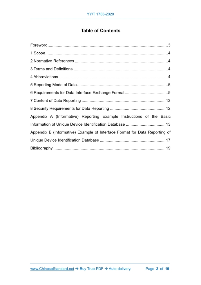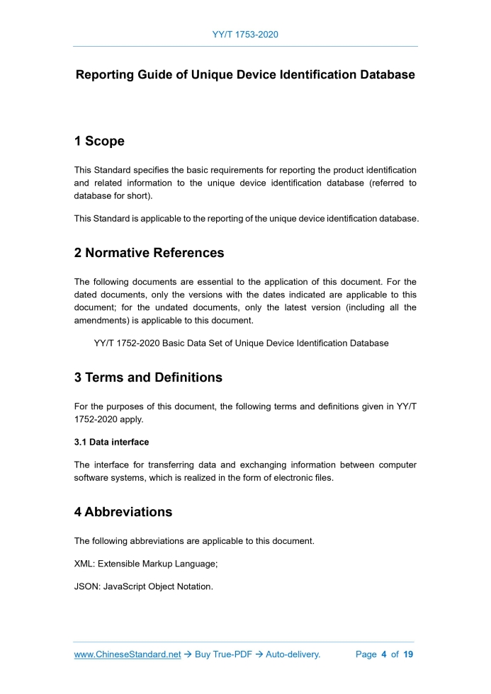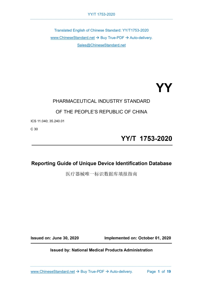 Similar standardsYY/T 1753-2020: Reporting Guide of Unique Device Identification Database---This is an excerpt. Full copy of true-PDF in English version (including equations, symbols, images, flow-chart, tables, and figures etc.), auto-downloaded/delivered in 9 seconds, can be purchased online: https://www.ChineseStandard.net/PDF.aspx/YYT1753-2020YY PHARMACEUTICAL INDUSTRY STANDARD ICS 11.040; 35.240.01 C 30 Reporting Guide of Unique Device Identification Database Issued on. JUNE 30, 2020 Implemented on. OCTOBER 01, 2020 Issued by. National Medical Products Administration Table of ContentsForeword... 3 1 Scope... 4 2 Normative References... 4 3 Terms and Definitions... 4 4 Abbreviations... 4 5 Reporting Mode of Data... 5 6 Requirements for Data Interface Exchange Format... 5 7 Content of Data Reporting... 12 8 Security Requirements for Data Reporting... 12 Appendix A (Informative) Reporting Example Instructions of the Basic Information of Unique Device Identification Database... 13 Appendix B (Informative) Example of Interface Format for Data Reporting of Unique Device Identification Database... 17 Bibliography... 19ForewordThis Standard was drafted as per the rules specified in GB/T 1.1-2009. Please note some contents of this document may involve patents. The issuing agency of this document shall not assume the responsibility to identify these patents. This Standard was proposed by National Medical Products Administration. This Standard shall be under the jurisdiction of Information Centre of National Medical Products Administration. Drafting organizations of this Standard. Information Centre of National Medical Products Administration; China National Institute of Standardization; and Chinese PLA General Hospital. Chief drafting staffs of this Standard. Chen Feng, Guo Yuanyuan, Zhang Yuan, He Kunlun, Liu Liang, Zhang Wensi, Li Dandan, Li Qiang, and Liu Peng. Reporting Guide of Unique Device Identification Database1 ScopeThis Standard specifies the basic requirements for reporting the product identification and related information to the unique device identification database (referred to database for short). This Standard is applicable to the reporting of the unique device identification database.2 Normative ReferencesThe following documents are essential to the application of this document. For the dated documents, only the versions with the dates indicated are applicable to this document; for the undated documents, only the latest version (including all the amendments) is applicable to this document. YY/T 1752-2020 Basic Data Set of Unique Device Identification Database3 Terms and DefinitionsFor the purposes of this document, the following terms and definitions given in YY/T 1752-2020 apply.4 AbbreviationsThe following abbreviations are applicable to this document.5 Reporting Mode of DataIt may be reported by three modes. webpage reporting, data template import and data interface exchange.6 Requirements for Data Interface Exchange Format6.1 XML format When using the XML format to transmit the data records corresponding to the database basic information data subset, the data records shall be described as the udid element. The XML format rules of the udid element are shown in Figure 1, and the specific description can refer to B.1, where.7 Content of Data ReportingThe content of data reporting for the unique device identification database shall include the content of 7.1 in YY/T 1752-2020.8 Security Requirements for Data Reporting8.1 Access authentication During data transmission, the database shall authenticate the applicant and verify the corresponding request authority. 8.3 Transmission security Data transmission shall use a secure transmission protocol. 8.4 Message status receipt During data exchange, the database shall return a message status receipt containing the processing result to the applicant. ......Source: Above contents are excerpted from the full-copy PDF -- translated/reviewed by: www.ChineseStandard.net / Wayne Zheng et al. Tips & Frequently Asked Questions:Question 1: How long will the true-PDF of English version of YY/T 1753-2020 be delivered?Answer: The full copy PDF of English version of YY/T 1753-2020 can be downloaded in 9 seconds, and it will also be emailed to you in 9 seconds (double mechanisms to ensure the delivery reliably), with PDF-invoice.Question 2: Can I share the purchased PDF of YY/T 1753-2020_English with my colleagues?Answer: Yes. The purchased PDF of YY/T 1753-2020_English will be deemed to be sold to your employer/organization who actually paid for it, including your colleagues and your employer's intranet.Question 3: Does the price include tax/VAT?Answer: Yes. Our tax invoice, downloaded/delivered in 9 seconds, includes all tax/VAT and complies with 100+ countries' tax regulations (tax exempted in 100+ countries) -- See Avoidance of Double Taxation Agreements (DTAs): List of DTAs signed between Singapore and 100+ countriesQuestion 4: Do you accept my currency other than USD?Answer: Yes. www.ChineseStandard.us -- YY/T 1753-2020 -- Click this link and select your country/currency to pay, the exact amount in your currency will be printed on the invoice. Full PDF will also be downloaded/emailed in 9 seconds.How to buy and download a true PDF of English version of YY/T 1753-2020?A step-by-step guide to download PDF of YY/T 1753-2020_EnglishStep 1: Visit website https://www.ChineseStandard.net (Pay in USD), or https://www.ChineseStandard.us (Pay in any currencies such as Euro, KRW, JPY, AUD).Step 2: Search keyword "YY/T 1753-2020". Step 3: Click "Add to Cart". If multiple PDFs are required, repeat steps 2 and 3 to add up to 12 PDFs to cart. Step 4: Select payment option (Via payment agents Stripe or PayPal). Step 5: Customize Tax Invoice -- Fill up your email etc. Step 6: Click "Checkout". Step 7: Make payment by credit card, PayPal, Google Pay etc. After the payment is completed and in 9 seconds, you will receive 2 emails attached with the purchased PD