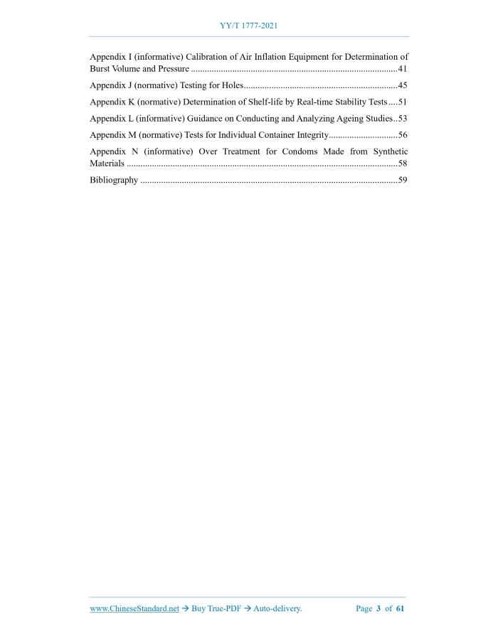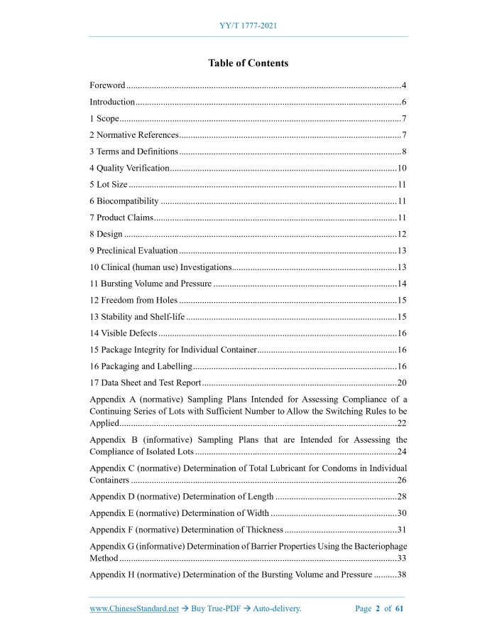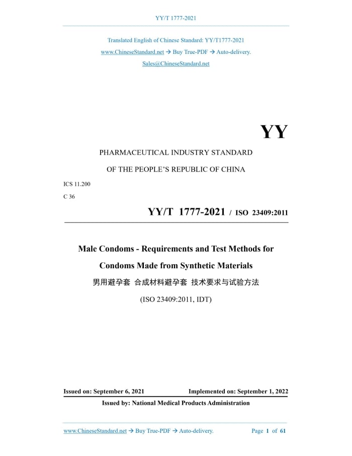 Similar standardsYY/T 1777-2021: Male condoms - Requirements and test methods for condoms made from synthetic materials---This is an excerpt. Full copy of true-PDF in English version (including equations, symbols, images, flow-chart, tables, and figures etc.), auto-downloaded/delivered in 9 seconds, can be purchased online: https://www.ChineseStandard.net/PDF.aspx/YYT1777-2021 YY PHARMACEUTICAL INDUSTRY STANDARD ICS 11.200 C 36 YY/T 1777-2021 / ISO 23409.2011 Male Condoms - Requirements and Test Methods for Condoms Made from Synthetic Materials (ISO 23409.2011, IDT) Issued on. SEPTEMBER 6, 2021 Implemented on. SEPTEMBER 1, 2022 Issued by. National Medical Products Administration Table of ContentsForeword... 4 Introduction... 6 1 Scope... 7 2 Normative References... 7 3 Terms and Definitions... 8 4 Quality Verification... 10 5 Lot Size... 11 6 Biocompatibility... 11 7 Product Claims... 11 8 Design... 12 9 Preclinical Evaluation... 13 10 Clinical (human use) Investigations... 13 11 Bursting Volume and Pressure... 14 12 Freedom from Holes... 15 13 Stability and Shelf-life... 15 14 Visible Defects... 16 15 Package Integrity for Individual Container... 16 16 Packaging and Labelling... 16 17 Data Sheet and Test Report... 20 Appendix A (normative) Sampling Plans Intended for Assessing Compliance of a Continuing Series of Lots with Sufficient Number to Allow the Switching Rules to be Applied... 22 Appendix B (informative) Sampling Plans that are Intended for Assessing the Compliance of Isolated Lots... 24 Appendix C (normative) Determination of Total Lubricant for Condoms in Individual Containers... 26 Appendix D (normative) Determination of Length... 28 Appendix E (normative) Determination of Width... 30 Appendix F (normative) Determination of Thickness... 31 Appendix G (informative) Determination of Barrier Properties Using the Bacteriophage Method... 33 Appendix H (normative) Determination of the Bursting Volume and Pressure... 38 Appendix I (informative) Calibration of Air Inflation Equipment for Determination of Burst Volume and Pressure... 41 Appendix J (normative) Testing for Holes... 45 Appendix K (normative) Determination of Shelf-life by Real-time Stability Tests... 51 Appendix L (informative) Guidance on Conducting and Analyzing Ageing Studies.. 53 Appendix M (normative) Tests for Individual Container Integrity... 56 Appendix N (informative) Over Treatment for Condoms Made from Synthetic Materials... 58 Bibliography... 59ForewordThis Standard was drafted in accordance with the rules provided in GB/T 1.1-2009. This Standard adopts the translation method in the identical adoption of ISO 23409.2011 Male Condoms - Requirements and Test Methods for Condoms Made from Synthetic Materials. The Chinese documents that have consistent correspondence with the international documents normatively cited in this Standard are as follows. ---GB/T 2828.1-2012 Sampling Procedures for Inspection by Attributes - Part 1.Sampling Schemes Indexed by Acceptance Quality Limit (AQL) for Lot-by-lot Inspection (ISO 2859-1.1999, IDT) ---GB/T 7544-2019 Natural Rubber Latex Male Condoms - Requirements and Test Methods (ISO 4074.2015, IDT) ---GB/T 16886.1-2011 Biological Evaluation of Medical Devices - Part 1.Evaluation and Testing within a Risk Management Process (ISO 10993-1.2009, IDT) ---GB/T 16886.5-2017 Biological Evaluation of Medical Devices - Part 5.Tests for in vitro Cytotoxicity (ISO 10993-5.2009, IDT) ---GB/T 16886.10-2017 Biological Evaluation of Medical Devices - Part 10.Tests for Irritation and Skin Sensitization (ISO 10993-10.2010, IDT) ---YY/T 0297-1997 Clinical Investigation of Medical Devices (idt ISO 14155.1996) ---YY/T 0316 Medical Devices - Application of Risk Management to Medical Devices (YY/T 0316-2016, ISO 14971.2007, corrected version, IDT) ---YY/T 0466 Medical Devices – Symbols to be Used with Medical Device Labels, Labelling and Information to be Supplied (all parts) [ISO 15223 (all parts)] Please be noted that certain content of this document may involve patents. The institution issuing this document does not undertake the responsibility of identifying these patents. This Standard was proposed by National Medical Products Administration. This Standard shall be under the jurisdiction of National Technical Committee on Mechanical Contraceptives of Standardization Administration of China (SAC/TC 169). The drafting organizations of this Standard. Wuhan Jissbon Hygiene Products Co., Ltd.; Guangzhou Daming United Rubber Products Co., Ltd.; Shanghai Medical Devices Testing Institute. The main drafters of this Standard. Ren Juan, Chen Weide, Yao Tianping, Zhang Jing, Luo Meifang, Wang Zewei.1 ScopeThis Standard specifies the minimum requirements and the test methods applicable to male condoms produced from synthetic materials or blends of synthetic materials and natural rubber latex which are used for contraceptive purposes and to aid in the prevention of sexually transmitted infections.2 Normative ReferencesThe following documents are indispensable to the application of this document. In terms of references with a specified date, only versions with a specified date are applicable to this document. In terms of references without a specified date, the latest version (including all the modifications) is applicable to this document. ISO 2859-1, Sampling procedures for inspection by attributes - Part 1.Sampling schemes indexed by acceptance quality limit (AQL) for lot-by-lot inspection3 Terms and DefinitionsFor the purposes of this document, the terms and definitions given in ISO 2859-1 and the following apply. number, or combination of numerals, symbols or letters, used by a manufacturer on consumer packages to identify uniquely the lot numbers of individual condoms contained in that package, and from which it is possible to trace those lots through all stages of manufacturing, packaging and distribution4 Quality VerificationSampling plans shall be selected to provide an acceptable level of consume