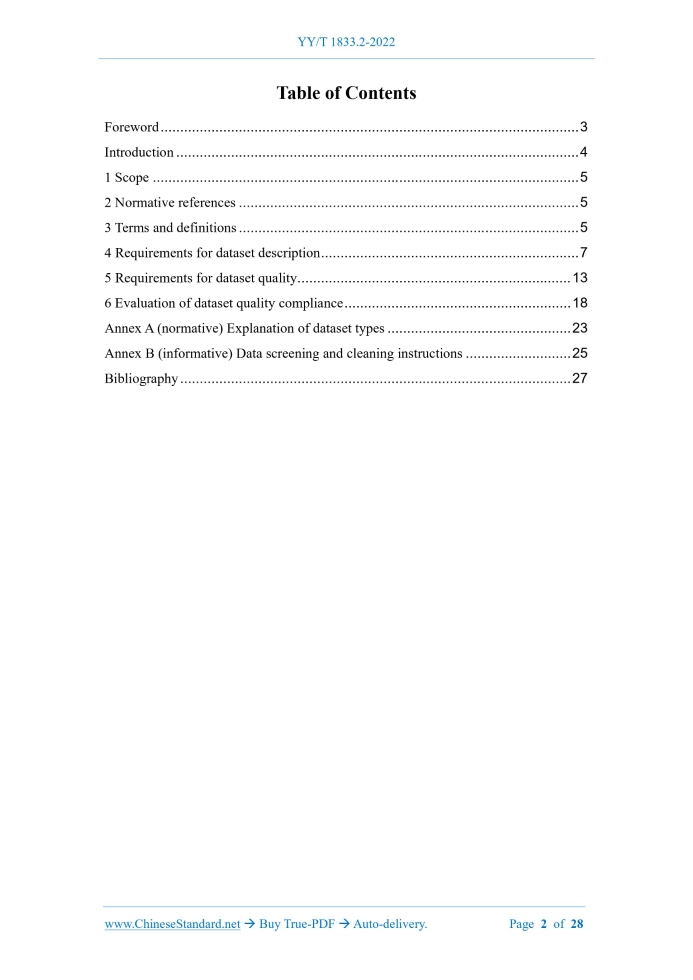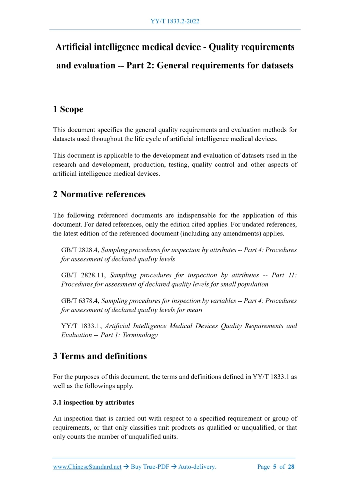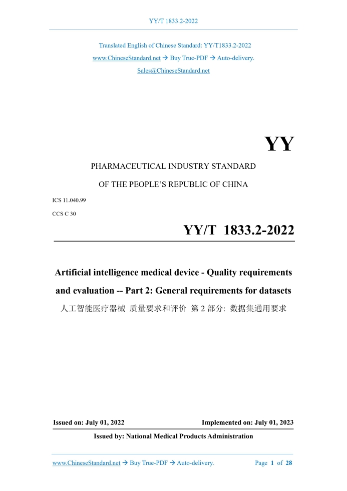 Similar standardsYY/T 1833.2-2022: Artificial intelligence medical device - Quality requirements and evaluation - Part 2: General requirements for datasets---This is an excerpt. Full copy of true-PDF in English version (including equations, symbols, images, flow-chart, tables, and figures etc.), auto-downloaded/delivered in 9 seconds, can be purchased online: https://www.ChineseStandard.net/PDF.aspx/YYT1833.2-2022 YY PHARMACEUTICAL INDUSTRY STANDARD ICS 11.040.99 CCS C 30 Artificial intelligence medical device - Quality requirements and evaluation -- Part 2.General requirements for datasets Issued on: JULY 01, 2022 Implemented on: JULY 01, 2023 Issued by. National Medical Products Administration Table of ContentsForeword... 3 Introduction... 4 1 Scope... 5 2 Normative references... 5 3 Terms and definitions... 5 4 Requirements for dataset description... 7 5 Requirements for dataset quality... 13 6 Evaluation of dataset quality compliance... 18 Annex A (normative) Explanation of dataset types... 23 Annex B (informative) Data screening and cleaning instructions... 25 Bibliography... 27 Artificial intelligence medical device - Quality requirements and evaluation -- Part 2.General requirements for datasets1 ScopeThis document specifies the general quality requirements and evaluation methods for datasets used throughout the life cycle of artificial intelligence medical devices. This document is applicable to the development and evaluation of datasets used in the research and development, production, testing, quality control and other aspects of artificial intelligence medical devices.2 Normative referencesThe following referenced documents are indispensable for the application of this document. For dated references, only the edition cited applies. For undated references, the latest edition of the referenced document (including any amendments) applies. GB/T 2828.4, Sampling procedures for inspection by attributes -- Part 4.Procedures for assessment of declared quality levels GB/T 2828.11, Sampling procedures for inspection by attributes -- Part 11. Procedures for assessment of declared quality levels for small population GB/T 6378.4, Sampling procedures for inspection by variables -- Part 4.Procedures for assessment of declared quality levels for mean YY/T 1833.1, Artificial Intelligence Medical Devices Quality Requirements and Evaluation -- Part 1.Terminology3 Terms and definitionsFor the purposes of this document, the terms and definitions defined in YY/T 1833.1 as well as the followings apply. 3.1 inspection by attributes An inspection that is carried out with respect to a specified requirement or group of requirements, or that only classifies unit products as qualified or unqualified, or that only counts the number of unqualified units. 4.1.2.1 Compliance statement The dataset description shall provide a compliance statement of the data source. 4.1.2.2 Privacy protection The dataset description shall describe the technical means used to protect the privacy of subjects, such as data de-identification, data anonymization, etc. When appropriate, the dataset description document shall describe the rules for data de-identification or data anonymization. 4.1.2.3 Diversity The dataset description shall provide a description of the diversity of data sources, such as population, collection location, collection equipment, parameter settings, operator qualifications, collection process, collection time, etc. 4.1.2.4 Principles of compliance for data collection The dataset description shall provide the regulations, technical standards, clinical specifications, expert consensus or other references on which the data were collected. 4.1.2.5 Data screening The dataset description shall describe the data entry and exclusion criteria, as well as the methods for data screening, such as manual cleaning and automatic cleaning. NOTE. See Annex B for examples. 4.1.3 Data preprocessing When appropriate, the dataset description shall describe the steps and content of data preprocessing. 4.1.4 Dataset annotation 4.1.4.1 Principles for dataset annotation If the dataset has annotation information, the dataset description shall describe the regulations, technical standards, clinical specifications, expert consensus or other references on which the dataset is annotated. 4.1.4.2 Reference standards If the dataset has annotation information, the dataset description shall describe the establishment rules, scope, storage format and data specifications of the dataset reference standard. If the reference standard is verifiable, the verification method of the reference standard shall be described. 4.1.4.3 Annotation process If the dataset has annotation information, the dataset description shall describe the data annotation and quality control process and clarify the decision-making mechanism. In the case of multiple annotations or multiple annotations, the arbitration mechanism for annotation differences shall be described. 4.1.4.4 Other annotation information If the dataset has annotation information, the dataset description shall describe the scope, data specifications and storage format of other annotation information in addition to the reference standard. 4.1.5 Dataset storage information The dataset description shall describe the data storage information, such as the dataset storage method and storage path, security control, backup, and recovery instructions. If the dataset is stored using cloud services, the cloud service provider name and qualifications, access path, and usage permission instructions shall be provided. 4.1.6 Dataset user access 4.1.6.1 Access control The dataset description shall describe the user access control mechanism, such as user type, permission allocation, and authorization mechanism. 4.1.6.2 Access conditions The dataset description shall describe the conditions required to access the dataset, such as software and hardware configuration, access method, data interface, protocol, tools, etc. 4.
