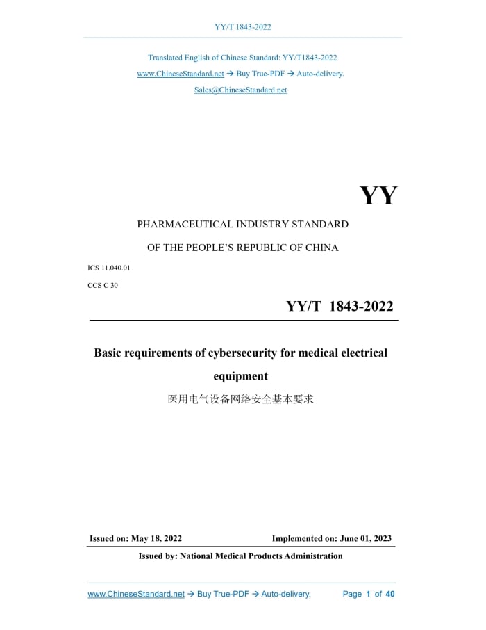YY/T 1843-2022: Basic requirements of cybersecurity for medical electrical equipment Delivery: 9 seconds. True-PDF full-copy in English & invoice will be downloaded + auto-delivered via email. See step-by-step procedure Status: Valid