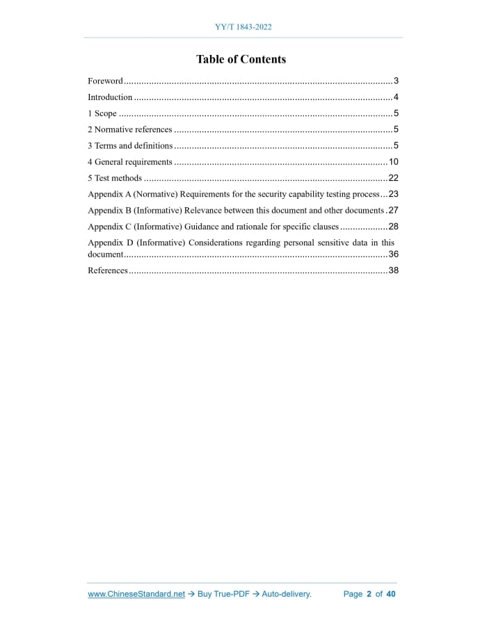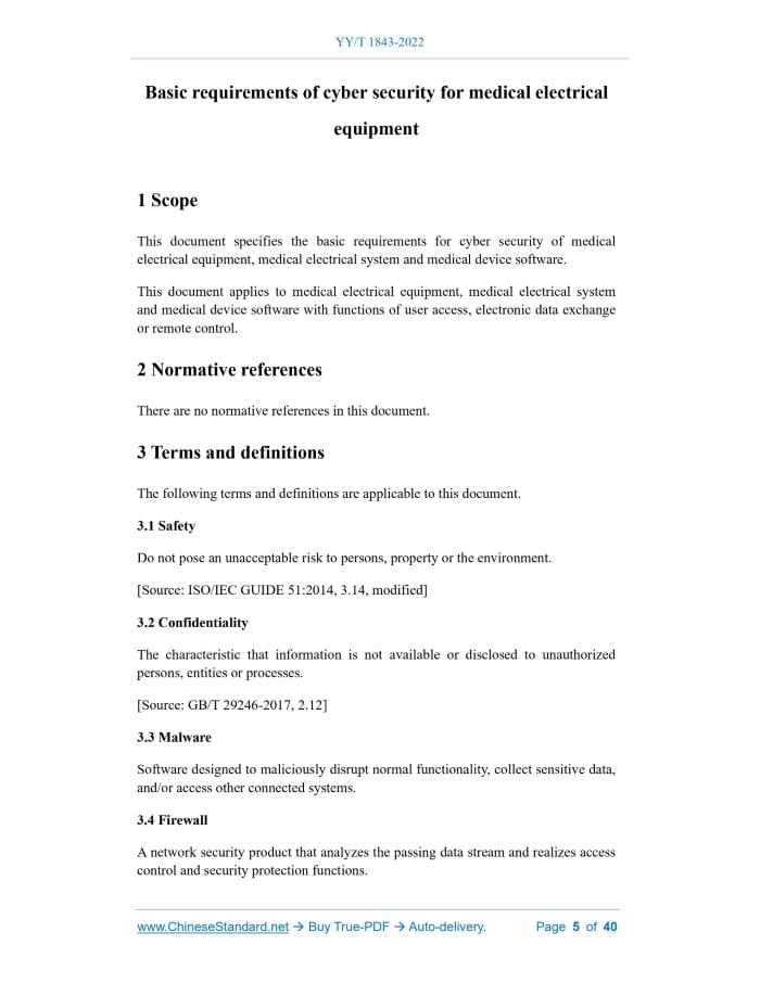 Similar standardsYY/T 1843-2022: Basic requirements of cybersecurity for medical electrical equipment---This is an excerpt. Full copy of true-PDF in English version (including equations, symbols, images, flow-chart, tables, and figures etc.), auto-downloaded/delivered in 9 seconds, can be purchased online: https://www.ChineseStandard.net/PDF.aspx/YYT1843-2022YY PHARMACEUTICAL INDUSTRY STANDARD ICS 11.040.01 CCS C 30 Basic requirements of cybersecurity for medical electrical equipment Issued on. MAY 18, 2022 Implemented on. JUNE 01, 2023 Issued by. National Medical Products Administration Table of ContentsForeword... 3 Introduction... 4 1 Scope... 5 2 Normative references... 5 3 Terms and definitions... 5 4 General requirements... 10 5 Test methods... 22 Appendix A (Normative) Requirements for the security capability testing process... 23 Appendix B (Informative) Relevance between this document and other documents. 27 Appendix C (Informative) Guidance and rationale for specific clauses... 28 Appendix D (Informative) Considerations regarding personal sensitive data in this document... 36 References... 38ForewordThis document was drafted in accordance with the rules given in GB/T 1.1-2020, Directives for standardization - Part 1.Rules for the structure and drafting of standardizing documents. Please note that some of the contents of this document may involve patents. The issuing organization of this document is not responsible for identifying patents. This document was proposed by National Medical Products Administration. This document shall be under the jurisdiction of National Technical Committee 10 on Medical Electrical Equipment of Standardization Administration of China (SAC/TC 10). Drafting organizations of this document. Shanghai Medical Device Testing Institute, National Drug Administration Medical Device Technology Evaluation Center, National Computer Network Emergency Response Technical Team/Coordination Center of China, China Institute of Food and Drug test, Jiangsu Medical Device Testing Institute, UL-CCIC Co., Ltd., Shenzhen Mindray Bio-Medical Electronics Co., Ltd., Neusoft Medical Systems Co., Ltd., Edan Instruments, Inc., BMC Medical Co., Ltd., Philips (China) Investment Co., Ltd., Siemens Shanghai Medical Equipment Ltd., GE Medical Systems Trade & Development (Shanghai) Co., Ltd., Medtronic (Shanghai) Management Co., Ltd. Chief drafting staffs of this document. Liu Chongsheng, Peng Liang, Xing Xiao, Wang Chenxi, Liu Ru, Zhang Bo, Tao Hua, Ma Ruibing, Chen Yongqiang, Chen Bei, Chen Dayu, Cao Jingtai, Qin Chuan, Xia Weijie.1 ScopeThis document specifies the basic requirements for cyber security of medical electrical equipment, medical electrical system and medical device software. This document applies to medical electrical equipment, medical electrical system and medical device software with functions of user access, electronic data exchange or remote control.2 Normative referencesThere are no normative references in this document.3 Terms and definitionsThe following terms and definitions are applicable to this document. 3.1 Safety Do not pose an unacceptable risk to persons, property or the environment. [Source. ISO/IEC GUIDE 51.2014, 3.14, modified] 3.2 Confidentiality The characteristic that information is not available or disclosed to unauthorized persons, entities or processes. [Source. GB/T 29246-2017, 2.12] 3.3 Malware Software designed to maliciously disrupt normal functionality, collect sensitive data, and/or access other connected systems. 3.4 Firewall A network security product that analyzes the passing data stream and realizes access control and security protection functions. 3.5 Risk The combination of the probability of occurrence of an injury and the severity of that injury. [Source. YY/T 0316-2016, 2.16] 3.6 Risk analysis The process of systematically using available information to identify hazard (sources) and estimate risks. [Source. YY/T 0316-2016, 2.17]4 General requirements4.1 *Security capability description 4.1.1 Identification and content 4.1.1.1 The security capability description shall reflect its document identification. 4.1.2 *Classification 4.1.2.1 According to the type of expected access network, it can be divided into products expected to access private network and public network. 4.1.3 Product feature description 4.1.3.1 The security capability description shall classify products according to 4.1.2. 4.1.3.2 The security capability description shall specify the intended use of the product. 4.1.3.3 The security capability description shall provide a list of all electronic interfaces of the product in its intended configuration, including. 4.1.3.5 The security capability description shall indicate the different configurations used in the product or the supported configurations. 4.1.4 Storage confidentiality The security capability description shall include a statement about the confidentiality of storage of sensitive data. 4.1.7 User access control The security capability description shall contain a statement of product user access control, including the user access control measures adopted and the details of such control measures. 4.1.18 Accountability The security capability description shall include a statement about the product’s accountability content and its means. 4.1.20 Maintainability 4.1.20.1 The security capability description shall include the maintenance content related to cyber security in the product maintenance plan, and specify the responsible organization for cyber security maintenance. 4.2 Requirements for user documentation set 4.2.1 Identification and content 4.2.1.1 The user documentation set shall reflect its unique document identification. 4.2.1.2 The user documentation set shall be able to identify the identification of the corresponding product. 4.2.2 Management functions If the product is deployed in an HDO, the user documentation set shall clarify the user’s administrative functions, especially the responsibilities