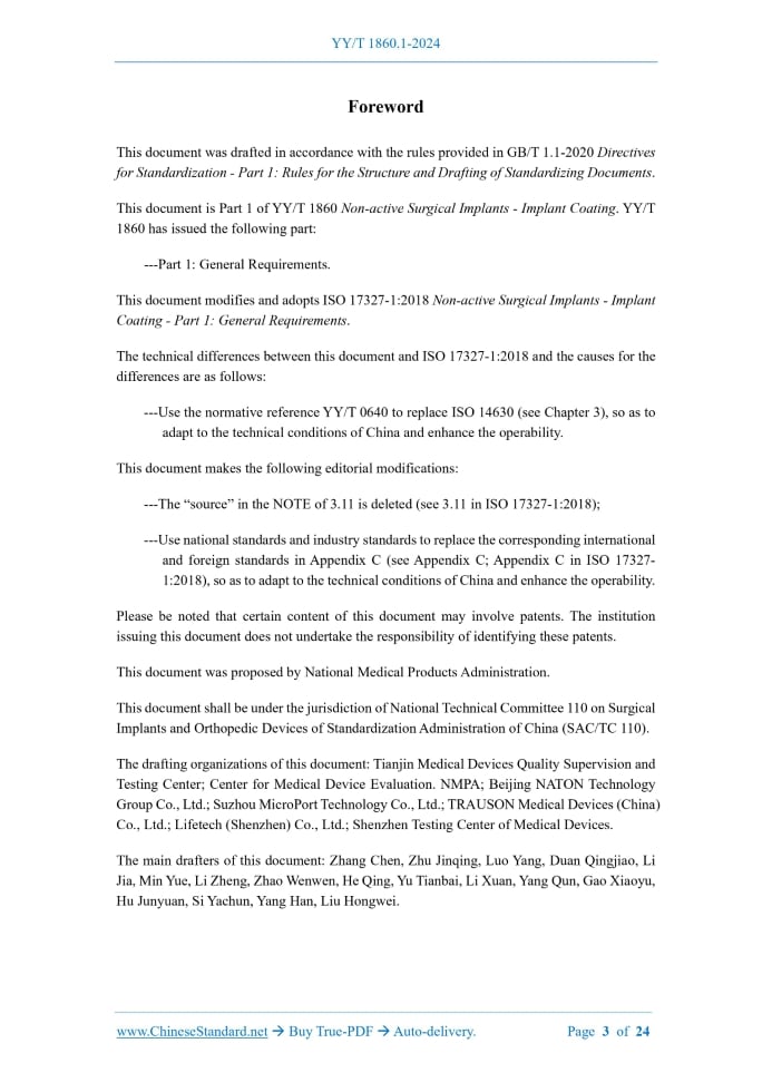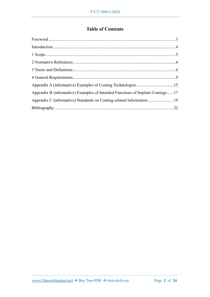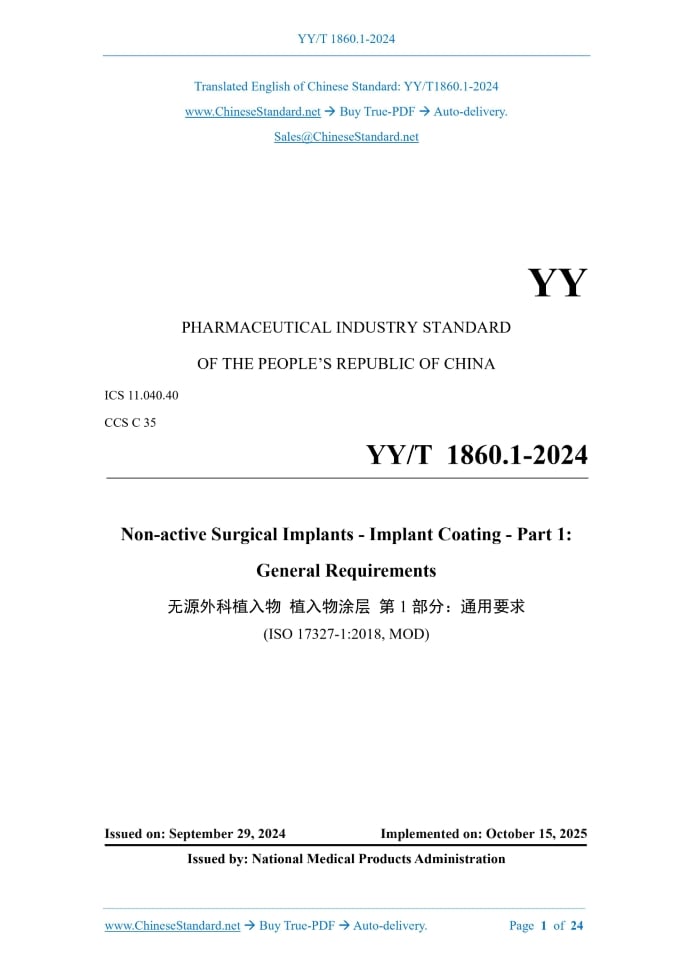 YY/T 1860.1-2024: Non-active surgical implants - Implant coating - Part 1: General requirements---This is an excerpt. Full copy of true-PDF in English version (including equations, symbols, images, flow-chart, tables, and figures etc.), auto-downloaded/delivered in 9 seconds, can be purchased online: https://www.ChineseStandard.net/PDF.aspx/YYT1860.1-2024YY PHARMACEUTICAL INDUSTRY STANDARD ICS 11.040.40 CCS C 35 Non-active Surgical Implants - Implant Coating - Part 1. General Requirements (ISO 17327-1.2018, MOD) Issued on: SEPTEMBER 29, 2024 Implemented on: OCTOBER 15, 2025 Issued by. National Medical Products Administration Table of ContentsForeword... 3 Introduction... 4 1 Scope... 5 2 Normative References... 6 3 Terms and Definitions... 6 4 General Requirements... 9 Appendix A (informative) Examples of Coating Technologies... 15 Appendix B (informative) Examples of Intended Functions of Implant Coatings... 17 Appendix C (informative) Standards on Coating-related Information... 19 Bibliography... 22ForewordThis document was drafted in accordance with the rules provided in GB/T 1.1-2020 Directives for Standardization - Part 1.Rules for the Structure and Drafting of Standardizing Documents. This document is Part 1 of YY/T 1860 Non-active Surgical Implants - Implant Coating. YY/T 1860 has issued the following part. ---Part 1.General Requirements. This document modifies and adopts ISO 17327-1.2018 Non-active Surgical Implants - Implant Coating - Part 1.General Requirements. The technical differences between this document and ISO 17327-1.2018 and the causes for the differences are as follows. ---Use the normative reference YY/T 0640 to replace ISO 14630 (see Chapter 3), so as to adapt to the technical conditions of China and enhance the operability. This document makes the following editorial modifications. ---The “source” in the NOTE of 3.11 is deleted (see 3.11 in ISO 17327-1.2018); ---Use national standards and industry standards to replace the corresponding international and foreign standards in Appendix C (see Appendix C; Appendix C in ISO 17327- 1.2018), so as to adapt to the technical conditions of China and enhance the operability. Please be noted that certain content of this document may involve patents. The institution issuing this document does not undertake the responsibility of identifying these patents. This document was proposed by National Medical Products Administration. This document shall be under the jurisdiction of National Technical Committee 110 on Surgical Implants and Orthopedic Devices of Standardization Administration of China (SAC/TC 110). The drafting organizations of this document. Tianjin Medical Devices Quality Supervision and Testing Center; Center for Medical Device Evaluation. NMPA; Beijing NATON Technology Group Co., Ltd.; Suzhou MicroPort Technology Co., Ltd.; TRAUSON Medical Devices (China) Co., Ltd.; Lifetech (Shenzhen) Co., Ltd.; Shenzhen Testing Center of Medical Devices. The main drafters of this document. Zhang Chen, Zhu Jinqing, Luo Yang, Duan Qingjiao, Li Jia, Min Yue, Li Zheng, Zhao Wenwen, He Qing, Yu Tianbai, Li Xuan, Yang Qun, Gao Xiaoyu, Hu Junyuan, Si Yachun, Yang Han, Liu Hongwei. Non-active Surgical Implants - Implant Coating - Part 1. General Requirements1 ScopeThis document specifies the general requirements for implant coatings, including surface coatings and surface modification, used for non-active surgical implants. This document specifies the requirements related to generic coating properties, including chemical composition and phase composition, surface texture, coating coverage integrity, dissolvability, coating thickness, adhesion strength, abrasion resistance, porosity and pore size, and surface wettability. This document applies to surface coatings, which are defined as layers of material intentionally added to a substrate that have any properties different from those of the substrate’s natural surface. This document applies to surface modification, which is the intentional transformation or re- construction of the surface of the original substrate to form a new surface material composed of the substrate’s own material and possible foreign materials, and to form a surface layer with different properties. Since the correlated characteristics of the coatings and the required level of characterization depend largely on the intended application of the implant, the generic properties of the general requirements in this document are not intended to override or replace the provisions of specific application property standards. This document does not apply to structurally modified surfaces with the sole purpose of changing the surface roughness or raw material strength. This document does not apply to naturally passivated metal surfaces. Although this document applies to intentionally passivated metal surfaces, mature materials passivated by conventional techniques (e.g. nitric acid impregnation) are generally non-hazardous and can be described in a very basic mode. This document does not apply to coatings for implants that use living tissues. This document does not apply to laminated boards, i.e. multi-layer composites, for example, artificial blood vessels composed of different expanded polytetrafluoroethylene layers, but the exposed surface of the laminated boards can be an implant coating (see 3.1, NOTE 2). This document does not apply to coverings, for example, stent grafts. NOTE 1.this document does not contain biocompatibility requirements. However, this is a key characteristic of devices and coatings and needs to be addressed during risk assessment. NOTE 2.this document is complementary to the applicable standards on non-active surgical implants and YY/T 0640. NOTE 3.this document does not require the manufacturer to establish a quality management system. However, the application of a quality management system, for example, the one described in ISO 13485, can help ensure that the implants perform as expected. NOTE 4.al