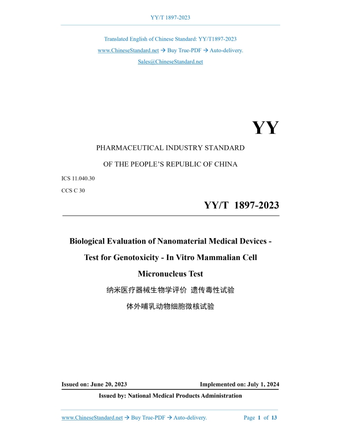 YY/T 1897-2023: Biological evaluation of nanomedical devices Genotoxicity test In vitro mammalian cell micronucleus test Delivery: 9 seconds. True-PDF full-copy in English & invoice will be downloaded + auto-delivered via email. See step-by-step procedure Status: Valid