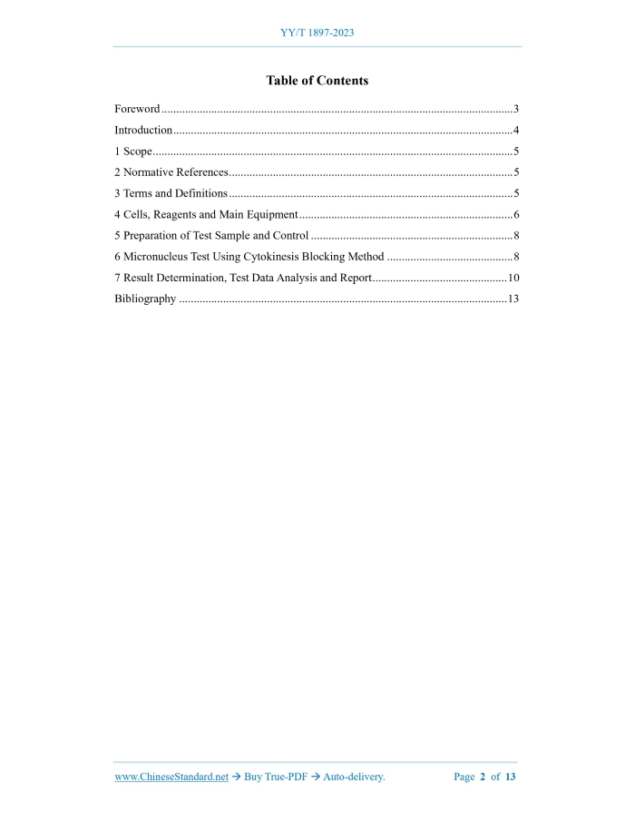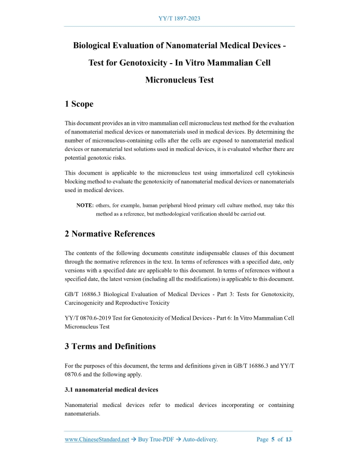 YY/T 1897-2023: Biological evaluation of nanomedical devices Genotoxicity test In vitro mammalian cell micronucleus test---This is an excerpt. Full copy of true-PDF in English version (including equations, symbols, images, flow-chart, tables, and figures etc.), auto-downloaded/delivered in 9 seconds, can be purchased online: https://www.ChineseStandard.net/PDF.aspx/YYT1897-2023 YY PHARMACEUTICAL INDUSTRY STANDARD OF THE PEOPLE’S REPUBLIC OF CHINA ICS 11.040.30 CCS C 30 Biological Evaluation of Nanomaterial Medical Devices - Test for Genotoxicity - In Vitro Mammalian Cell Micronucleus Test ISSUED ON: JUNE 20, 2023 IMPLEMENTED ON: JULY 1, 2024 Issued by: National Medical Products Administration Table of ContentsForeword ... 3 Introduction ... 4 1 Scope ... 5 2 Normative References ... 5 3 Terms and Definitions ... 5 4 Cells, Reagents and Main Equipment ... 6 5 Preparation of Test Sample and Control ... 8 6 Micronucleus Test Using Cytokinesis Blocking Method ... 8 7 Result Determination, Test Data Analysis and Report ... 10 Bibliography ... 13 Biological Evaluation of Nanomaterial Medical Devices - Test for Genotoxicity - In Vitro Mammalian Cell Micronucleus Test1 ScopeThis document provides an in vitro mammalian cell micronucleus test method for the evaluation of nanomaterial medical devices or nanomaterials used in medical devices. By determining the number of micronucleus-containing cells after the cells are exposed to nanomaterial medical devices or nanomaterial test solutions used in medical devices, it is evaluated whether there are potential genotoxic risks. This document is applicable to the micronucleus test using immortalized cell cytokinesis blocking method to evaluate the genotoxicity of nanomaterial medical devices or nanomaterials used in medical devices. NOTE: others, for example, human peripheral blood primary cell culture method, may take this method as a reference, but methodological verification should be carried out.2 Normative ReferencesThe contents of the following documents constitute indispensable clauses of this document through the normative references in the text. In terms of references with a specified date, only versions with a specified date are applicable to this document. In terms of references without a specified date, the latest version (including all the modifications) is applicable to this document. GB/T 16886.3 Biological Evaluation of Medical Devices - Part 3: Tests for Genotoxicity, Carcinogenicity and Reproductive Toxicity YY/T 0870.6-2019 Test for Genotoxicity of Medical Devices - Part 6: In Vitro Mammalian Cell Micronucleus Test3 Terms and DefinitionsFor the purposes of this document, the terms and definitions given in GB/T 16886.3 and YY/T 0870.6 and the following apply. 3.1 nanomaterial medical devices Nanomaterial medical devices refer to medical devices incorporating or containing nanomaterials. [source: YY/T 0993-2015, 3.1.2, modified] 3.2 positive control Positive control means reproducible positive results can be obtained in the test system when materials and / or substances (including positive control reagents and positive control materials) are thoroughly characterized and proven for use in in vitro micronucleus test. [source: GB/T 16886.12-2017, 3.12, modified] 3.3 negative control Negative control means reproducible negative results can be obtained in the test system when materials and / or substances (including medium negative control and negative control materials) are thoroughly characterized and proven for use in in vitro micronucleus test. NOTE: the leaching medium or release medium of the test sample can be used as a medium negative control; polystyrene nanospheres can be used as a negative control material. [source: GB/T 16886.12-2017, 3.11, modified] 3.4 test sample Test Sample refers to a test solution of nanomaterial medical devices or nanomaterials used in medical devices.4 Cells, Reagents and Main Equipment4.1 Cells Chinese hamster lung cell line (CHL), Chinese hamster ovary cell (CHO) and Chinese hamster lung cell line (V79) have stable karyotypes and have accumulated a large amount of background data. They are routine in vitro micronucleus test cell lines. However, due to defects in the function of the p53 gene in rodent cells, the repair function after DNA damage is reduced, resulting in a relatively high false positive rate in in vitro micronucleus tests based on CHL, CHO and V79. In order to avoid false positive results, the human lymphocyte cell line (TK6) with intact p53 gene function can also be used in the in vitro micronucleus test. The ability of cells to uptake nanomaterials is the key to examining whether nanomaterials are thoroughly exposed to the cell test system. Appropriate techniques should be used to verify that the cell line used has a certain ability to uptake the test sample (nanomaterials contained) under the conditions of this test. NOTE: when selecting the cell line, nanomaterials with different properties and physicochemical characterization are recommended to provide evidence that the nanomaterials can be taken up by the cells. CHL and TK6 cells have been confirmed to have the ability to uptake silver nanoparticles (Ag40).5 Preparation of Test Sample and ControlThe preparation of test sample and control is as follows: a) Nanomaterial medical devices: refer to YY/T 0870.6-2019, and in combination with the release characteristics and usage mode of nanomaterials in nanomaterial medical devices, prepare the test sample; NOTE 1: it is recommended to simultaneously use nanomaterial raw materials for evaluation, and refer to 5 b) for preparation. NOTE 2: in order to ensure that the state of nanomaterials in the biological and physical environment in the in vitro test system is comparable to the state during in vivo application, the existing methods can be used to characterize the nanomaterials in the cell culture medium before the test sample is exposed to the cells (leaching solution) and after the test 