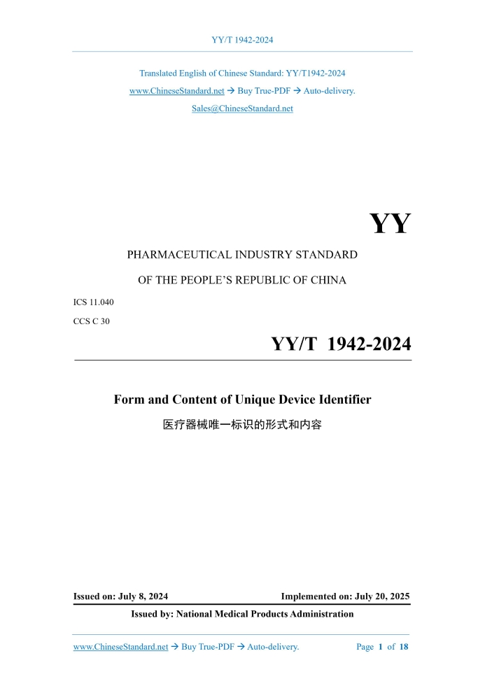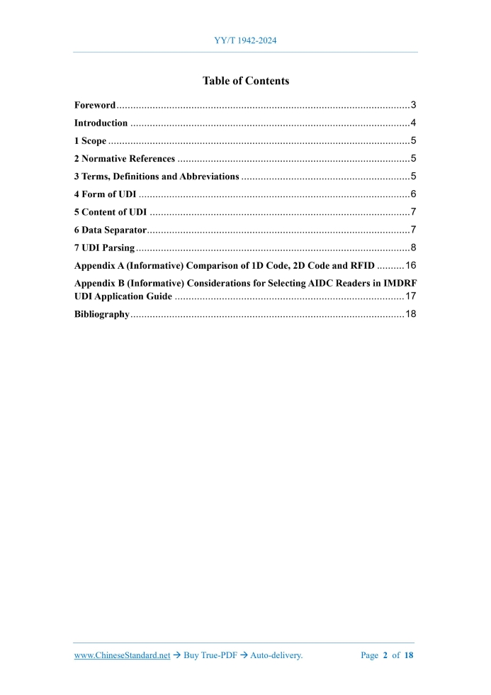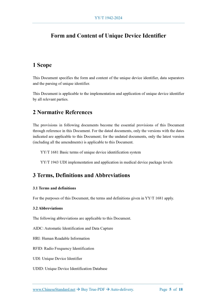 YY/T 1942-2024: Form and content of the unique device identifier---This is an excerpt. Full copy of true-PDF in English version (including equations, symbols, images, flow-chart, tables, and figures etc.), auto-downloaded/delivered in 9 seconds, can be purchased online: https://www.ChineseStandard.net/PDF.aspx/YYT1942-2024YY PHARMACEUTICAL INDUSTRY STANDARD OF THE PEOPLE’S REPUBLIC OF CHINA ICS 11.040 CCS C 30 Form and Content of Unique Device Identifier ISSUED ON: JULY 8, 2024 IMPLEMENTED ON: JULY 20, 2025 Issued by: National Medical Products Administration Table of ContentsForeword ... 3 Introduction ... 4 1 Scope ... 5 2 Normative References ... 5 3 Terms, Definitions and Abbreviations ... 5 4 Form of UDI ... 6 5 Content of UDI ... 7 6 Data Separator ... 7 7 UDI Parsing ... 8 Appendix A (Informative) Comparison of 1D Code, 2D Code and RFID ... 16 Appendix B (Informative) Considerations for Selecting AIDC Readers in IMDRF UDI Application Guide ... 17 Bibliography ... 18 Form and Content of Unique Device Identifier1 ScopeThis Document specifies the form and content of the unique device identifier, data separators and the parsing of unique identifier. This Document is applicable to the implementation and application of unique device identifier by all relevant parties.2 Normative ReferencesThe provisions in following documents become the essential provisions of this Document through reference in this Document. For the dated documents, only the versions with the dates indicated are applicable to this Document; for the undated documents, only the latest version (including all the amendments) is applicable to this Document. YY/T 1681 Basic terms of unique device identification system YY/T 1943 UDI implementation and application in medical device package levels3 Terms, Definitions and Abbreviations3.1 Terms and definitions For the purposes of this Document, the terms and definitions given in YY/T 1681 apply. 3.2 Abbreviations The following abbreviations are applicable to this Document. AIDC: Automatic Identification and Data Capture HRI: Human Readable Information RFID: Radio Frequency Identification UDI: Unique Device Identifier UDID: Unique Device Identification Database 4.2.4 Manufacturers should consider guiding the AIDC carrier containing the UDI in an appropriate manner, such as using the UDI graphic symbol in Clause 5 d) of YY/T 1879-2022. 4.2.5 A comparison of the three common AIDC forms, 1D code, 2D code and RFID, is shown in Appendix A. For the selection of AIDC readers, please refer to the considerations for selecting AIDC readers in the IMDRF UDI application guide, see Appendix B. 4.3 HRI 4.3.1 HRI enables medical staff, patients, regulatory agencies and other users of the UDI system to read UDIs without technical assistance and enter them into data systems (such as medical records or reports submitted to regulatory agencies). It should serve as an additional mechanism for collecting UDIs when the AIDC carrier form cannot be read. 4.3.2 HRI shall contain UDI-DI and UDI-PI parts, as well as corresponding data separators. 4.3.3 HRI can be displayed as single-line or multi-line text. Single data fields (data separators and their defined information fields) shall not wrap and shall be displayed below or near the AIDC. 4.3.4 The form of HRI shall meet the coding rules of the code-issuing agency.5 Content of UDI5.1 The content of UDI in this Document refers to the data information contained in UDI and its corresponding HRI and AIDC forms. 5.2 UDI includes UDI-DI and UDI-PI, among which the production batch number, serial number, production date, expiration date, and version number of independent software belong to UDI-PI. If otherwise specified by national laws and regulations and standards, they shall prevail. 5.3 It is not recommended that manufacturers add other content other than UDI information (UDI-DI and UDI-PI), such as quantity, to the UDI data carrier. If it is necessary to add, it shall comply with relevant laws and regulations and the relevant rules and requirements of the code- issuing agency; and its data separator shall be distinguished from the data separators of UDI- DI and UDI-PI. 5.4 The order of data in the data carrier shall follow the rule that UDI-DI is placed before UDI- PI and UDI-PI is placed before other content.6 Data Separator6.1 Data separators are characters or character sets that define specific data information and are used to identify specific data information content in the encoded data string. A – product identifier; B – product name; C – specification and model; D – registration certificate No.; E – registered/recorded by; F – production batch number; G – production date; H – expiration date; I – unit; J – quantity; K – syringe; L – GXZZ. NOTE 1: In this method, it needs to manually enter the UDI-PI field and complete UDI information. NOTE 2: Other required content shall be filled in the corresponding link according to the needs. Figure 4 – A diagram of using HRI method to obtain relevant information in UDID by searching and selecting UDI-DI d) According to the rules and formats of the involved code-issuing agencies, parse the UDI into UDI-DI and the corresponding UDI-PI; and fill in the corresponding fields of the system, respectively. NOTE 3: For other contents in the data carrier (if any), parse and record them according to the definitions provided in 6.3 as needed. e) Perform necessary information correctness checks according to the rules of the code-issuing agency, and prompt any found errors. f) Perform UDID association search and data information extraction through UDI-DI online or local storage. If through local storage, consider docking with UDID to obtain version update information. g) According to YY/T 1943, establish the conversion relationship of UDI-DI identification quantity for different product packaging levels.Appendix B(Informative) Considerations for Selecting AIDC Readers in IMDRF UDI Application Guide