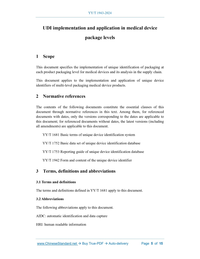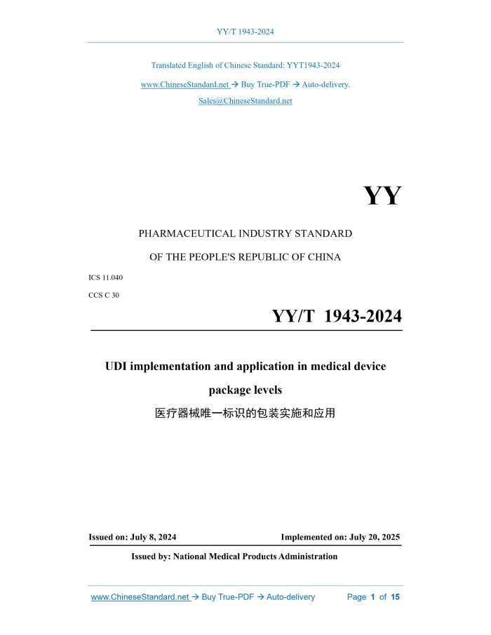 YY/T 1943-2024: UDI implementation and application in medical device package levels Delivery: 9 seconds. True-PDF full-copy in English & invoice will be downloaded + auto-delivered via email. See step-by-step procedure Status: Valid
