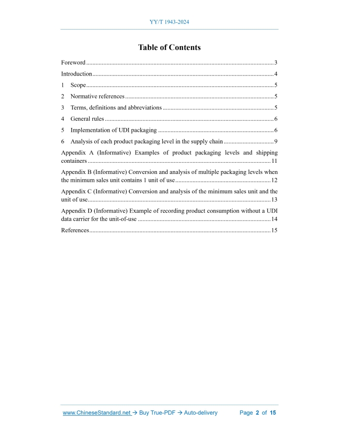 YY/T 1943-2024: UDI implementation and application in medical device package levels---This is an excerpt. Full copy of true-PDF in English version (including equations, symbols, images, flow-chart, tables, and figures etc.), auto-downloaded/delivered in 9 seconds, can be purchased online: https://www.ChineseStandard.net/PDF.aspx/YYT1943-2024YY PHARMACEUTICAL INDUSTRY STANDARD OF THE PEOPLE'S REPUBLIC OF CHINA ICS 11.040 CCS C 30 UDI implementation and application in medical device package levels Issued on: JULY 8, 2024 Implemented on: JULY 20, 2025 Issued by. National Medical Products Administration Table of ContentsForeword... 3 Introduction... 4 1 Scope... 5 2 Normative references... 5 3 Terms, definitions and abbreviations... 5 4 General rules... 6 5 Implementation of UDI packaging... 6 6 Analysis of each product packaging level in the supply chain... 9 Appendix A (Informative) Examples of product packaging levels and shipping containers... 11 Appendix B (Informative) Conversion and analysis of multiple packaging levels when the minimum sales unit contains 1 unit of use... 12 Appendix C (Informative) Conversion and analysis of the minimum sales unit and the unit of use... 13 Appendix D (Informative) Example of recording product consumption without a UDI data carrier for the unit-of-use... 14 References... 15 UDI implementation and application in medical device package levels1 ScopeThis document specifies the implementation of unique identification of packaging at each product packaging level for medical devices and its analysis in the supply chain. This document applies to the implementation and application of unique device identifiers of multi-level packaging medical device products.2 Normative referencesThe contents of the following documents constitute the essential clauses of this document through normative references in this text. Among them, for referenced documents with dates, only the versions corresponding to the dates are applicable to this document; for referenced documents without dates, the latest versions (including all amendments) are applicable to this document. YY/T 1681 Basic terms of unique device identification system YY/T 1752 Basic data set of unique device identification database YY/T 1753 Reporting guide of unique device identification database YY/T 1942 Form and content of the unique device identifier3 Terms, definitions and abbreviations3.1 Terms and definitions The terms and definitions defined in YY/T 1681 apply to this document. 3.2 Abbreviations The following abbreviations apply to this document. AIDC. automatic identification and data capture HRI. human readable information UDI. unique device identifier UDID. unique device identification database UDI-DI. device identifier UDI-PI. production identifier UoU UDI-DI. unit of use device identifier4 General rules4.1 The packaging in this document refers to the product packaging level where the products contained therein have the same minimum sales unit UDI-DI and production batch number. NOTE. A product packaging level contains a fixed number of medical devices. 4.2 Product packaging levels do not include shipping containers. Examples of product packaging levels and shipping containers are shown in Appendix A. NOTE. From a traceability perspective, the shipping container itself is traceable in the logistics system without the need for UDI. 4.3 The composition of UDI-PI for different packaging levels of medical devices of the same specification and model should be consistent. 4.4 New packaging configurations shall be assigned a new UDI-DI. 4.5 When a product has multiple product packaging levels, a packaging identifier (if applicable) should be used to distinguish different levels of packaging. The compilation of the packaging identifier shall comply with the rules of the coding agency.5 Implementation of UDI packaging5.1 The minimum sales unit contains 1 unit of use When the minimum sales unit of a medical device contains 1 unit of use and the higher- level packaging has only a unique packaging quantity form, the minimum sales unit of the medical device and the higher-level packaging should be assigned UDI-DI and given a unique identifier data carrier. In UDID, the information corresponding to the minimum sales unit shall be uploaded to UDID and linked to the highest level of packaging layer by layer in accordance with the requirements of YY/T 1752 and YY/T 1753.The different product packaging levels with a single packaging quantity and their association in the UDID are shown in Table 1. the minimum sales unit in accordance with the relevant requirements of YY/T 1942; d) The UDI information recorded in the information systems of all parties in the supply chain shall be consistent with the product UDI; e) Since UDIs of different product packaging levels may be scanned during warehousing and consumption, the warehousing, consumption, and inventory quantities shall be balanced after conversion; f) Establish records containing UDI information in accordance with laws, regulations and related document requirements to ensure traceability. Examples of conversion and analysis of packaging in this case are given in Appendix B. 6.2 The minimum sales unit contains multiple units of use When management at the unit-of-use level is required, the analysis of each level of UDI packaging is based on 6.1, and usually the following shall also be considered. a) Establish the quantity conversion relationship between the unit-of-use of a medical device and the minimum sales unit in the information systems of all parties in the supply chain; b) After the minimum sales unit of a medical device is opened and becomes the unit-of-use of a medical device, the quantity of the unit-of-use is obtained according to the conversion relationship, and the unit conversion is performed, see Appendix C; c) When the unit-of-use of a medical device is consumed, the UDI-PI of its corresponding minimum sales unit shall be recorded; d) In the case of a u